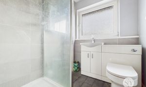 Laminate flooring, three piece in white comprising of wc, basin and mains fed shower enclosure, frosted double glazed uPVC windows, towel radiator.