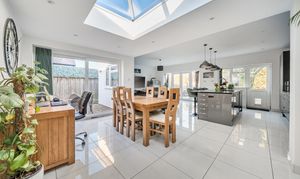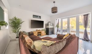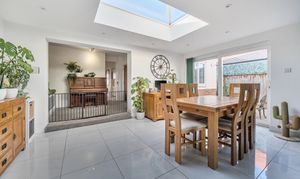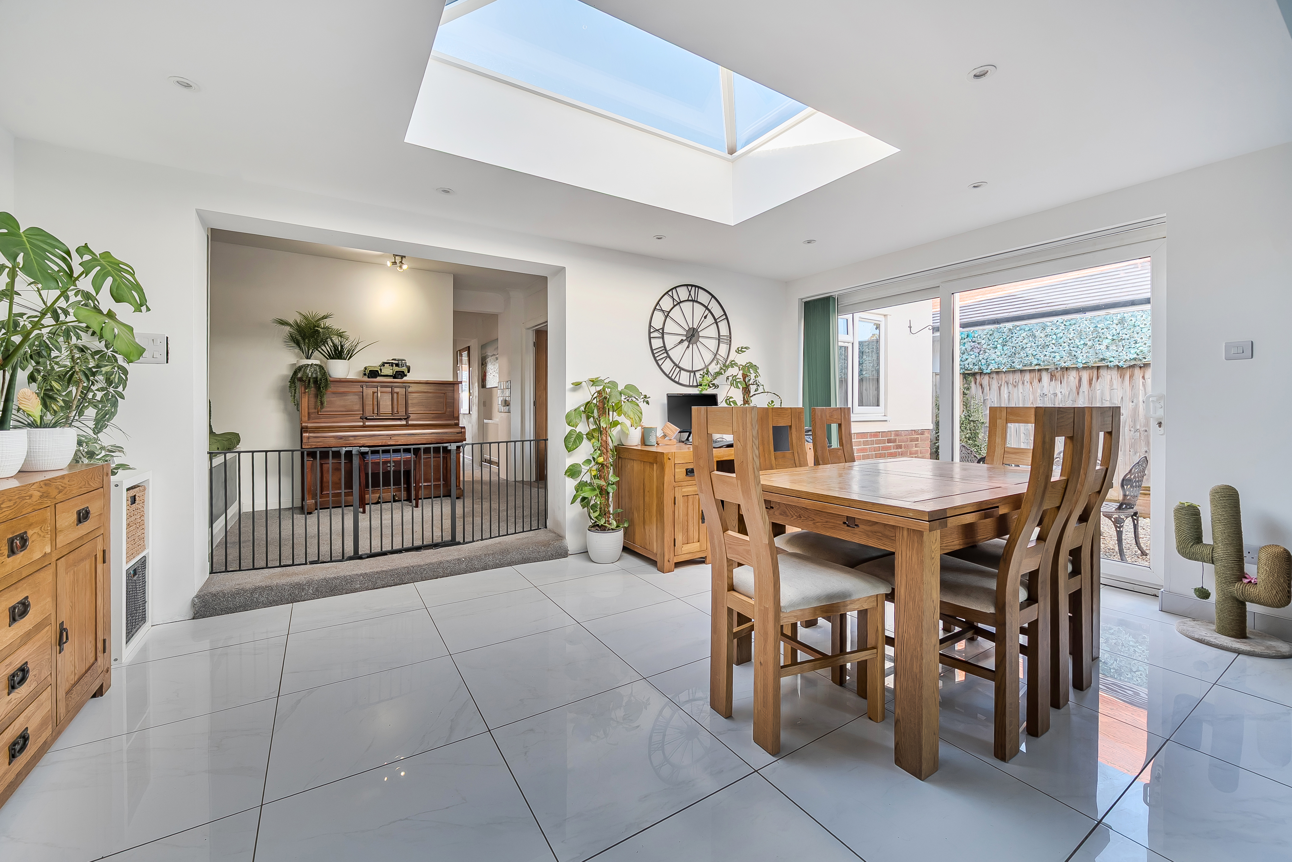 Natural light pours in via a skylight and three access points to the garden: large sliding doors to one side, French doors at the rear, and an additional rear door. The seamless transition between inside and out makes this an ideal space for entertaining or simply enjoying fresh air. Practical tiled flooring runs throughout, perfect for families with children or pets.