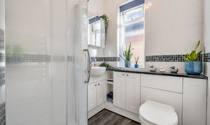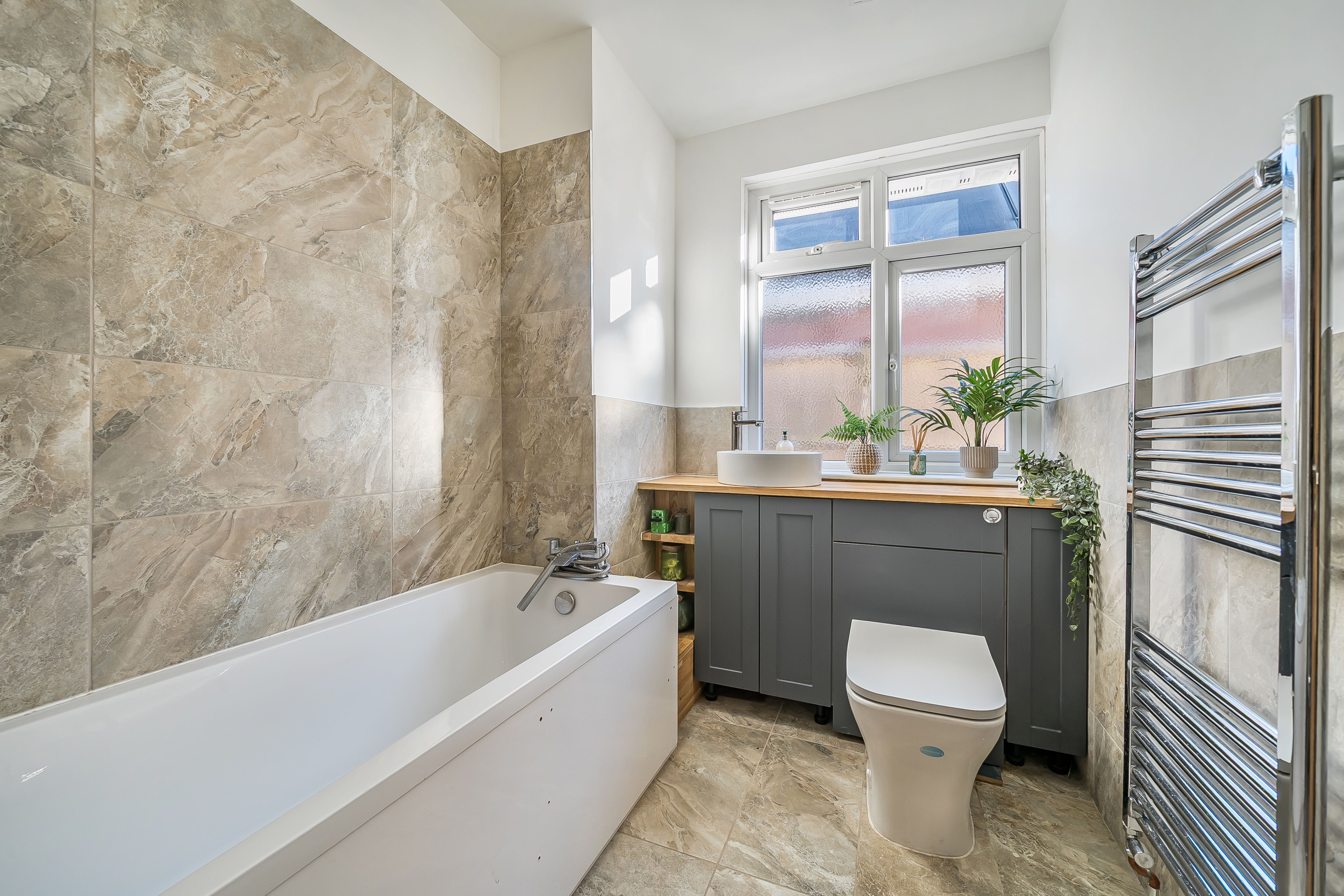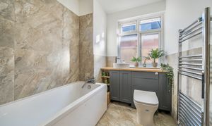 Two modern bathrooms mean no queues in the morning. The first is fitted with a fully enclosed shower, a combination vanity unit with integrated sink and toilet, finished with full tiling and a chrome heated towel rail. The second bathroom is just as smart, with a full-sized bath, another vanity unit, part-tiled walls and a matching heated towel rail, making both bathrooms not only stylish but practical for a busy household.