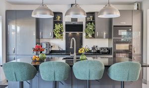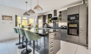 At the heart of the home is the standout open-plan kitchen, dining and living area—a bright, stylish and highly sociable space enhanced by underfloor heating. The contemporary kitchen boasts sleek units, granite worktops and a central island with an integrated sink and statement P-shaped mixer tap. Quality built-in appliances include a double oven, electric hob with extractor, integrated fridge freezer, microwave and dishwasher.