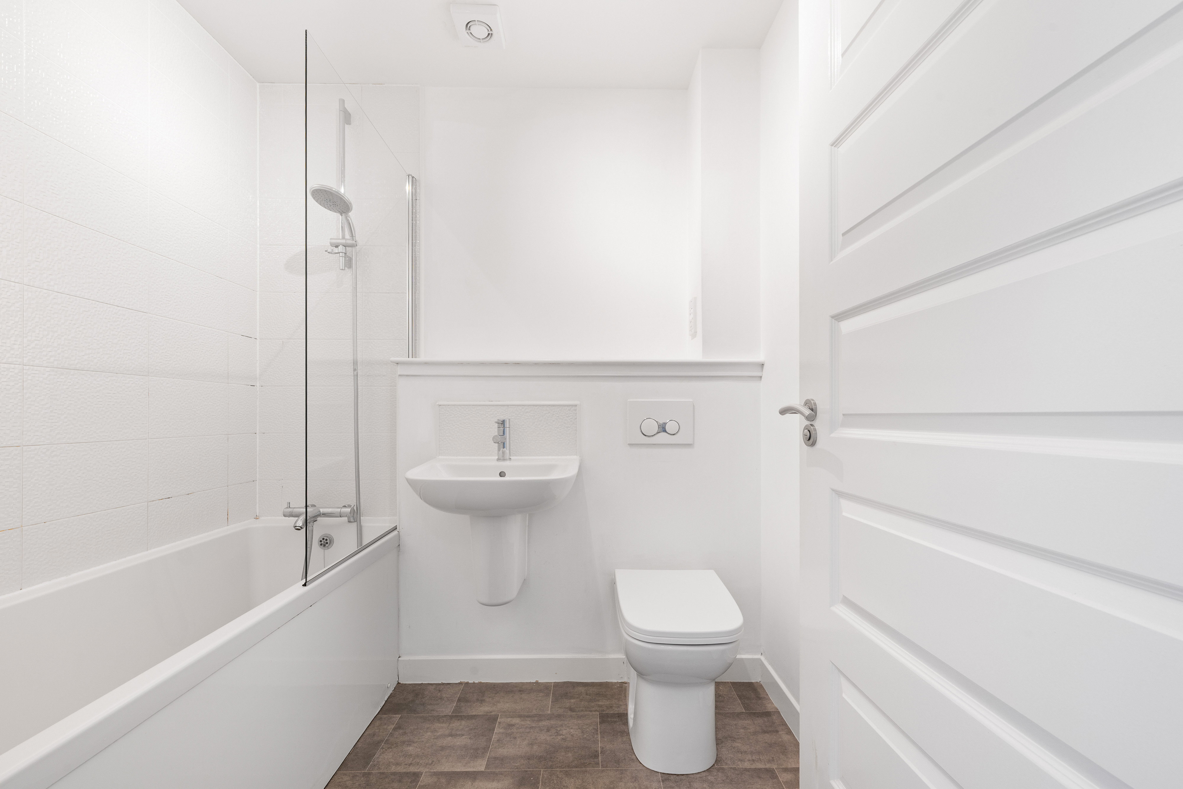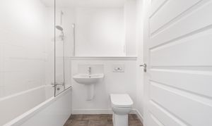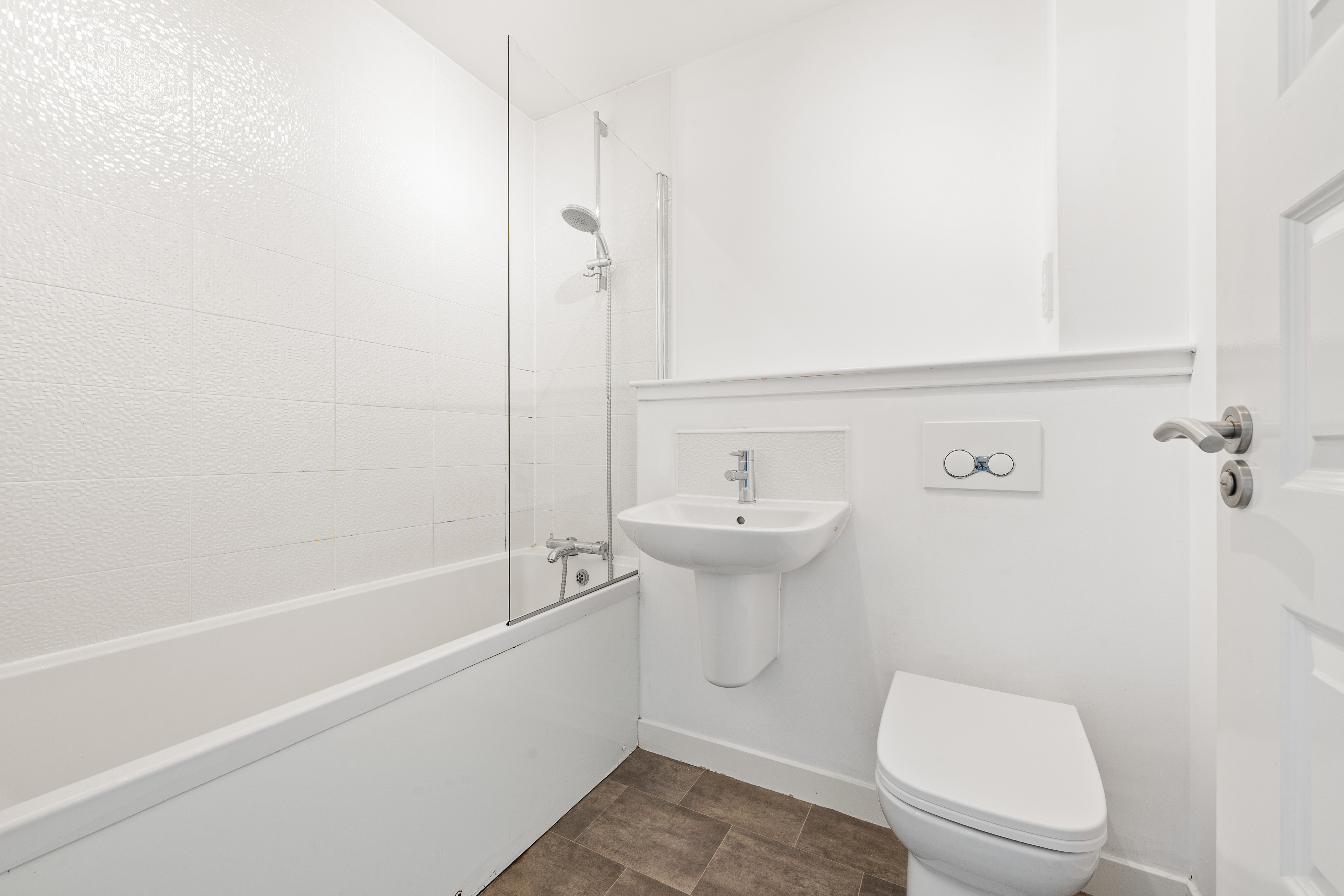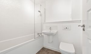 At the top of the stairs, directly in front of you, is the family bathroom. This is fitted with a three piece suite including a bath with shower overhead, wash hand basin and WC, finished in neutral tones with white tiling, clean, modern and ready to use.