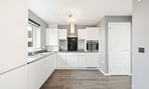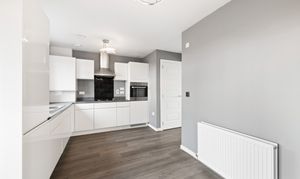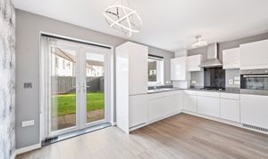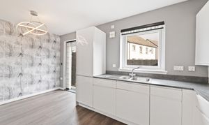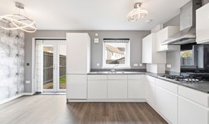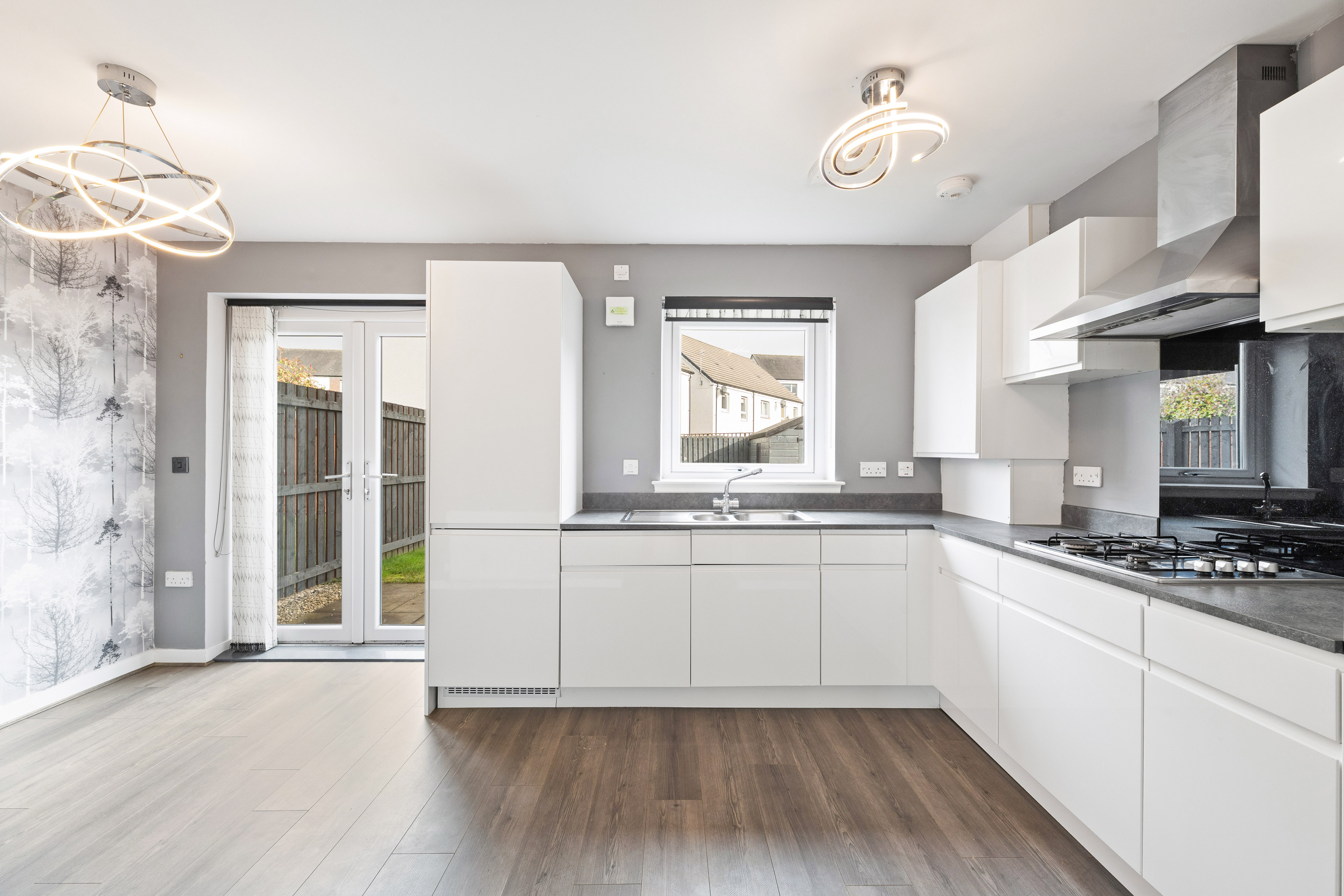 Continue through and you step into the kitchen diner, which really feels like the heart of the home. The kitchen is fitted with sleek white gloss cabinetry, paired with contrasting dark worktops for a modern finish. You have an integrated fridge freezer, a built in oven, a four ring gas hob with stainless steel extractor hood above, and plenty of workspace. A window above the sink allows natural light to pour in, and there’s ample room here for a dining table, making it a great space for family meals or hosting friends. There’s also an additional storage cupboard within the kitchen, offering even more practical space.