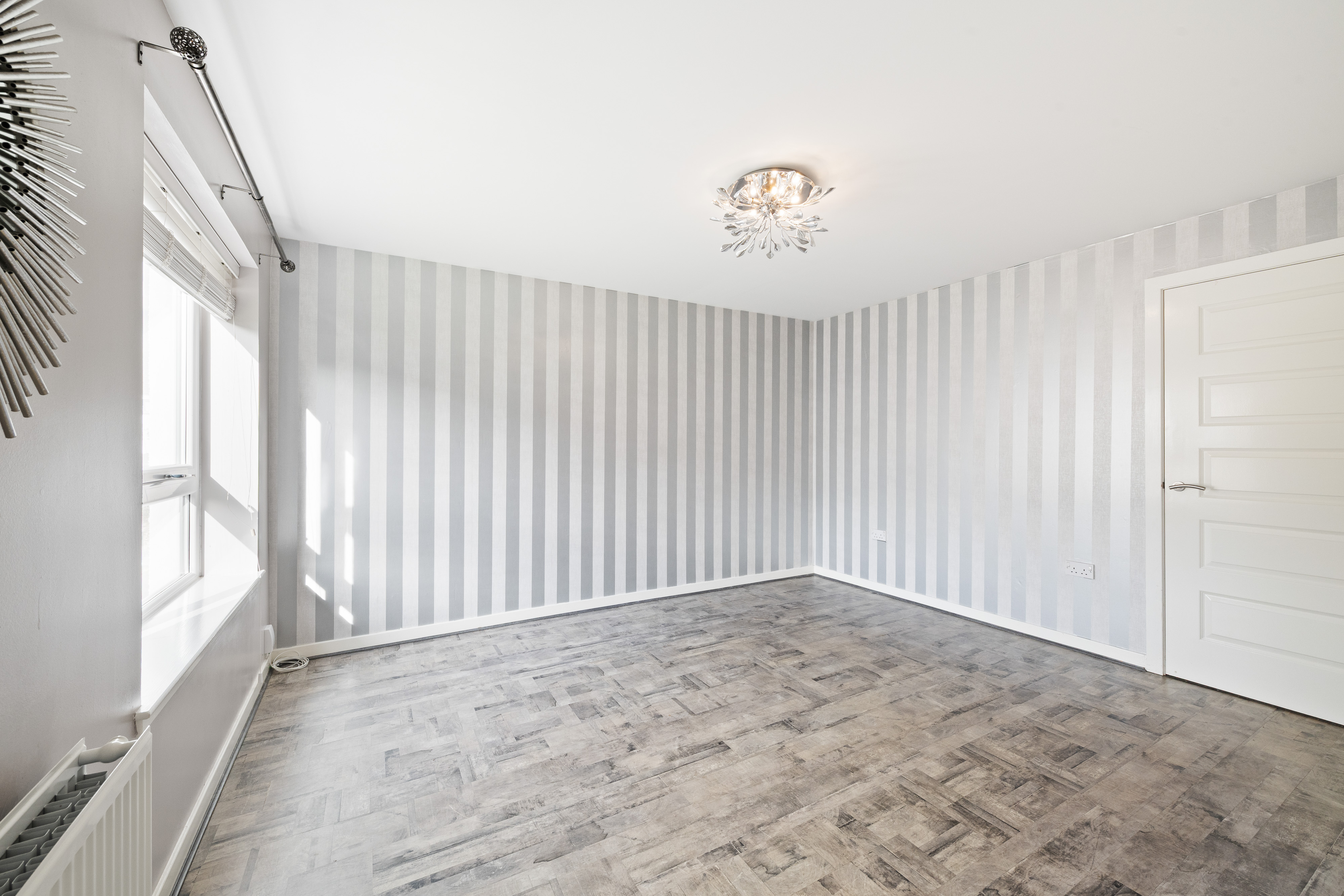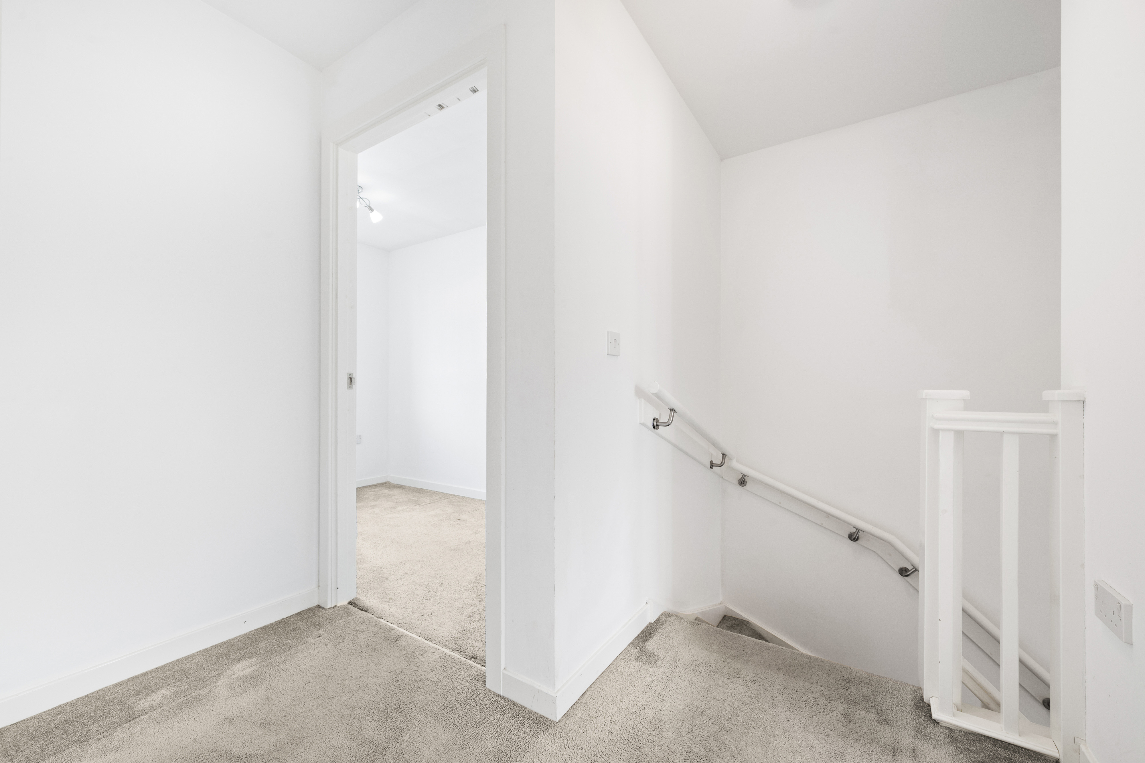 To your left is the main bedroom a bright and well proportioned double room with grey carpeting and neutral décor. One of the key features here is the excellent built in storage, with a double cupboard and an additional storage cupboard positioned above the stair bulkhead.