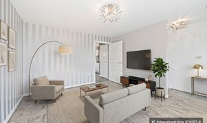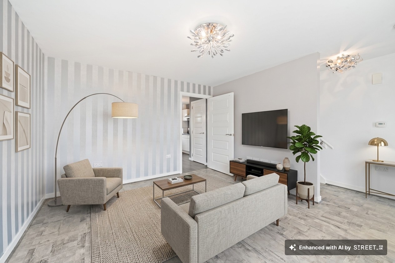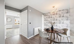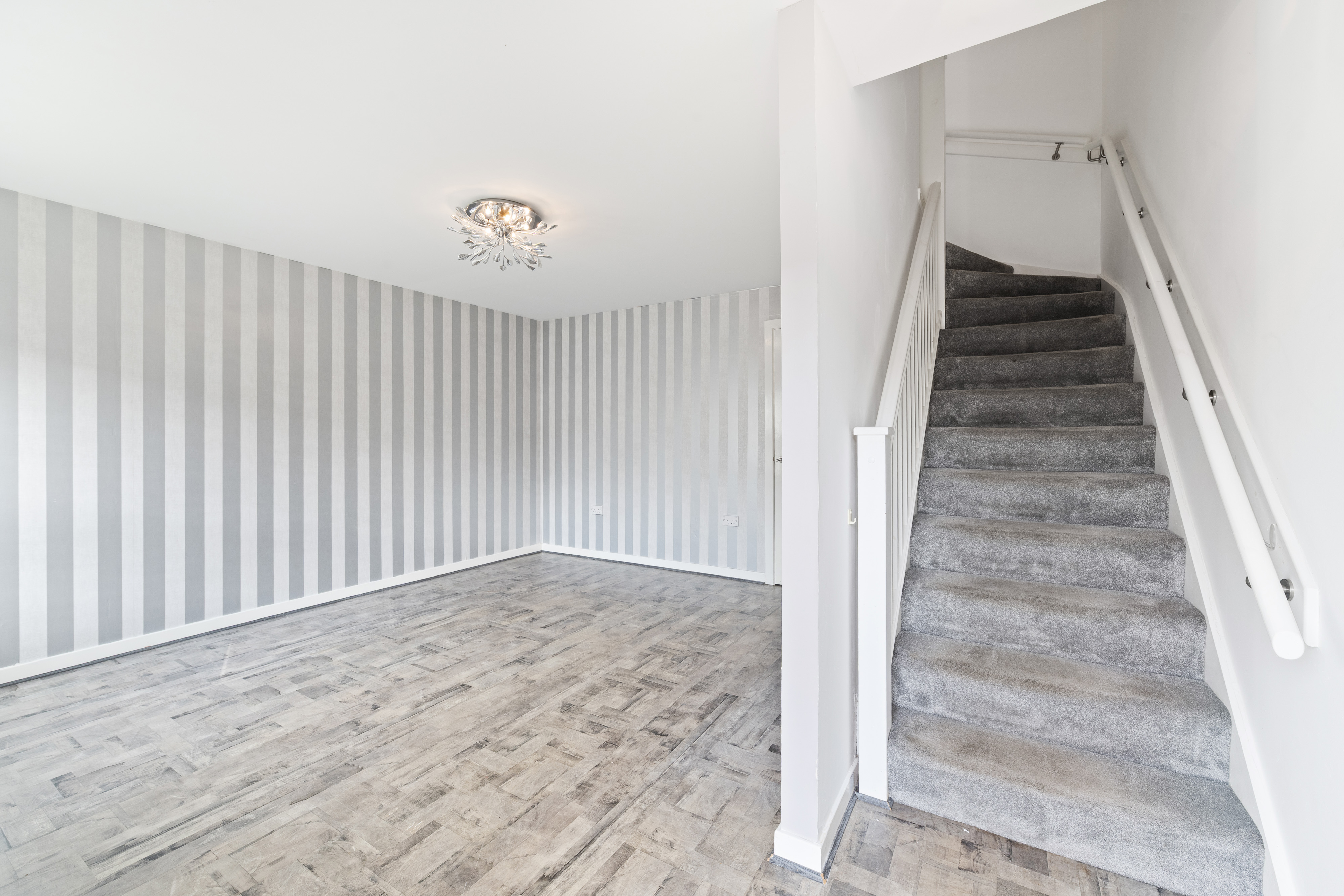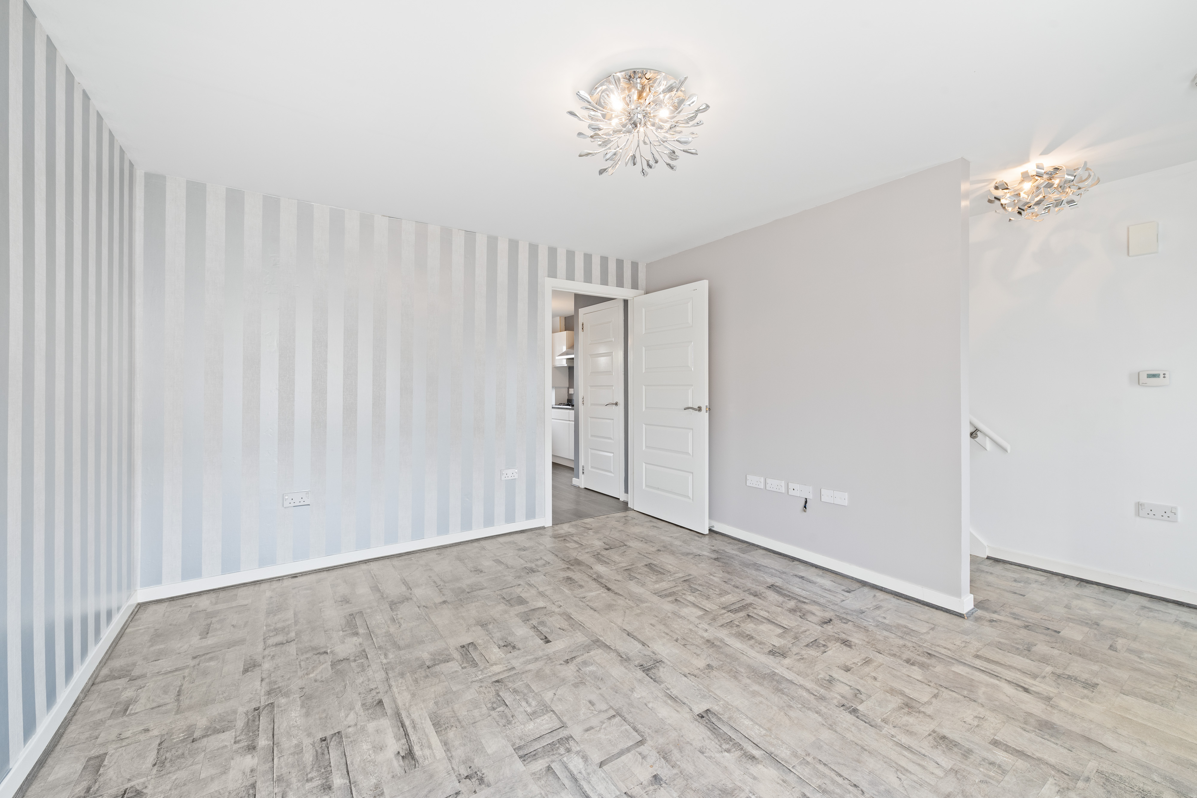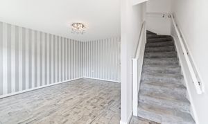 Step inside and you enter straight into the main living space, a bright, stylish lounge. The modern grey wood effect flooring runs throughout the ground floor, complemented by crisp neutral décor that makes the space feel light and inviting. The staircase is positioned neatly within the room, finished with soft grey carpeting and white balustrades, keeping the overall look cohesive and modern. It’s a comfortable and well proportioned living area, ideal for relaxing in the evenings or entertaining guests.
