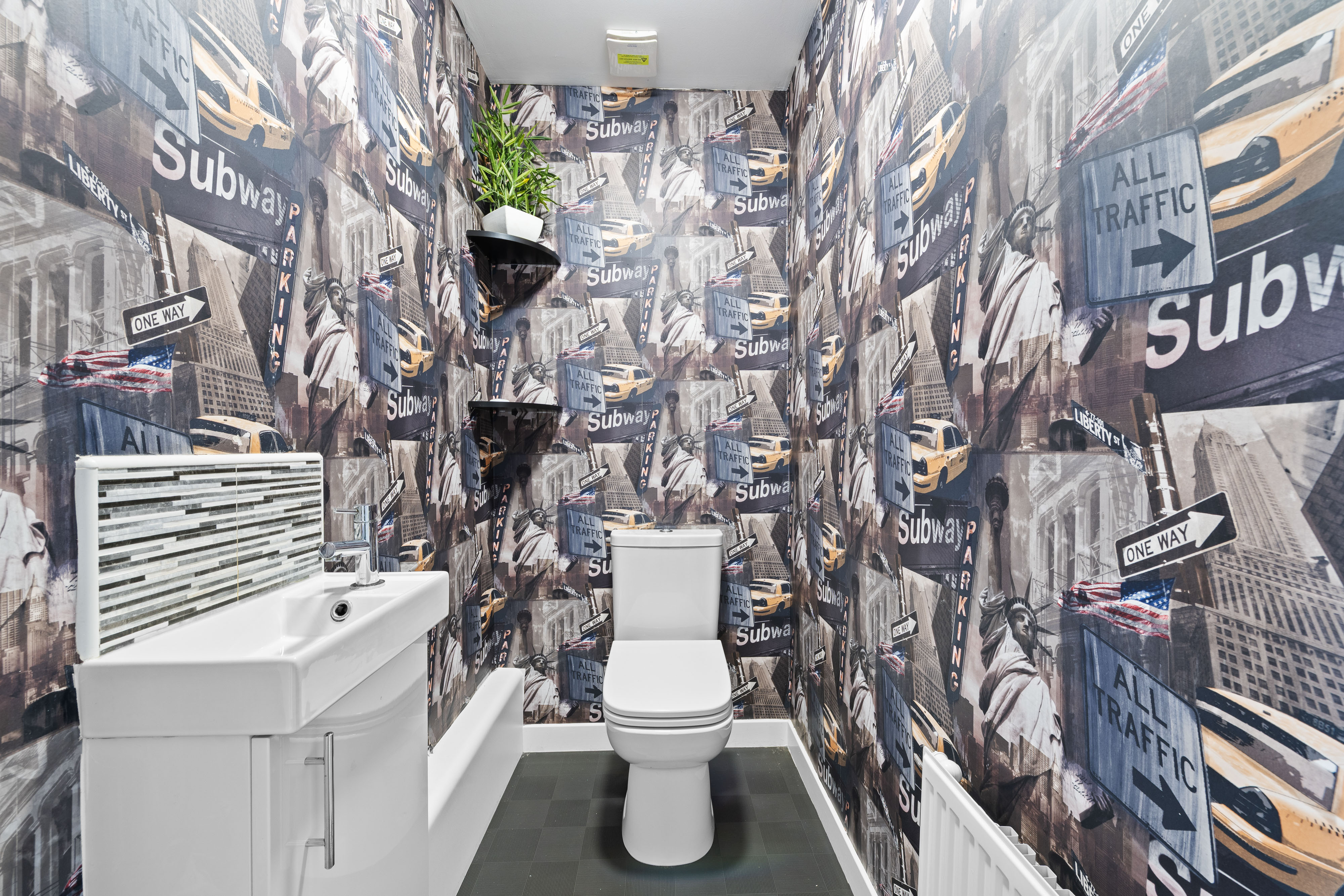 On your left hand side, you’ll find the downstairs WC. This is fitted with a modern white toilet and wash hand basin with vanity storage below, a practical and convenient addition for both guests and day to day living.