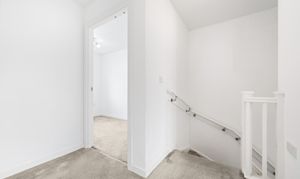 Heading back inside and upstairs, the grey carpeting continues up the staircase.