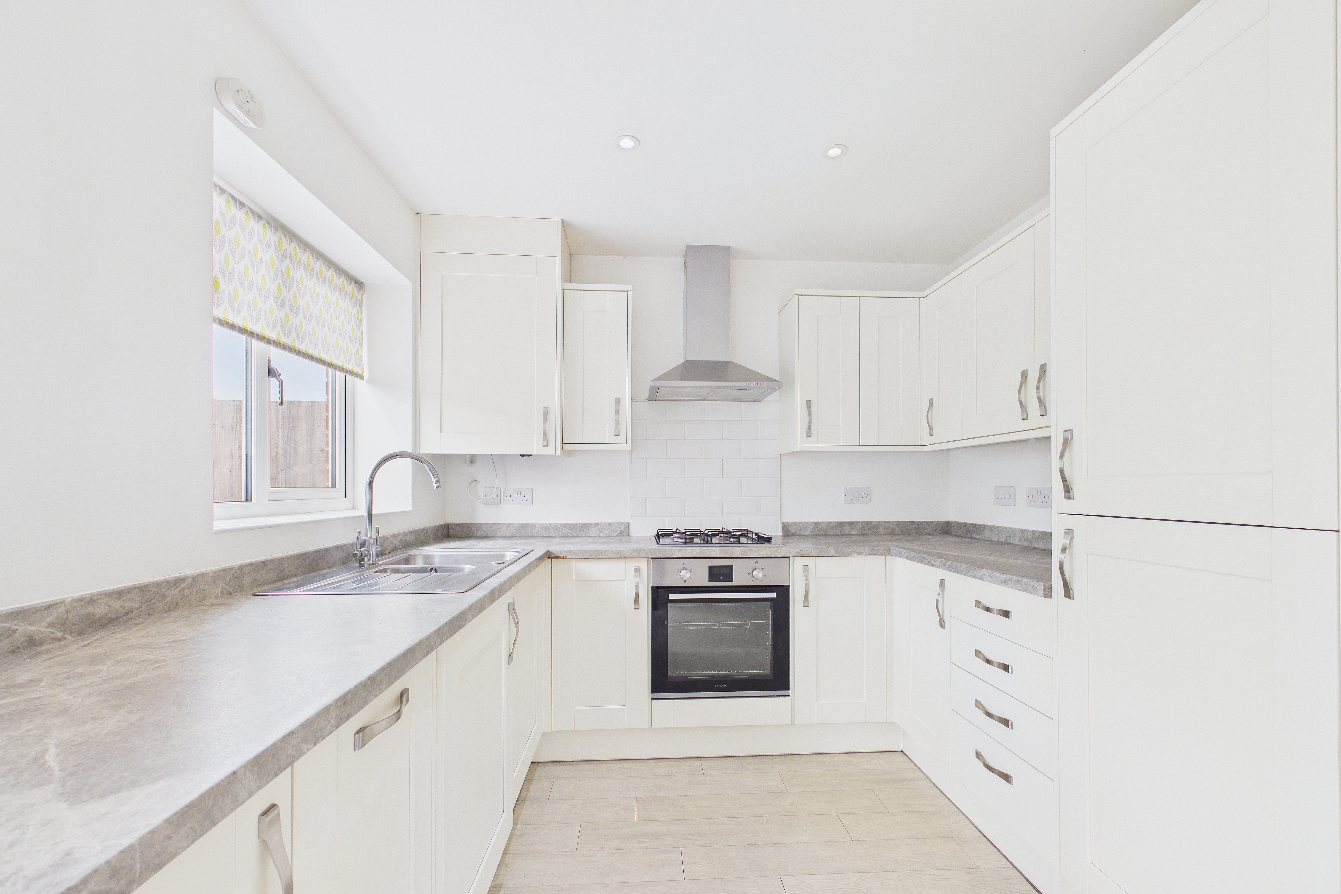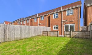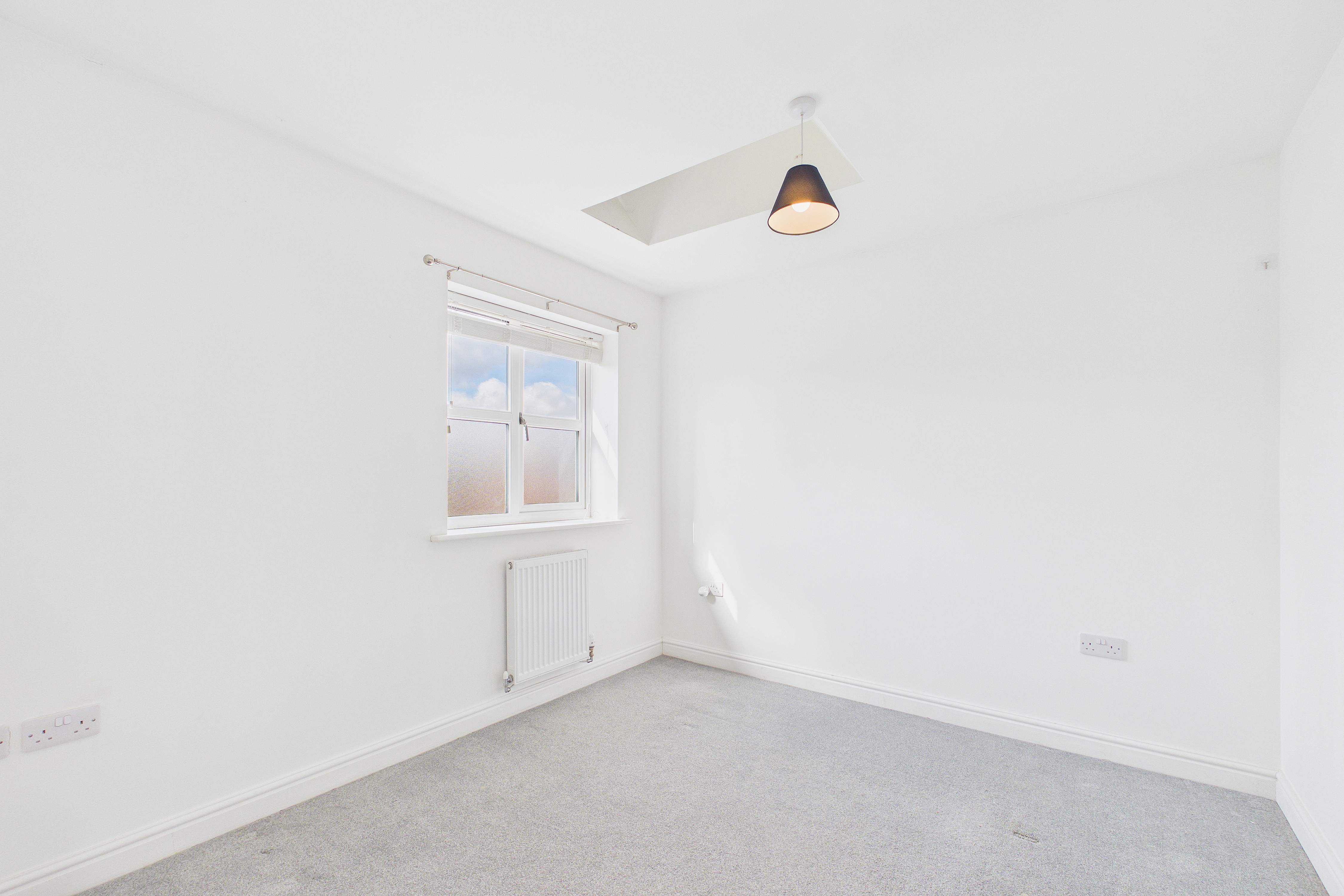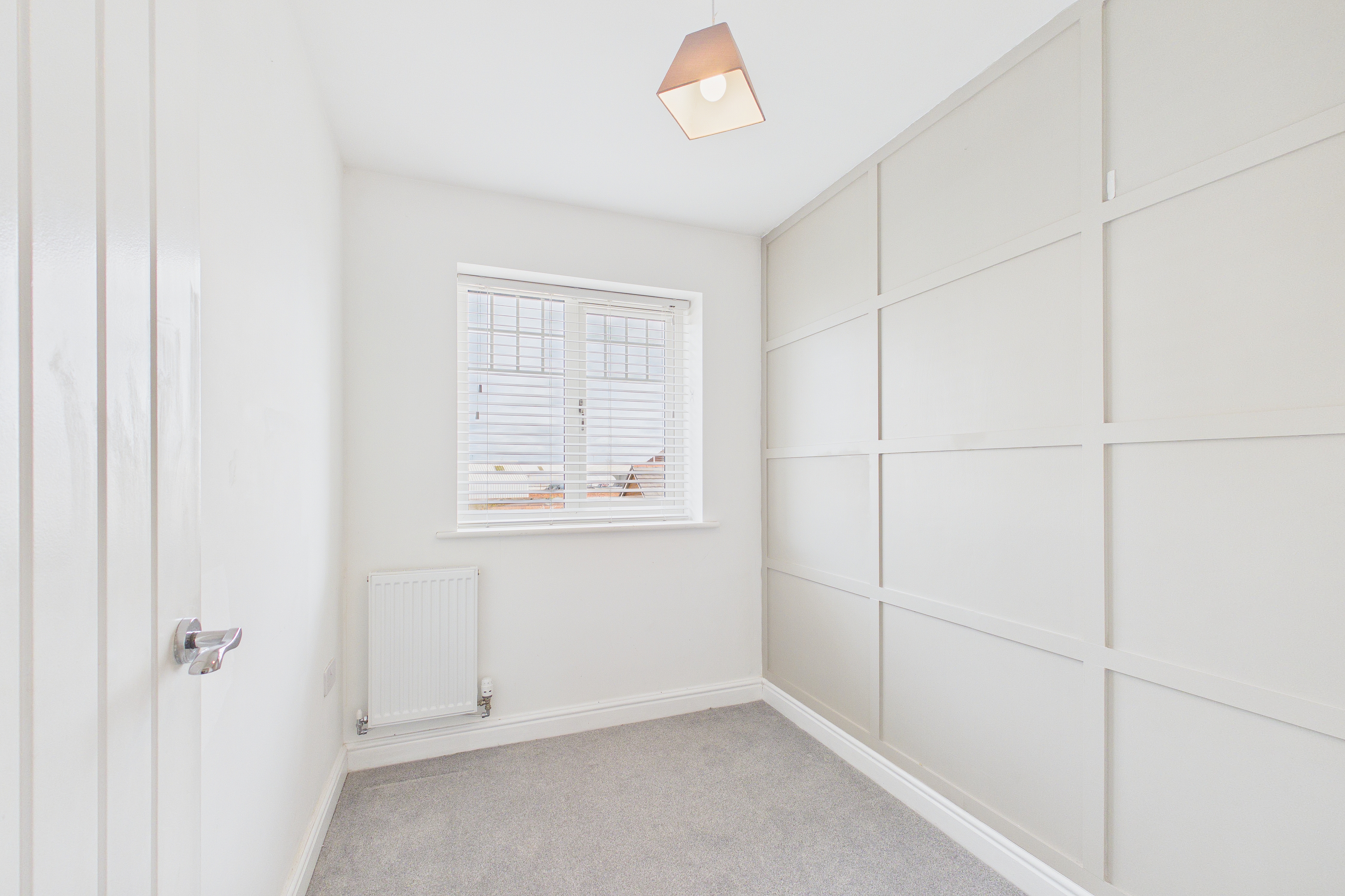 To the first floor, the landing features a spindled balustrade and a useful storage cupboard. There are three bedrooms, with the principal bedroom benefitting from its own en-suite shower room. The family bathroom is fitted with a modern three-piece white suite and serves the remaining bedrooms. Bedroom two enjoys the added feature of a skylight window, while bedroom three offers flexibility as a nursery, guest room, or ideal home office.