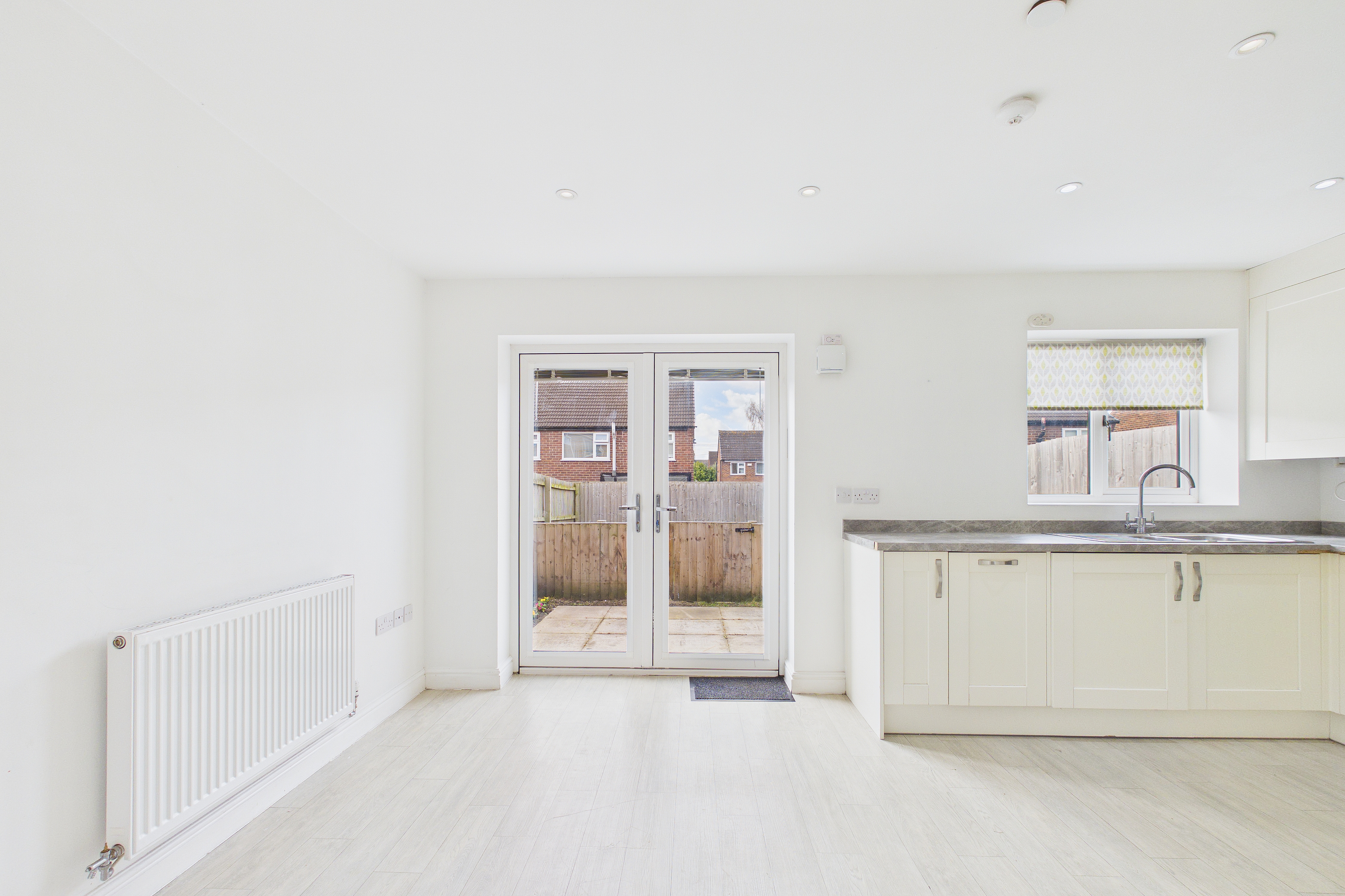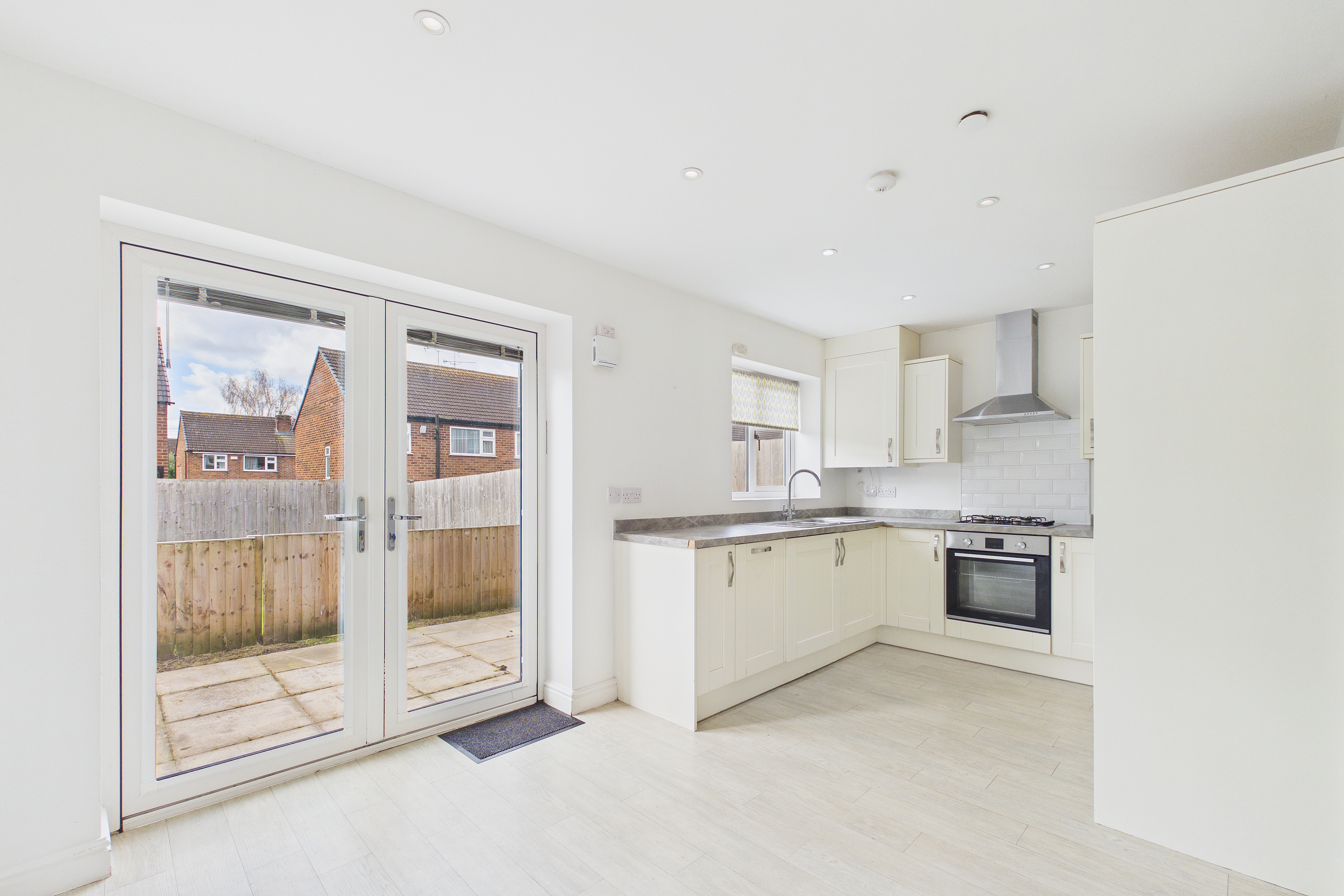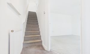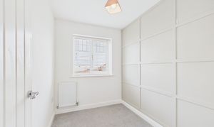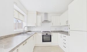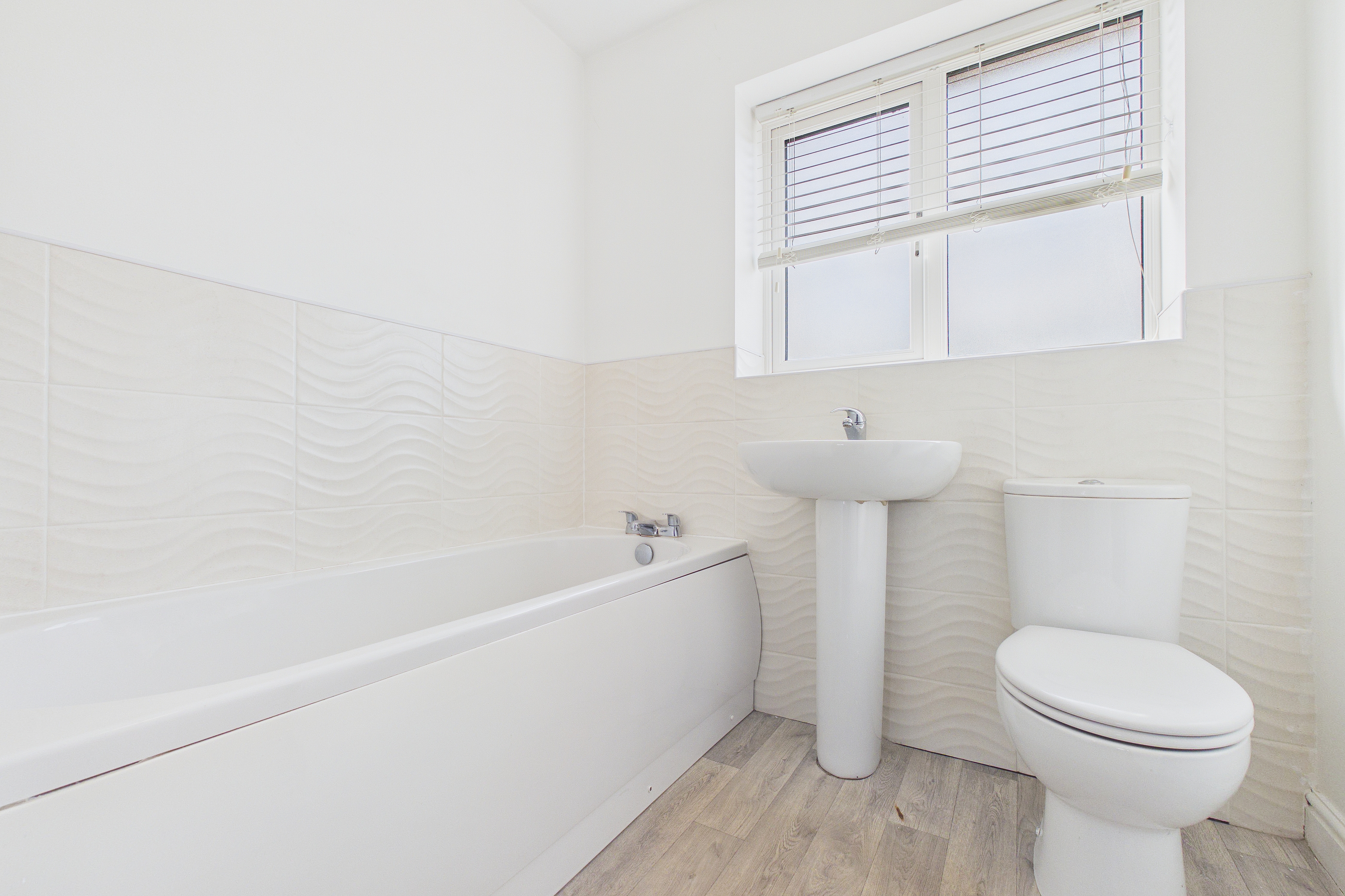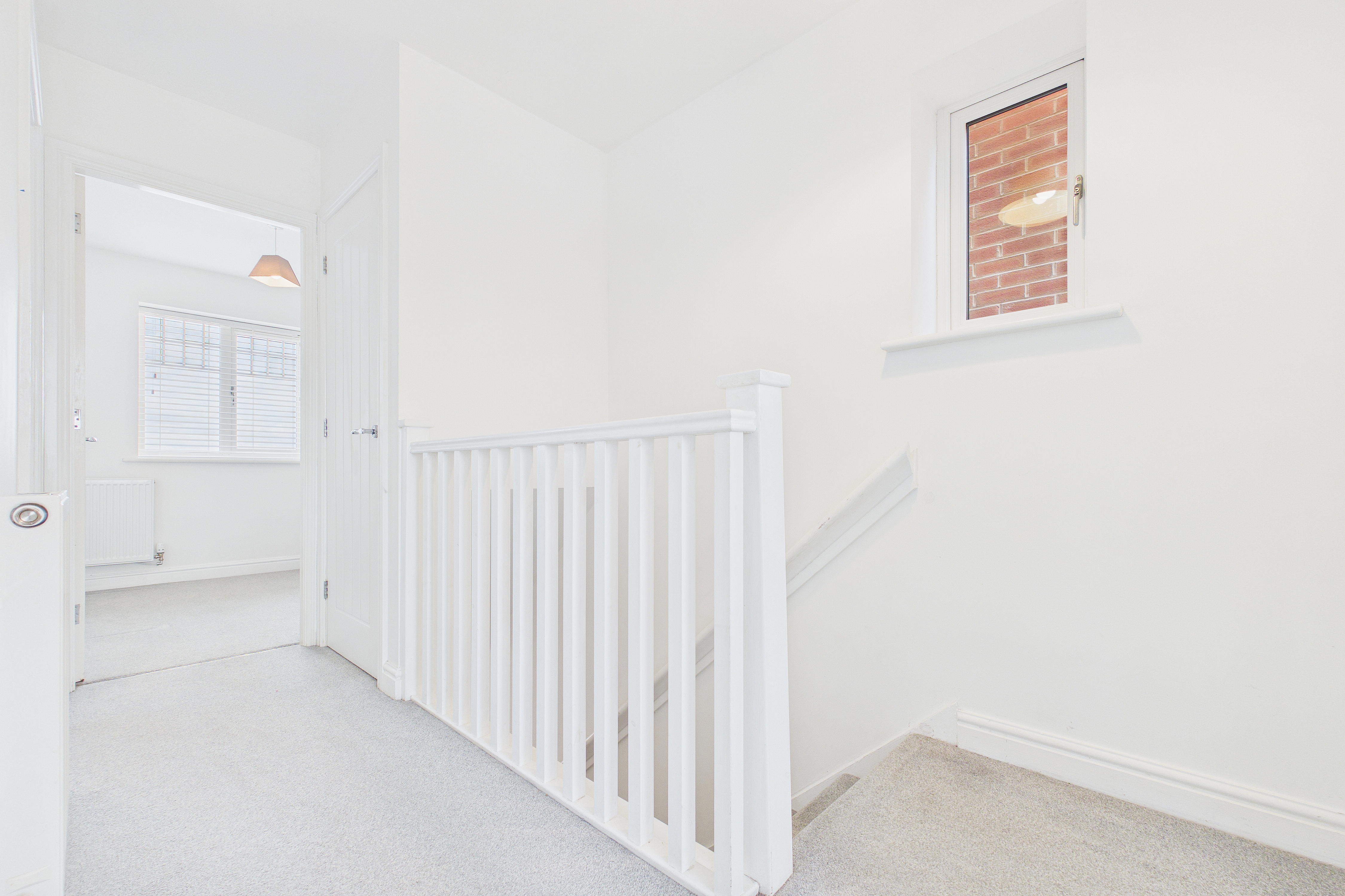 To the first floor, the landing features a spindled balustrade and a useful storage cupboard. There are three bedrooms, with the principal bedroom benefitting from its own en-suite shower room. The family bathroom is fitted with a modern three-piece white suite and serves the remaining bedrooms. Bedroom two enjoys the added feature of a skylight window, while bedroom three offers flexibility as a nursery, guest room, or ideal home office.