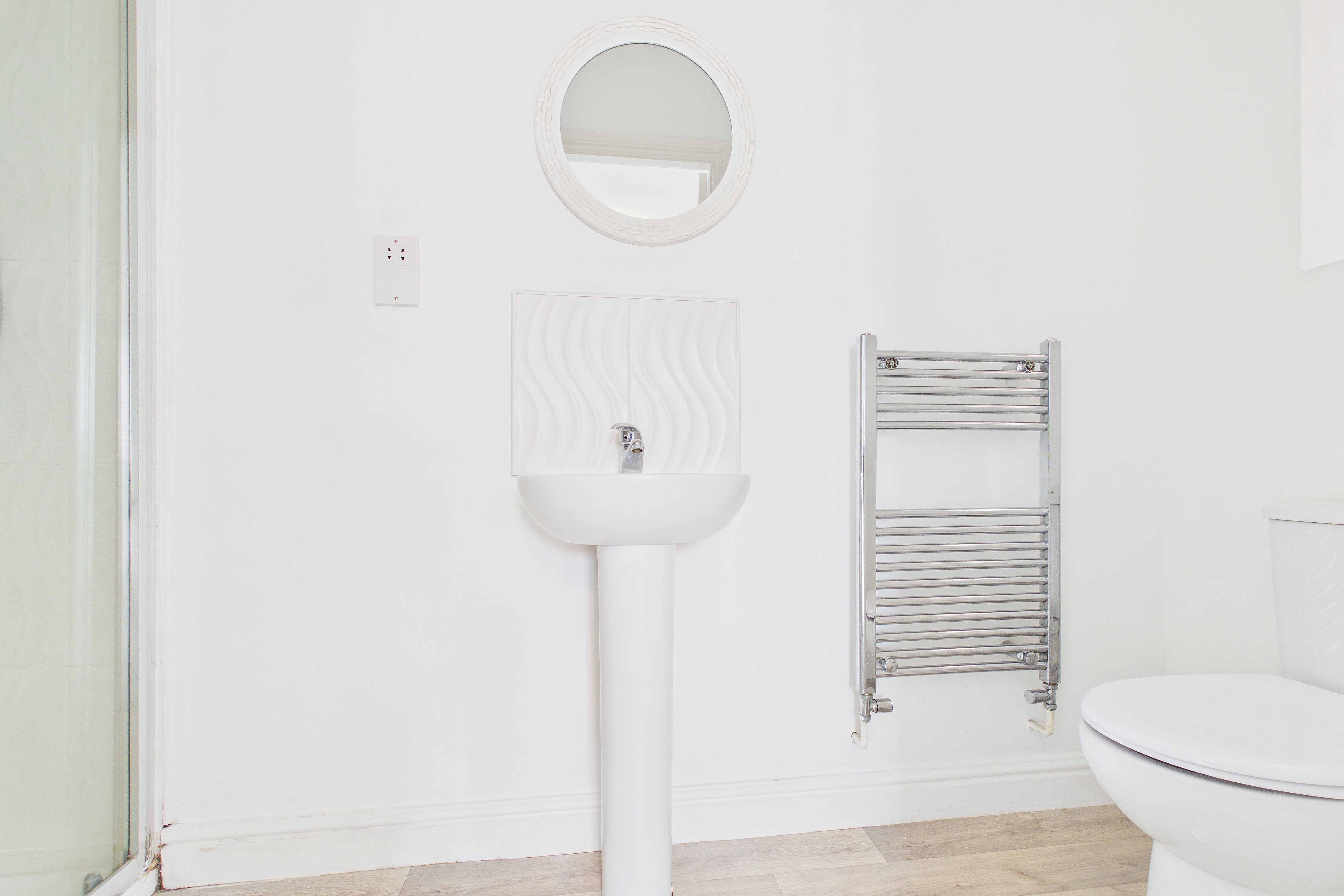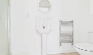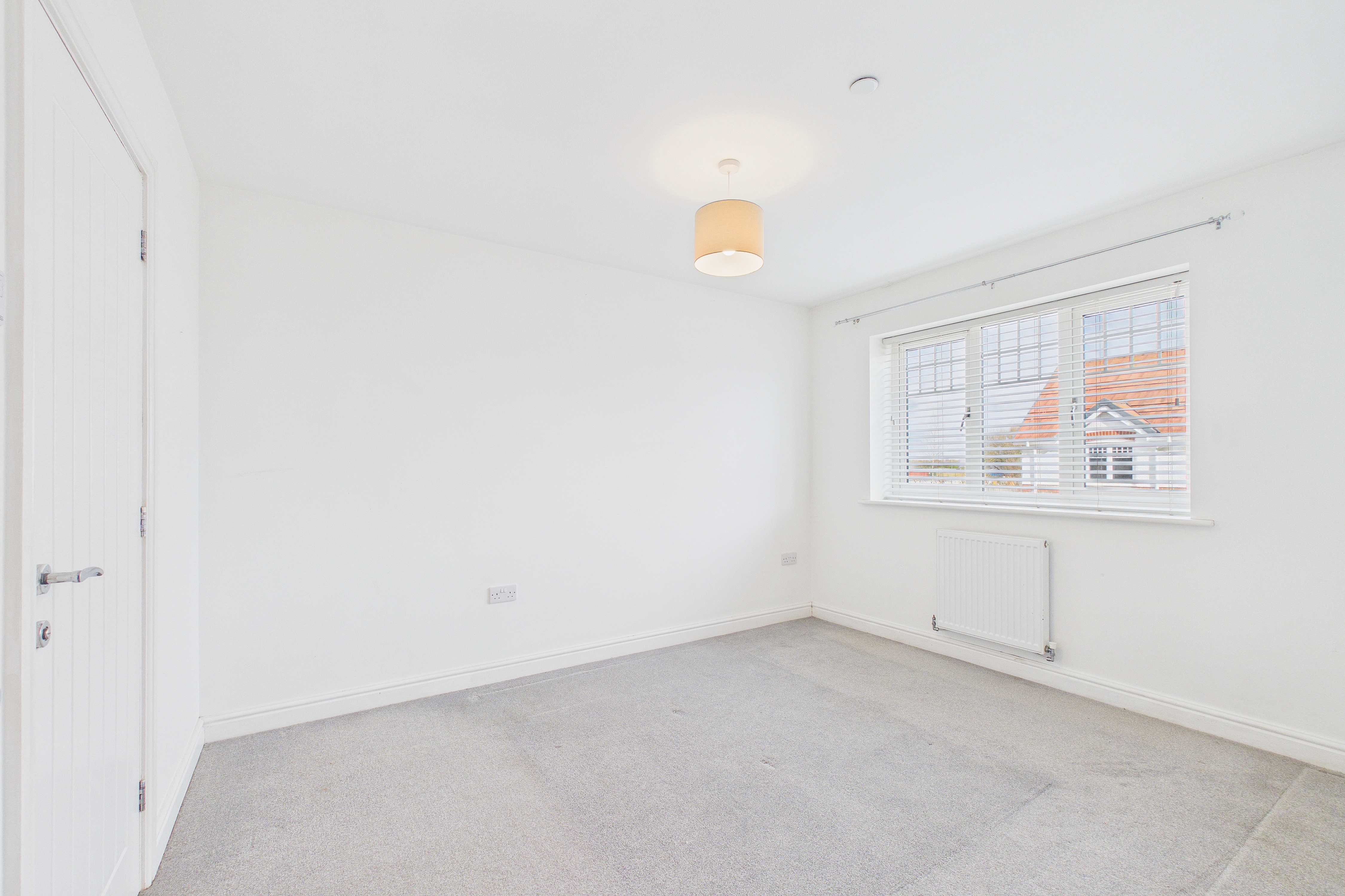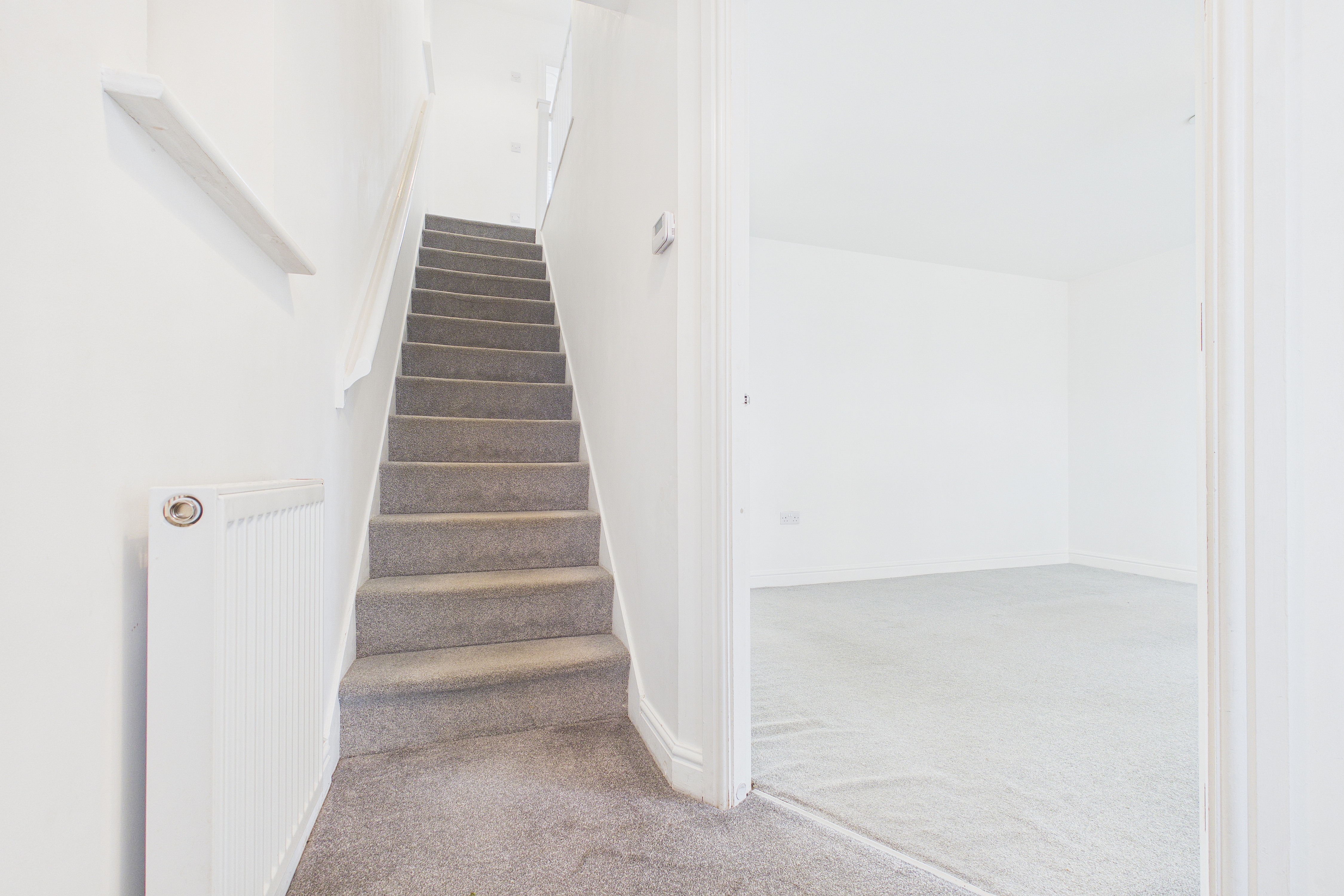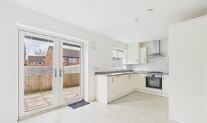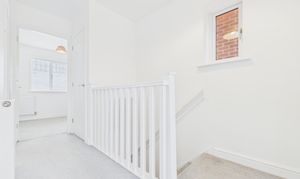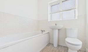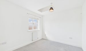 To the first floor, the landing features a spindled balustrade and a useful storage cupboard. There are three bedrooms, with the principal bedroom benefitting from its own en-suite shower room. The family bathroom is fitted with a modern three-piece white suite and serves the remaining bedrooms. Bedroom two enjoys the added feature of a skylight window, while bedroom three offers flexibility as a nursery, guest room, or ideal home office.