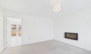 Entry to the home is via a double-glazed front door set beneath a pitched canopy, opening into a welcoming hallway with stairs rising to the first floor and access into the living room. The principal reception space benefits from a charming bay window, enhancing both natural light and the sense of space. A modern wall-mounted electric fire provides a stylish focal point, and an internal door leads through to the open-plan dining kitchen.