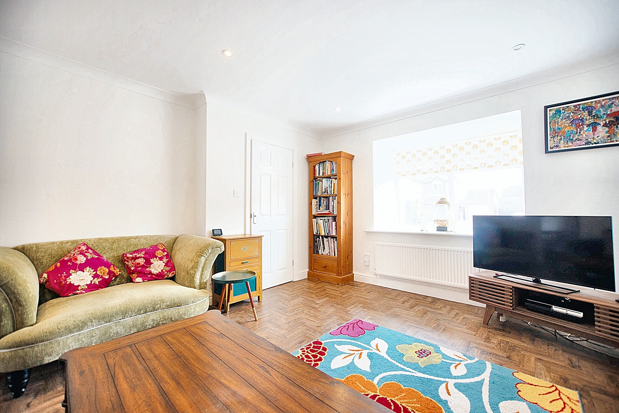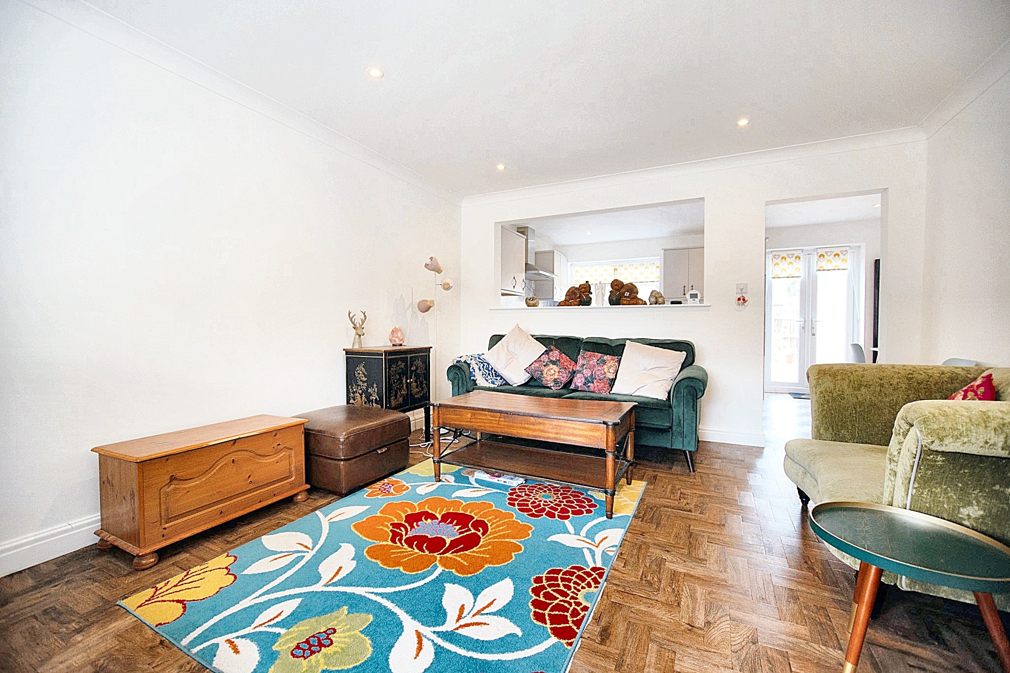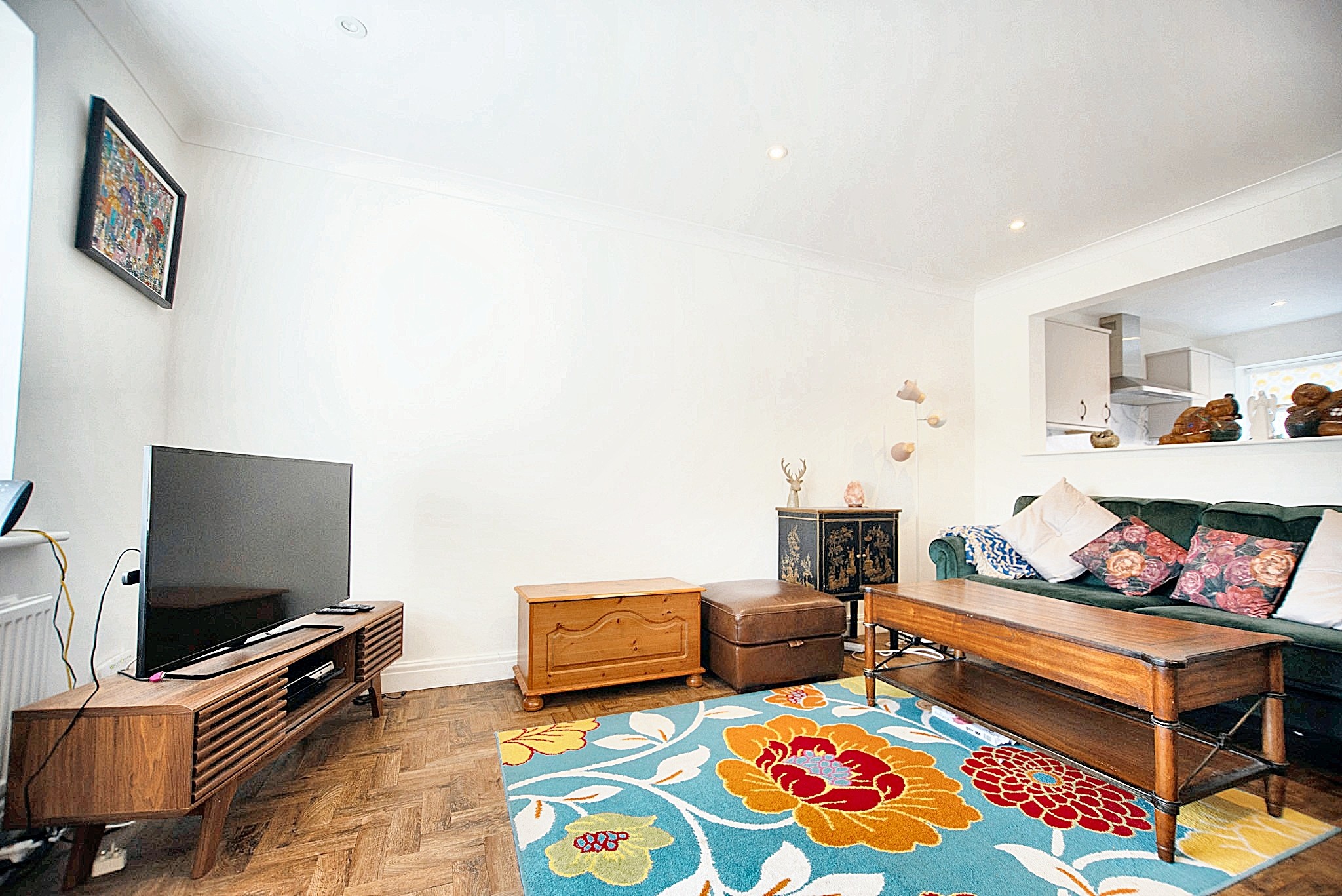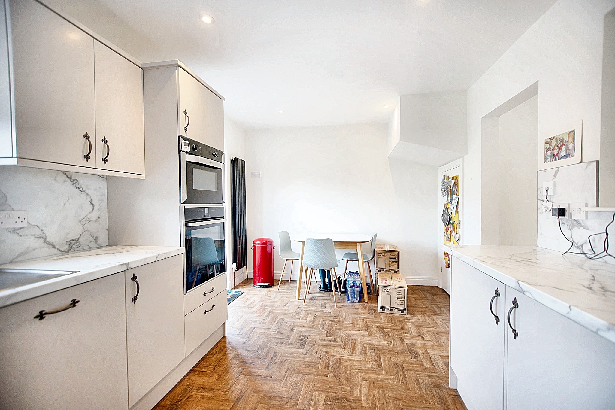 With laminate flooring, radiator, double glazed window and open arch leading to the kitchen.