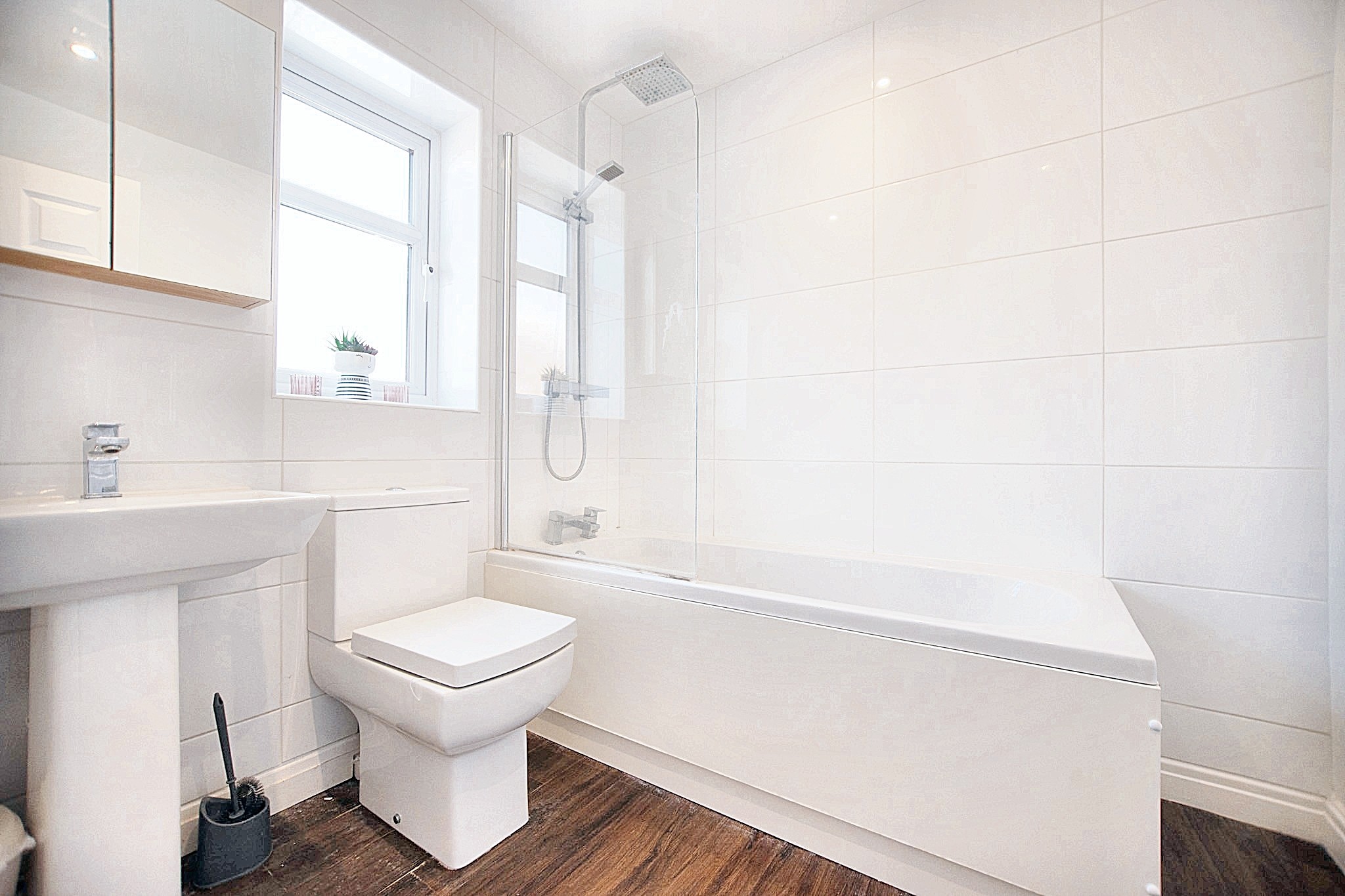 With vinyl flooring, wash hand pedestal basin, WC, bath tub, shower attachment, towel radiator and double glazed window.
