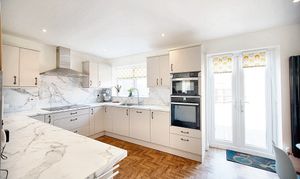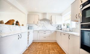 With laminate flooring, laminate work surfaces, hob, extractor fan, sink/drainer, double glazed window, space for appliances, radiator, double oven and door leading to the rear garden.