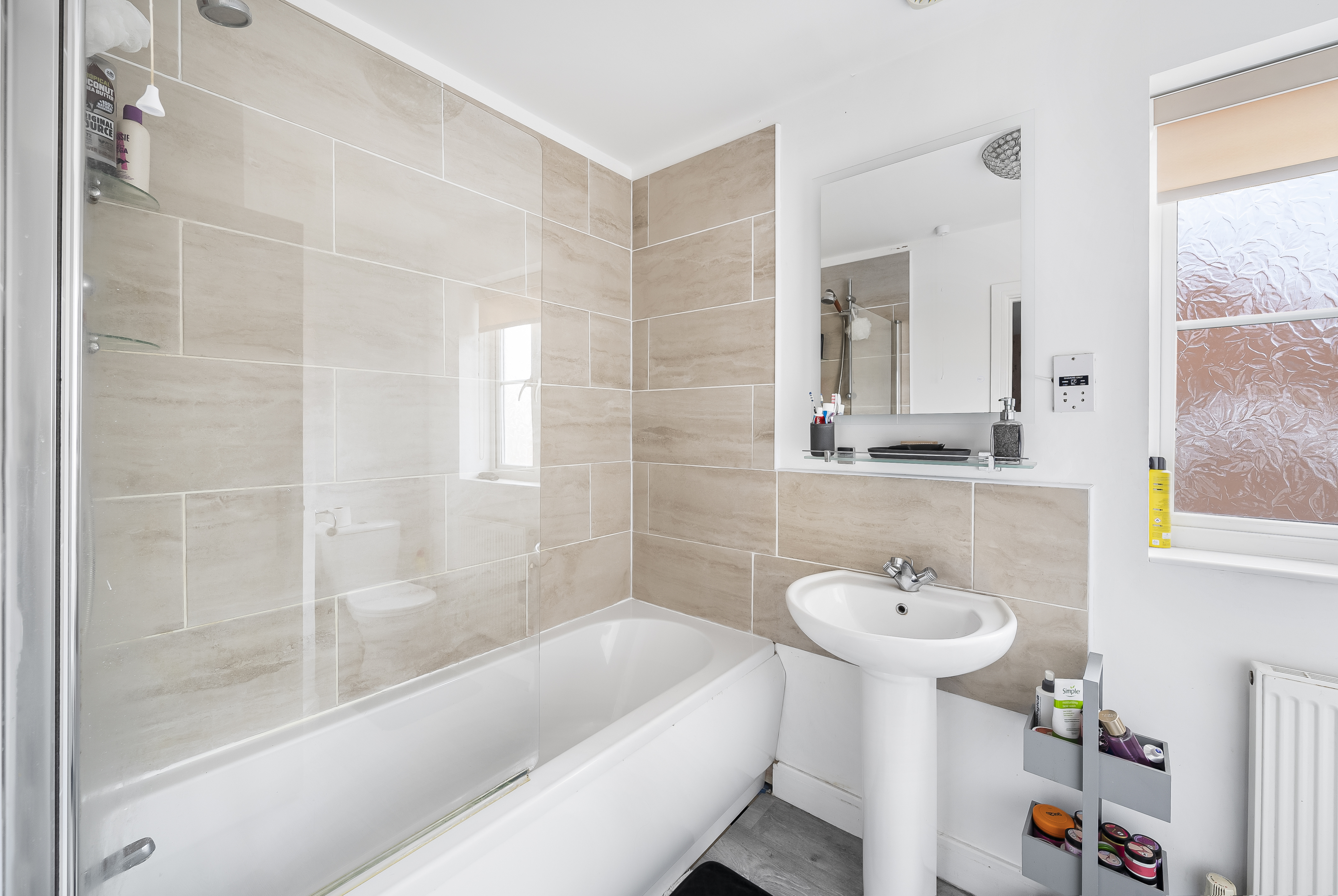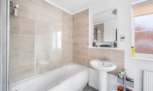 Modern Family Bathroom with shower-over-bath configuration