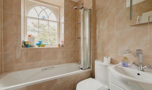 On the first floor there are 3 double bedrooms, the master bedroom (with en-suite and built in wardrobe area) is spacious and has impressive views over the garden from the large picture window and has a feature fireplace. There is a door through to the adjoining bedroom that could also be used as a nursery or adapted to a dressing room if desired. Also on this floor is a large airing cupboard and a separate bathroom with a shower over the white suite bath.