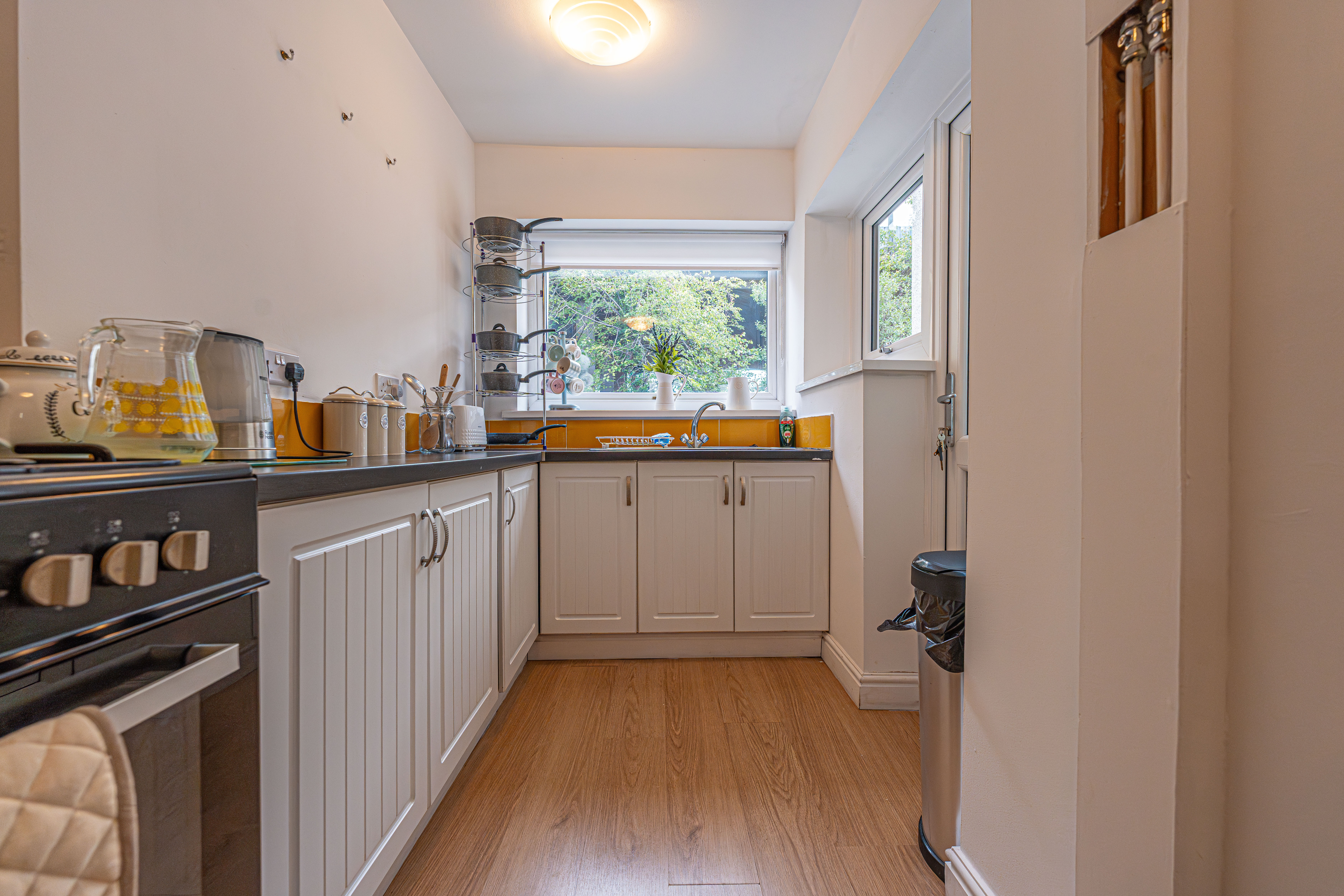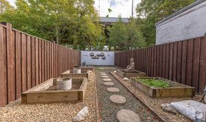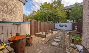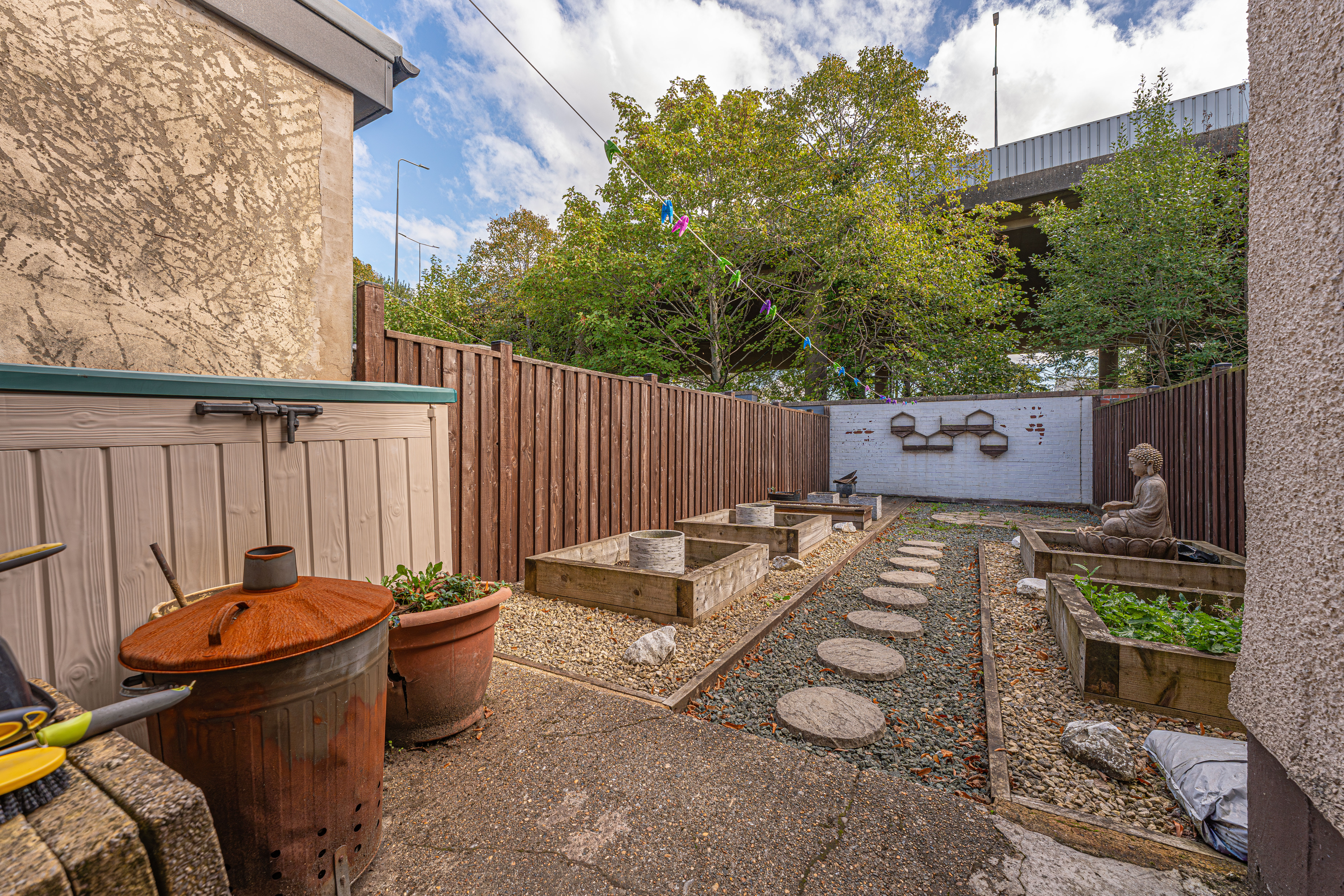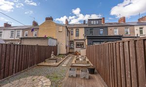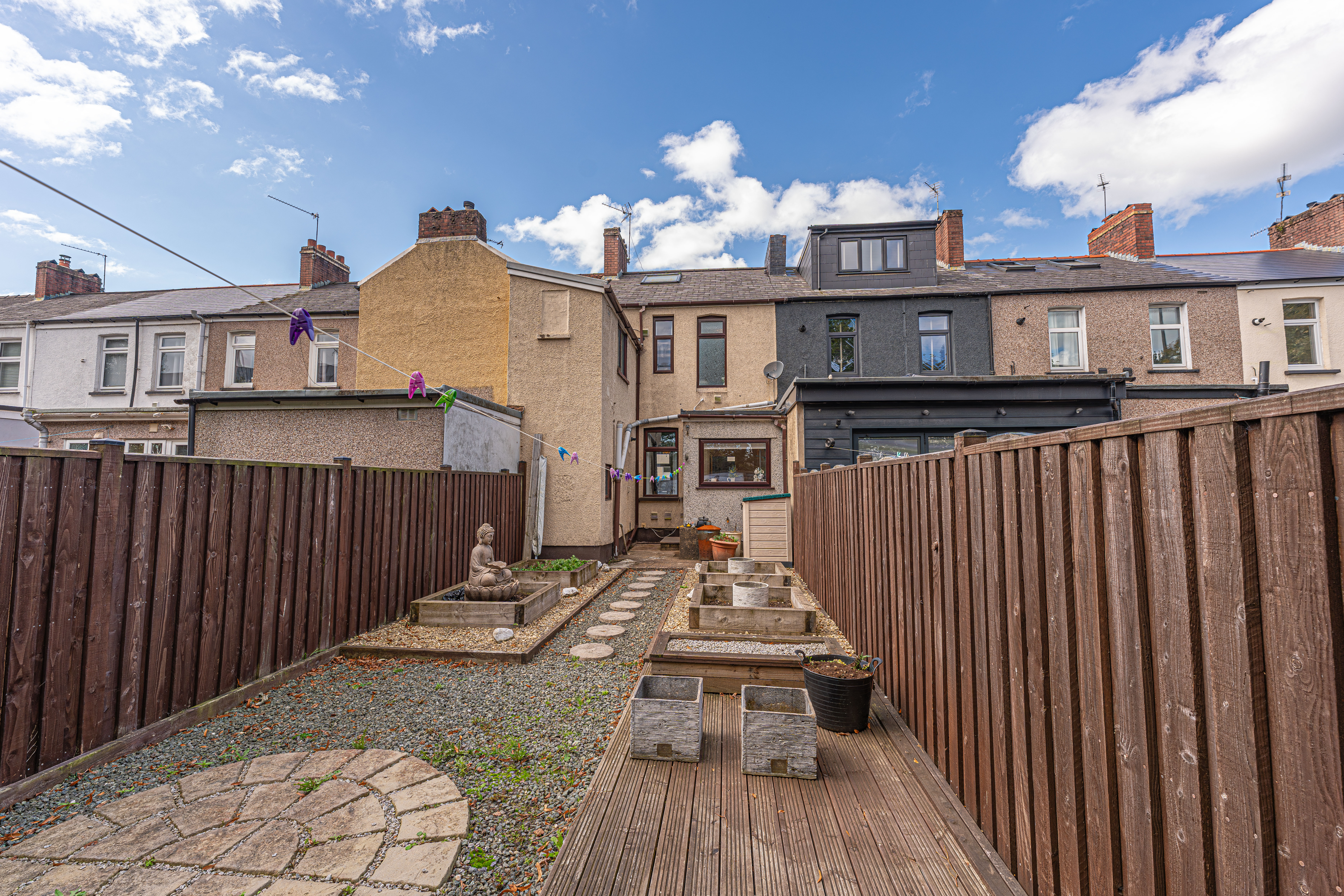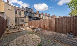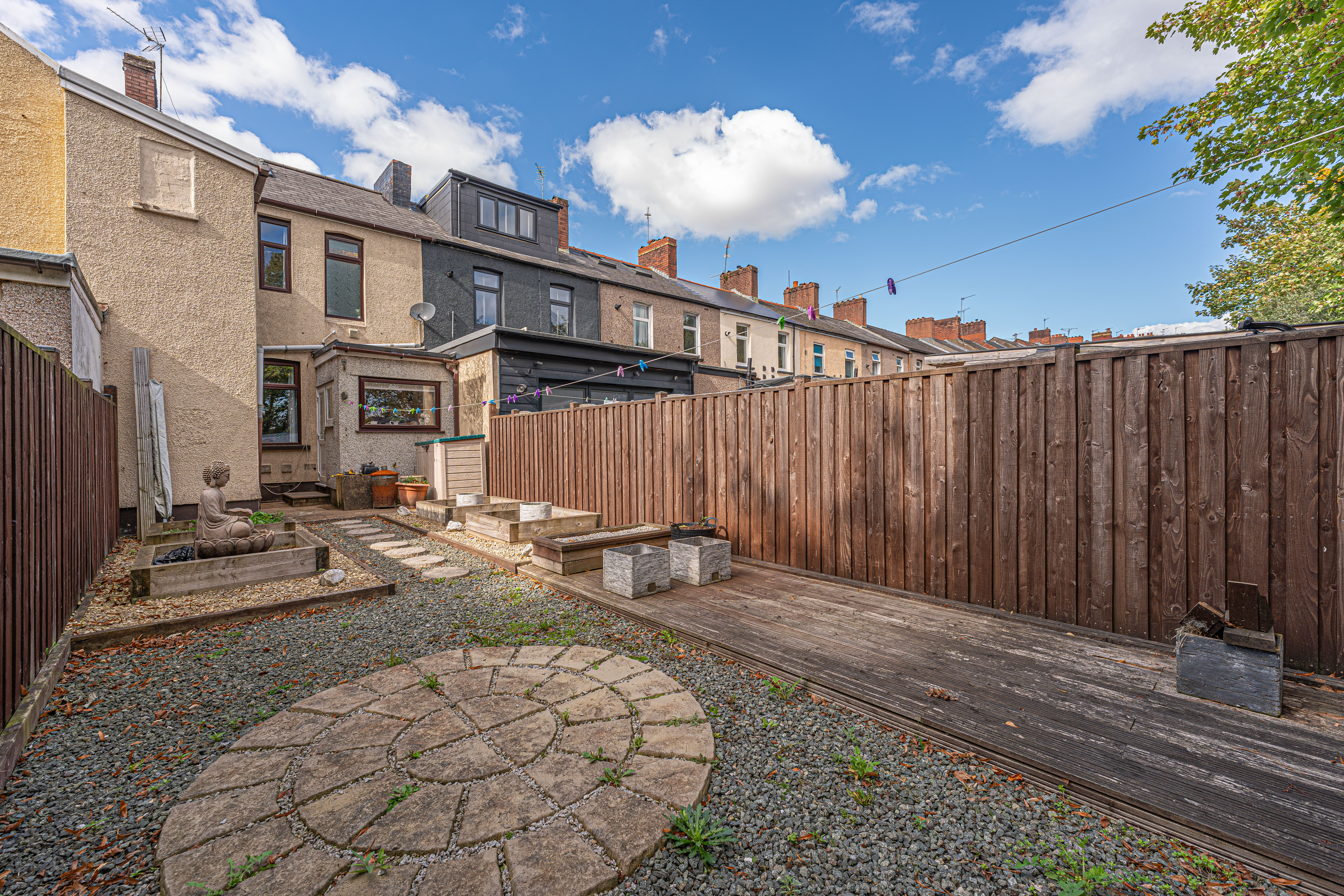 Stepping outside, we arrive at the fully enclosed rear garden, which features a low-maintenance design comprised of pebble stone, raised planting beds, and a decked seating area, making it a tranquil retreat for lounging in the fresh air, or welcoming guests for tea/coffee or dining al-fresco style. On road parking is available to the front of the house.