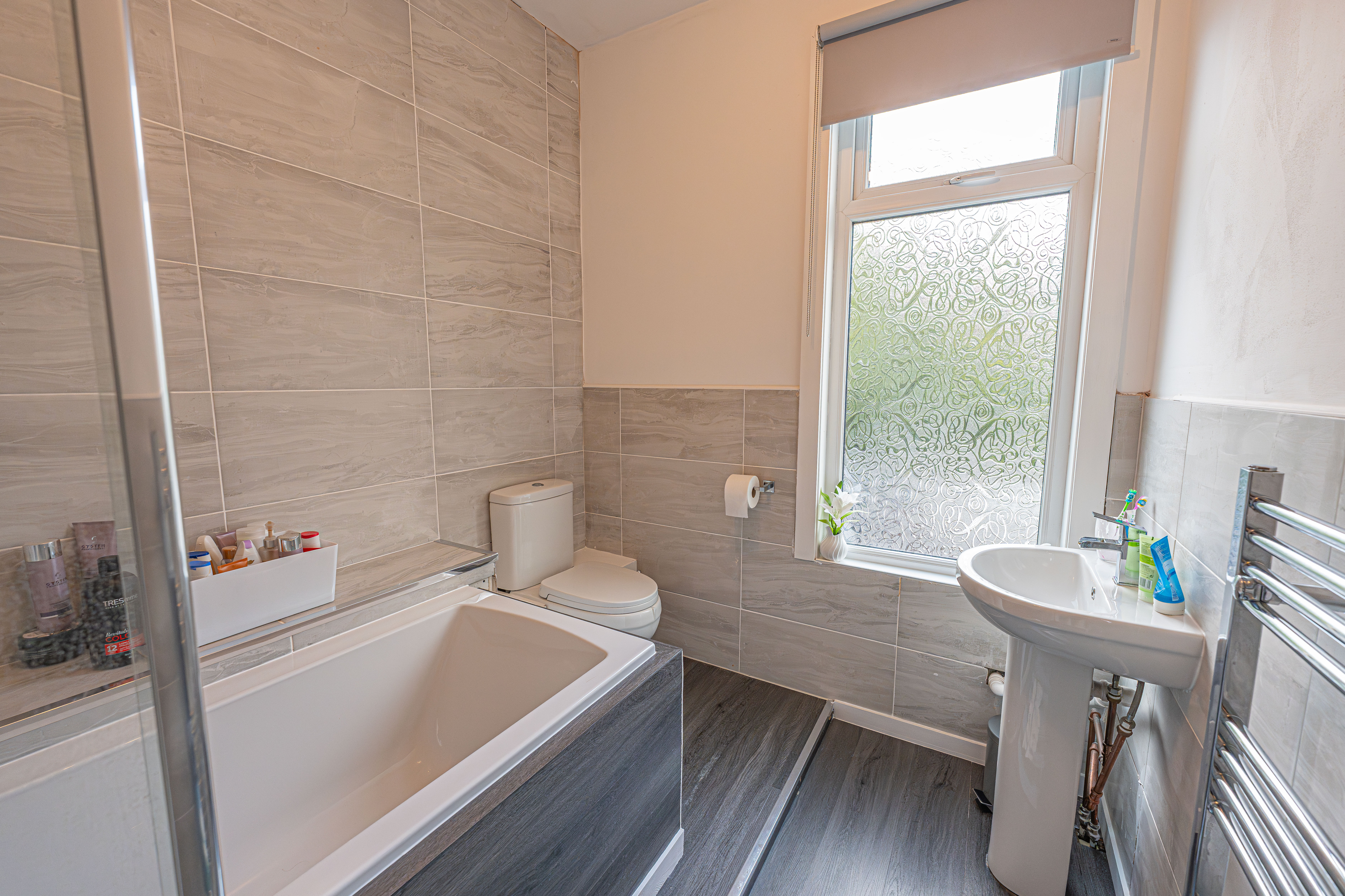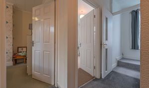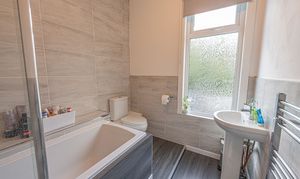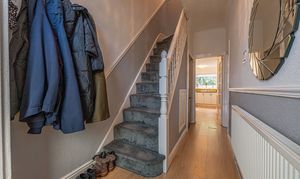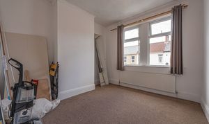 To the first floor we find the first two bedrooms, which are both well sized double rooms, with the rear facing bedroom having the added benefit of a helpful walk in wardrobe for optimal storage, while also retaining the former plumbing to allow for a potential en-suite conversion. The main family bathroom is fitted with a bath suite and overhead shower, and is found from the hallway alongside a staircase to the second floor, where the third double bedroom is located, with velux windows for plenty of light.