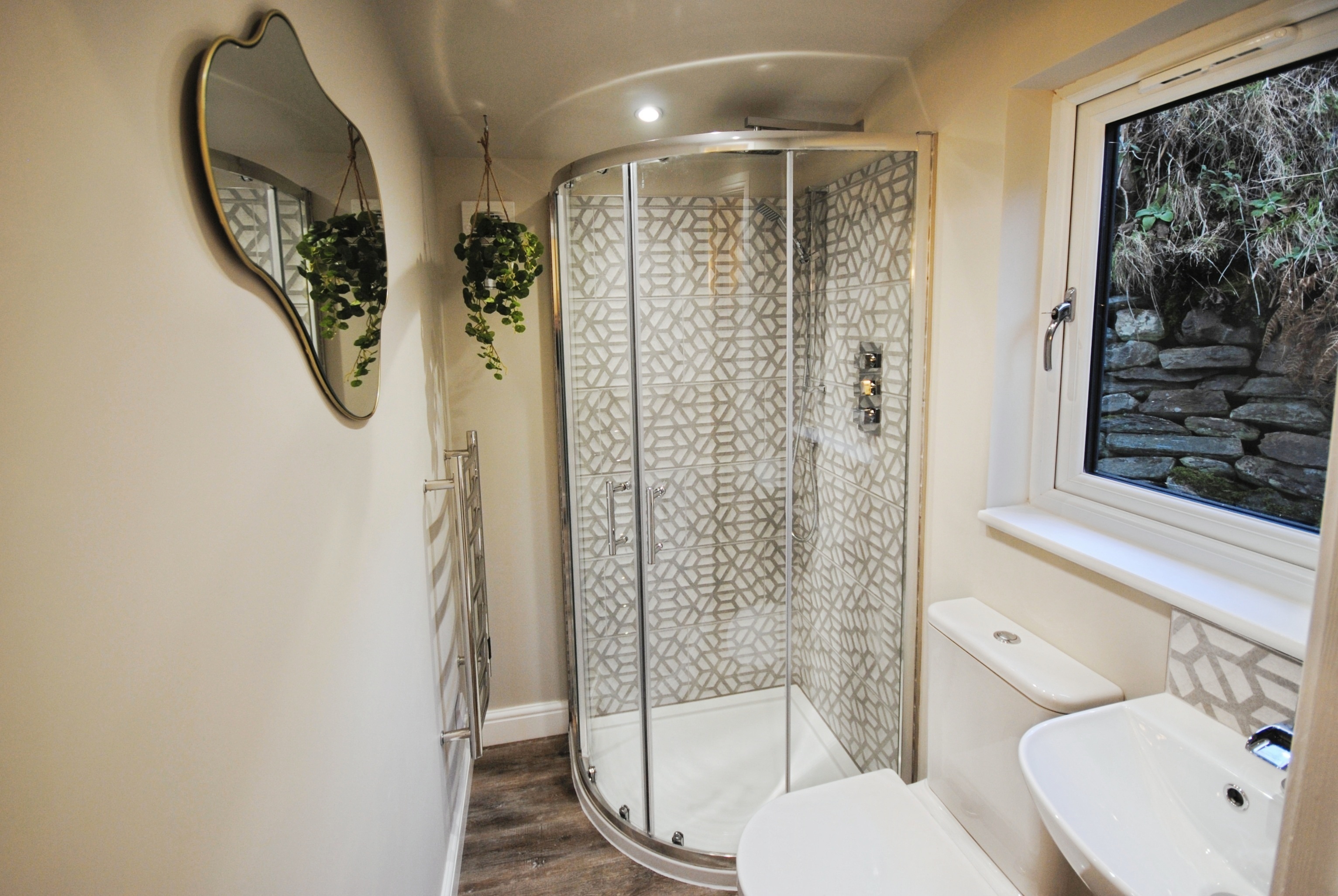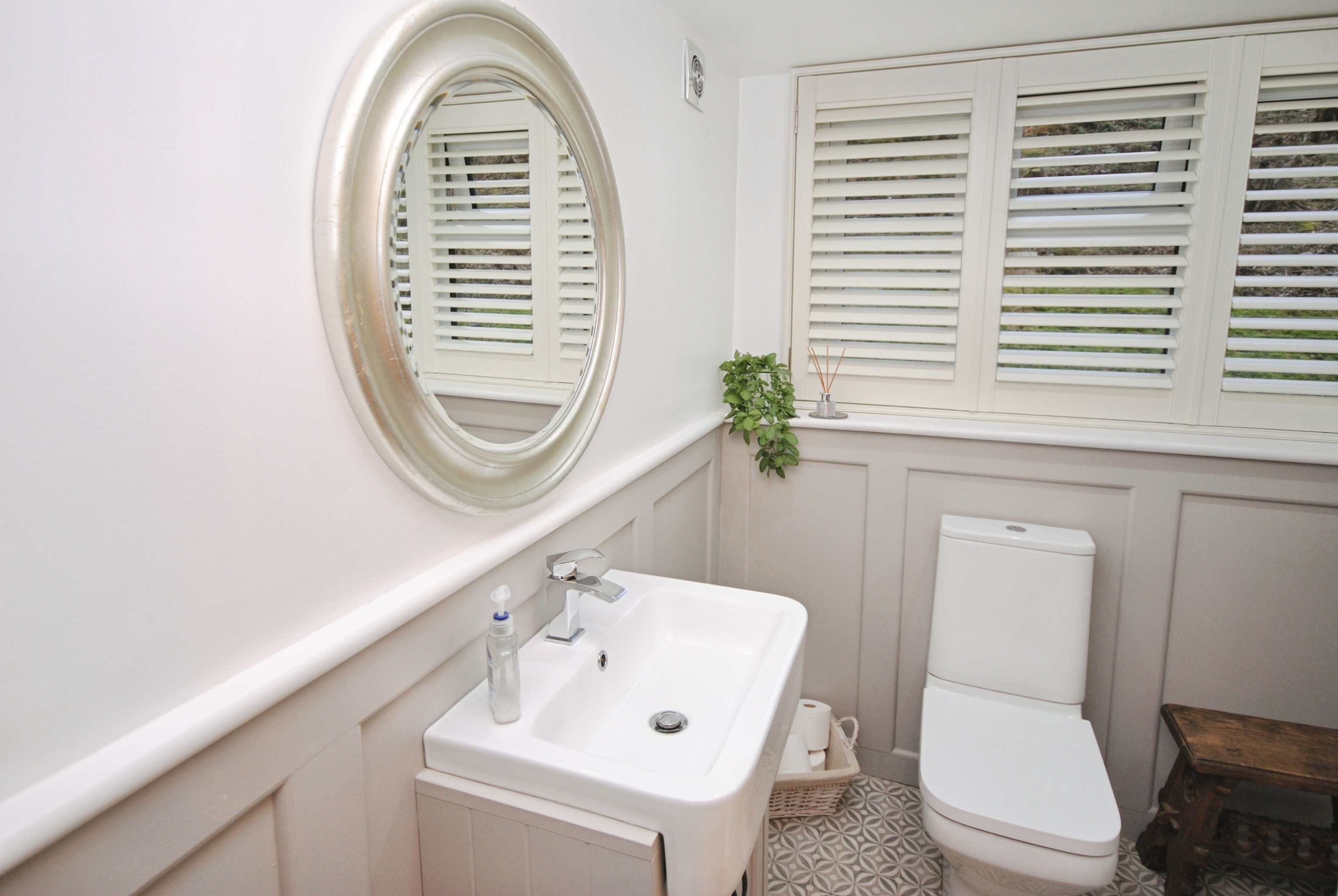 Modern shower-room with shower cabinet, hand-basin, WC and heated towel rail. Bespoke shutter blinds allowing views to hills at rear of property.