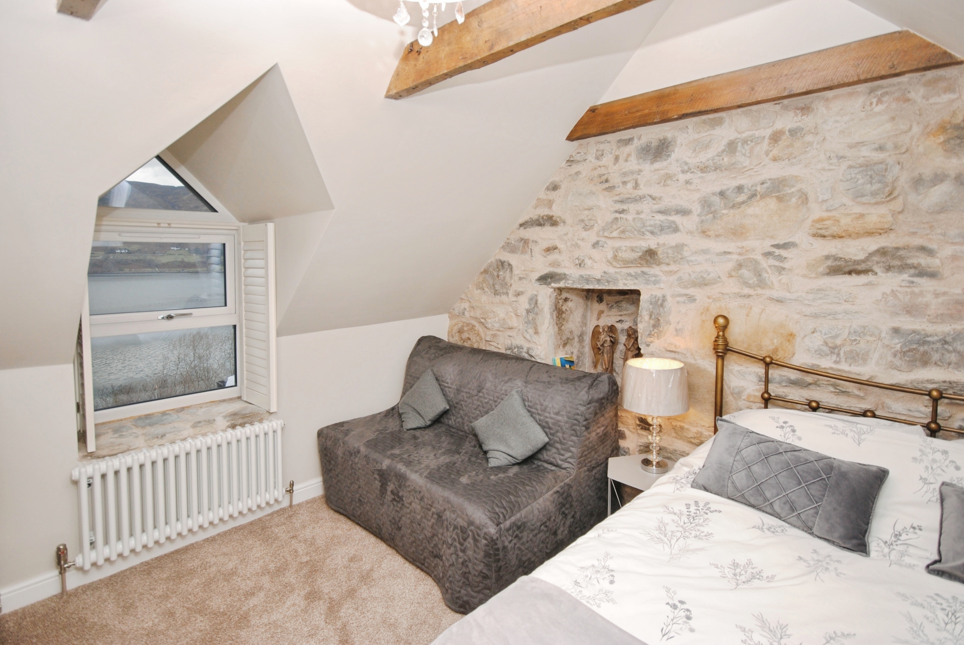 Spacious twin-aspect bedroom with feature stone wall and window sill, original timber beams. Coombed ceiling and views over Loch Broom.