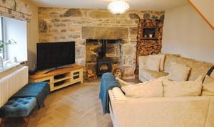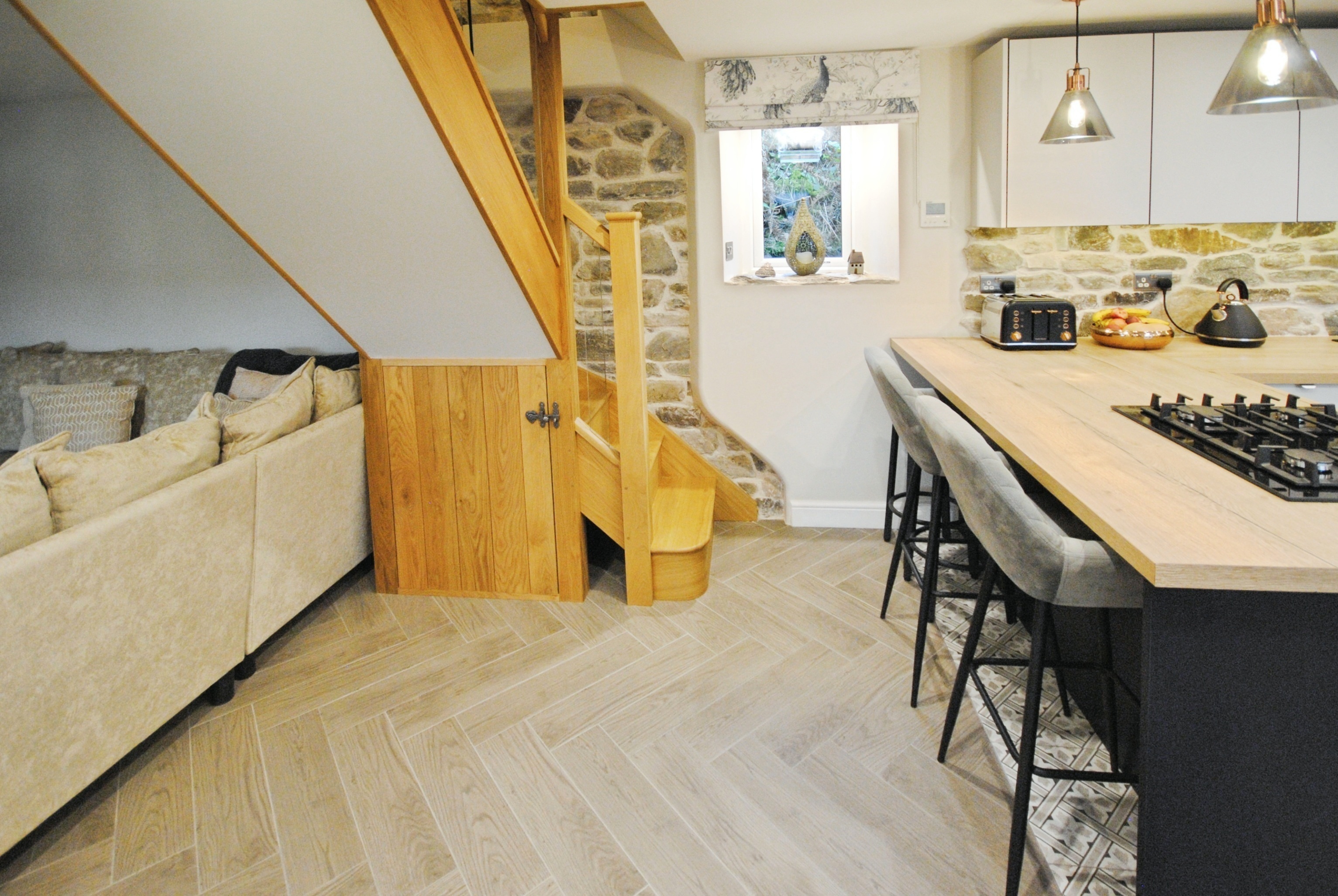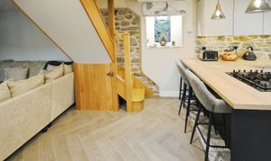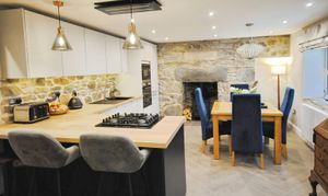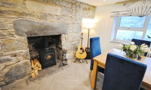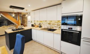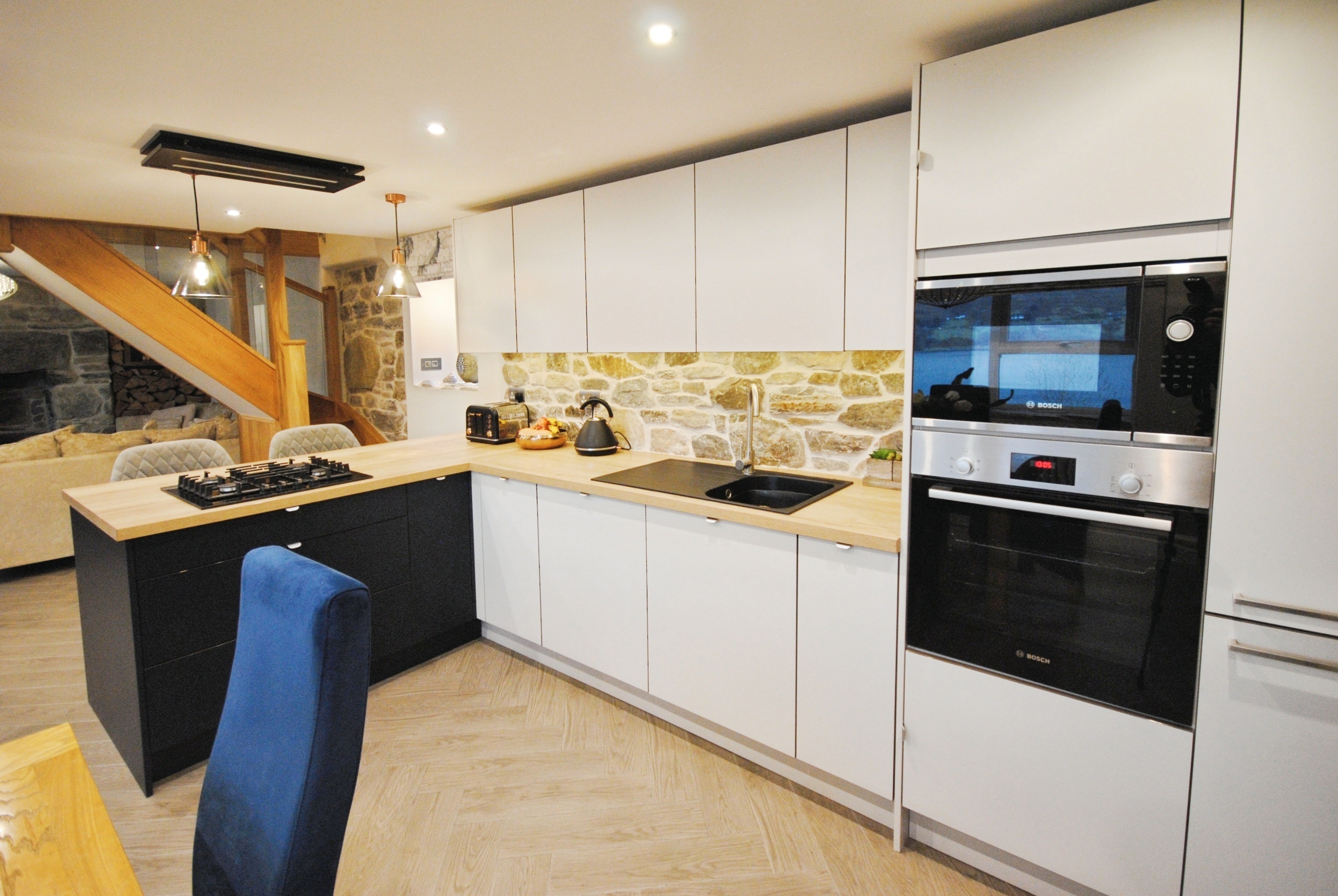 Beautiful, modern kitchen / dining-room. Fitted NEFF gas (LPG) hob, Bosch microwave & electric oven, large fridge / freezer, washing machine, multiple kitchen units and work surfaces. Exposed stone wall as splashbacks. Breakfast bar. Clearview log-burning stove sitting on original stone hearth and exposed wall.