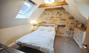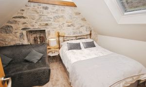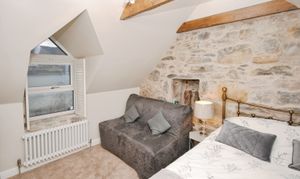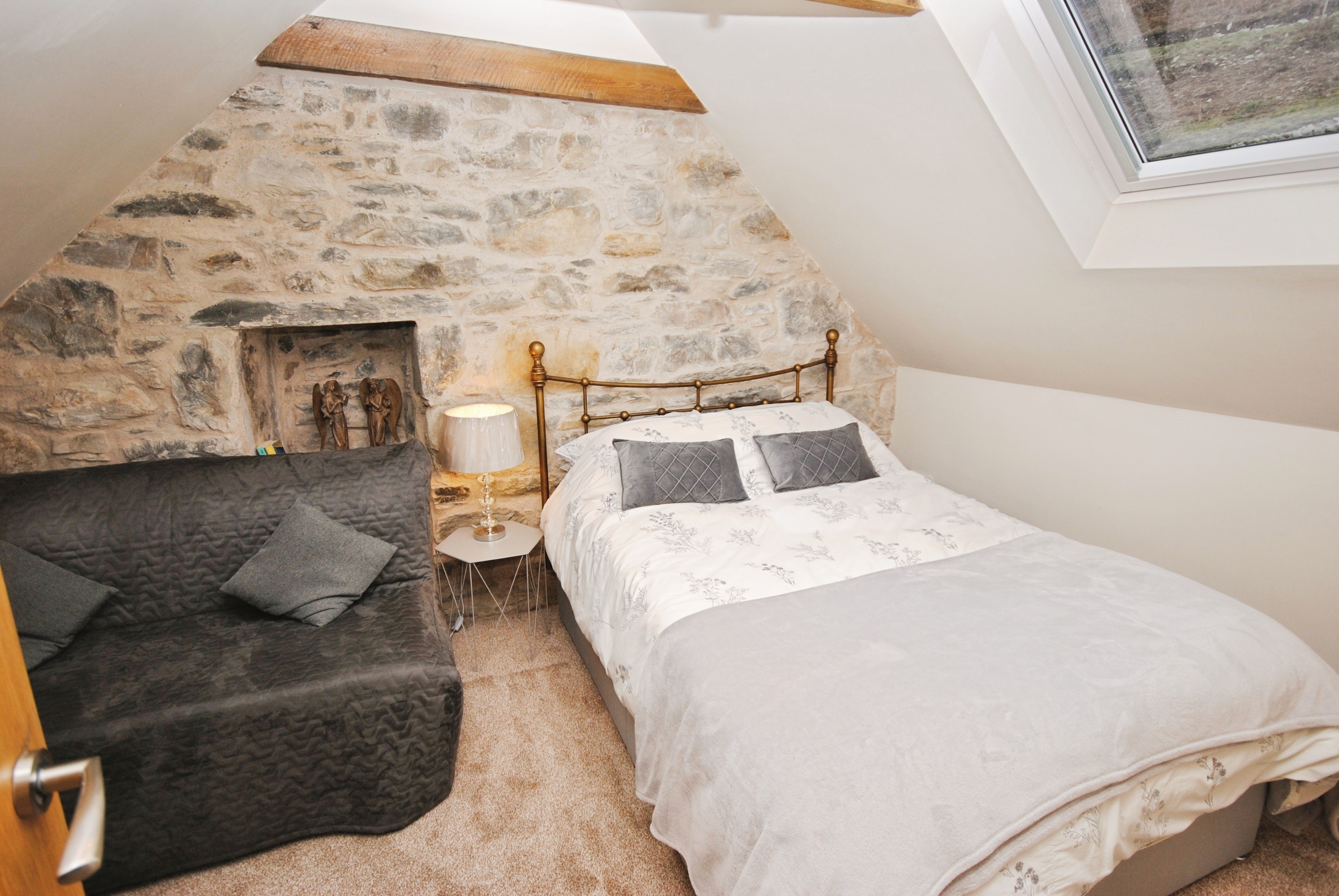 Twin-aspect double bedroom with feature stone wall and window sill, original timber beams. Coombed ceiling and views over Loch Broom.