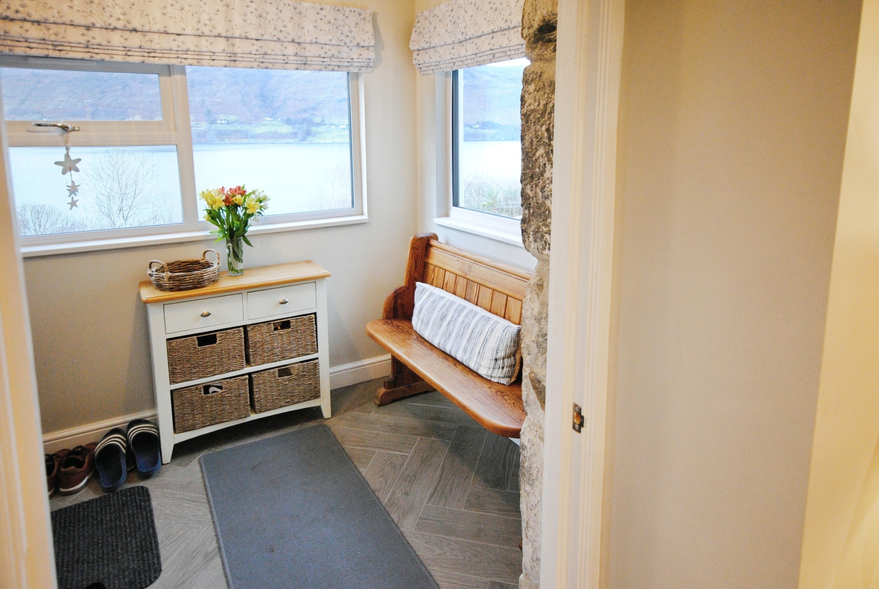 Large entrance vestibule, ideal as a boot room with views across Loch Broom. Vertical radiator.