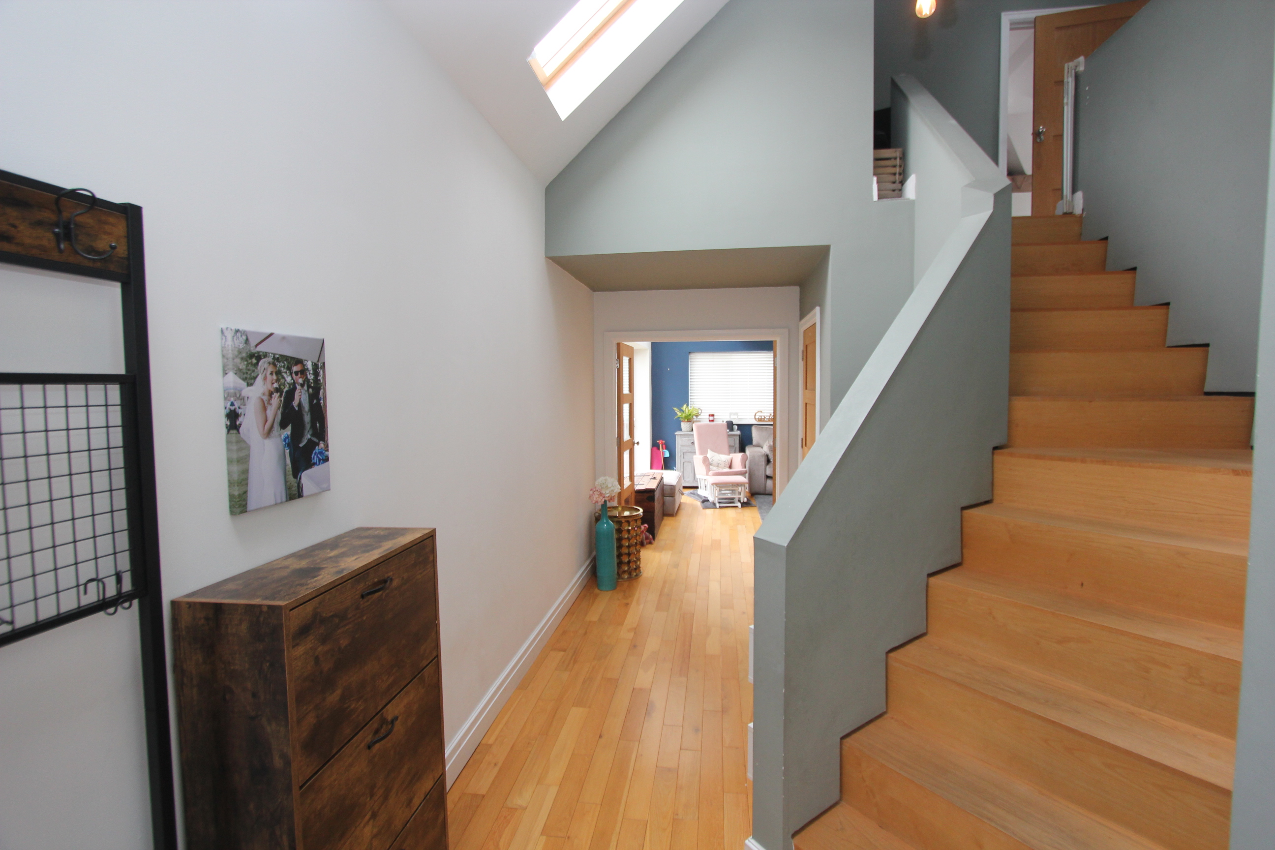 Wood flooring. Stairs to first floor. Front entrance door. Oak doors to bedroom 3, cloakroom/WC and glazed double doors to kitchen/dining/sitting room. Under stairs cupboard.
