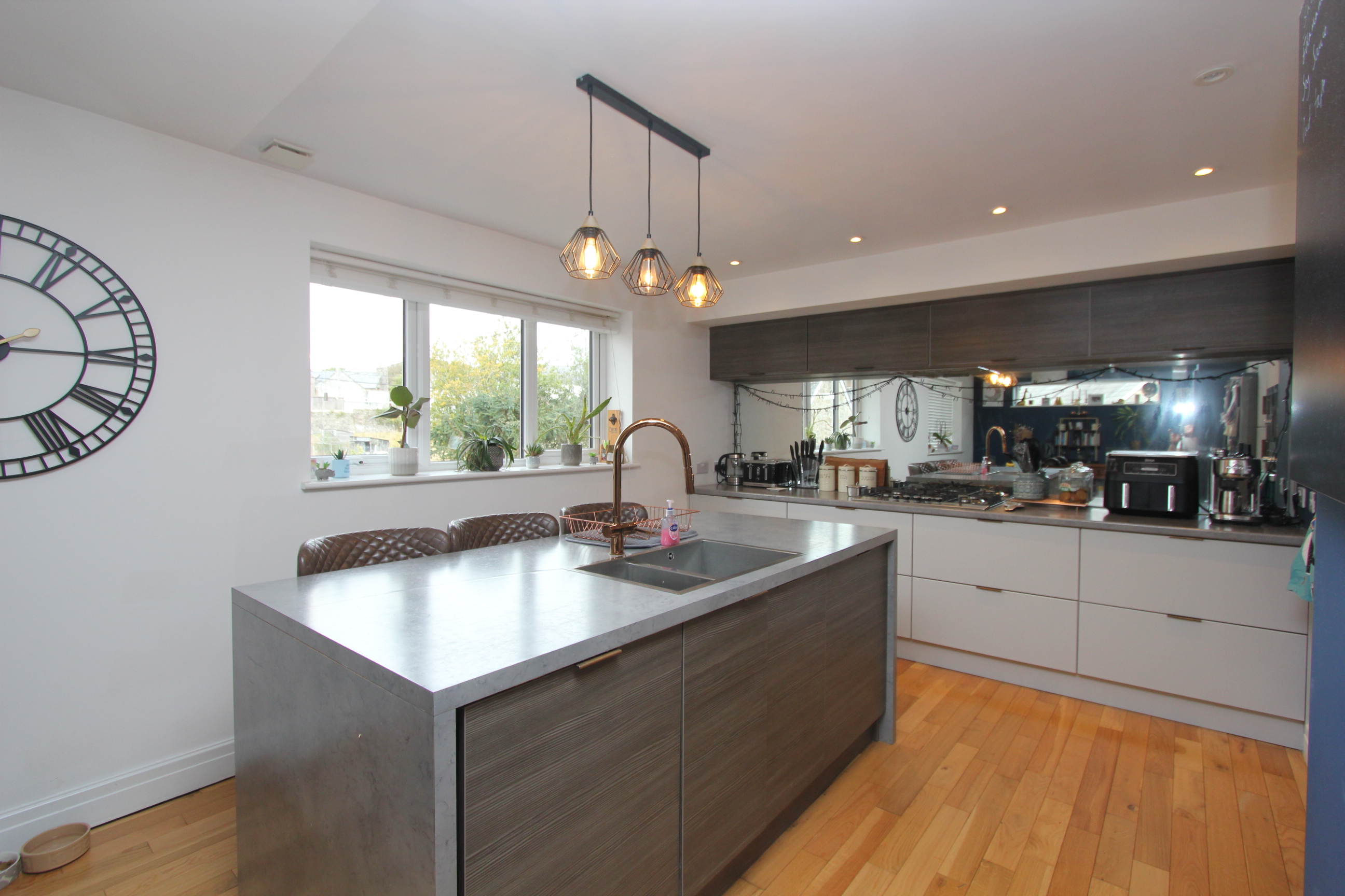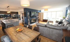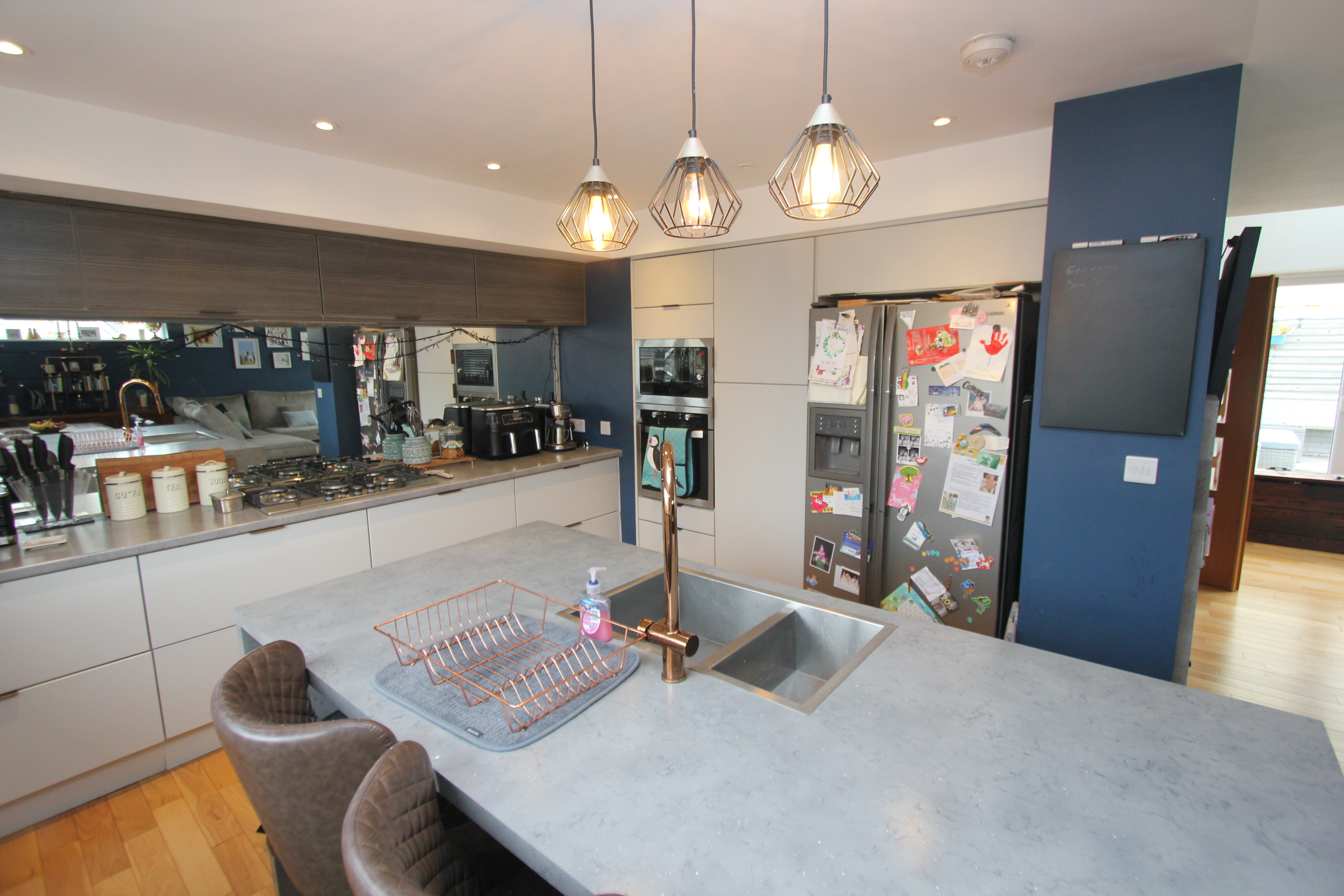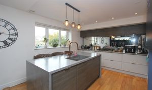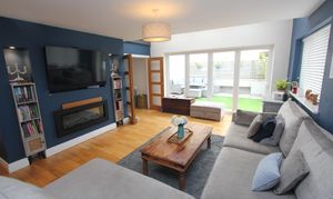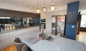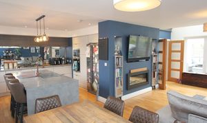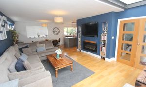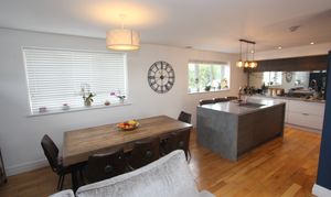 An impressive open plan space comprising; fully fitted kitchen with eye level units base units with drawers and works surfaces over. Island with breakfast bar. UPVC bi-folding doors to rear. Wood flooring. Veluxes to rear. Electric fireplace. Five burner gas hob. Eye level oven and microwave. Space for American style fridge freezer. UPVC windows to side and rear. One and a half bowl stainless steel sink with mixer tap. Integrated dish washer. Down lighting. Space for dining room table and chairs.