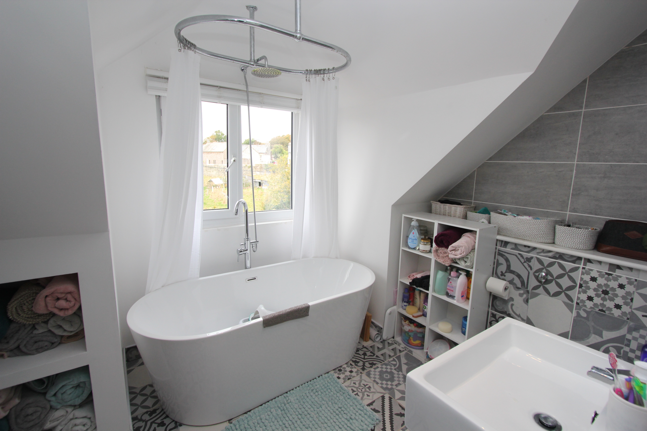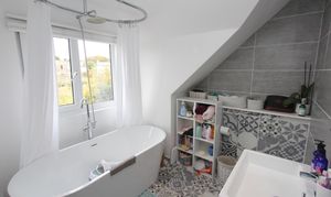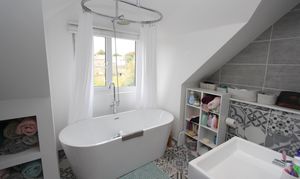 UPVC window to side with views over field. Down lighting. Roll top bath with mixer shower over. Ceramic wash hand basin with mixer water fall style tap. Low level WC. Ceramic wall and floor tiles. Vertical radiator.