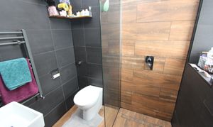 UPVC opaque window to front. Low level WC. Shower enclosure with mixer shower. Wash hand basin with mixer tap. Down lighting. Vertical radiator. Ceramic wall and floor tiles.