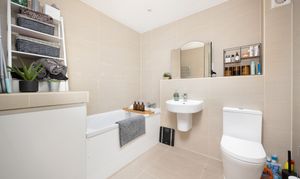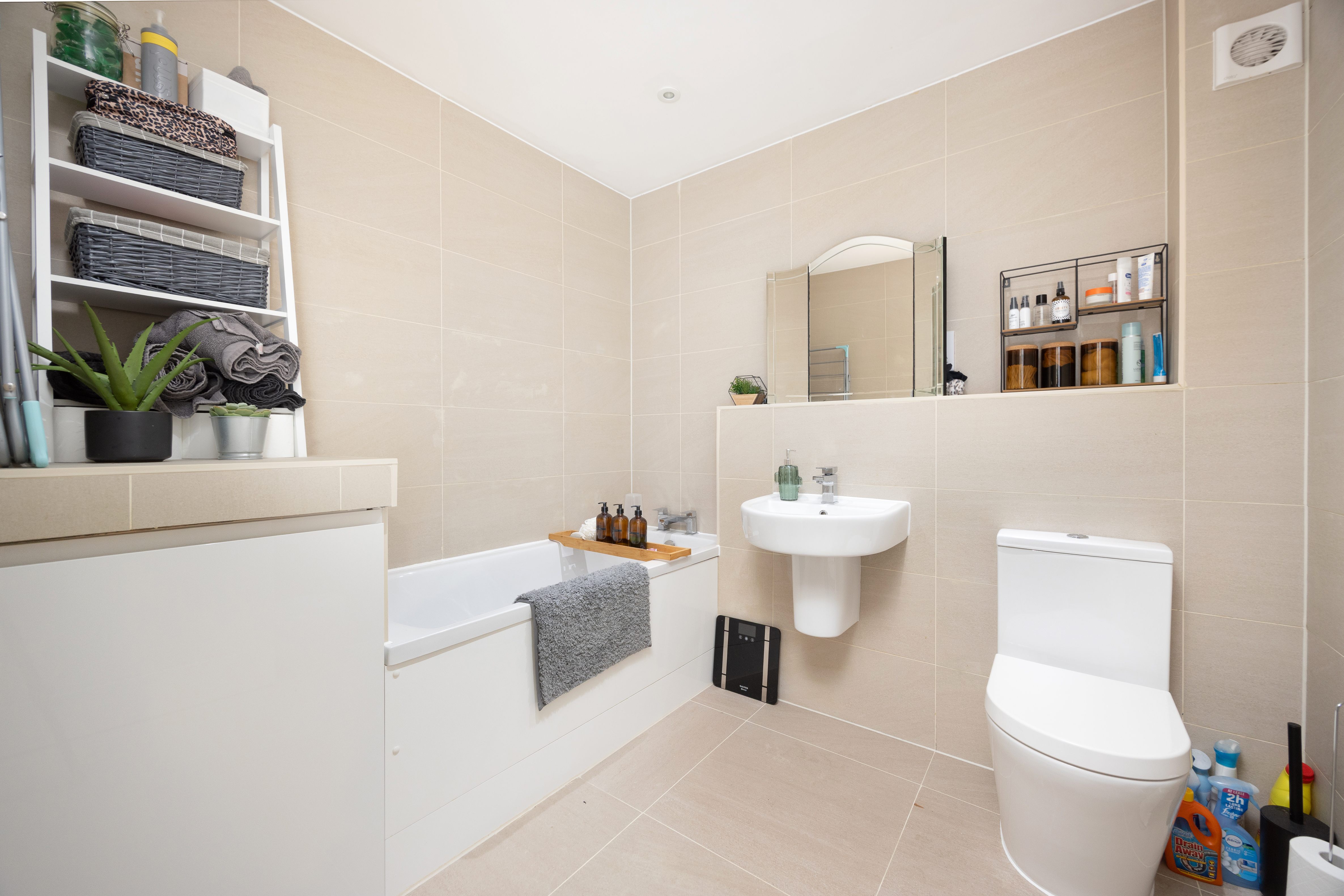 The main bathroom is fitted with a white three‑piece suite including a panelled bath, wash basin and WC with dual flush. Tiled flooring and surrounds create a sleek, modern look, while a heated towel radiator, extractor fan and shaving point add practicality. A built‑in cupboard provides plumbing for a washing machine, keeping appliances neatly tucked away.