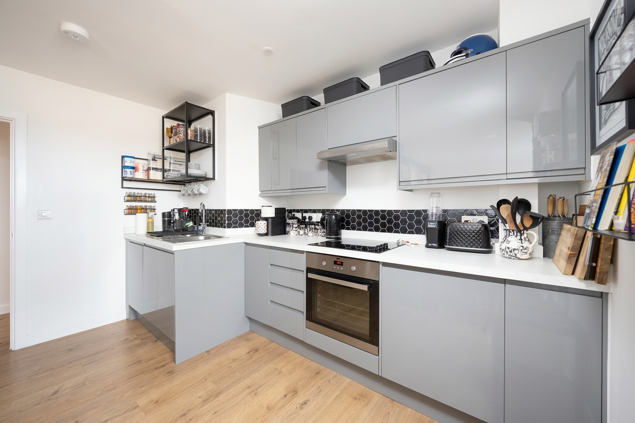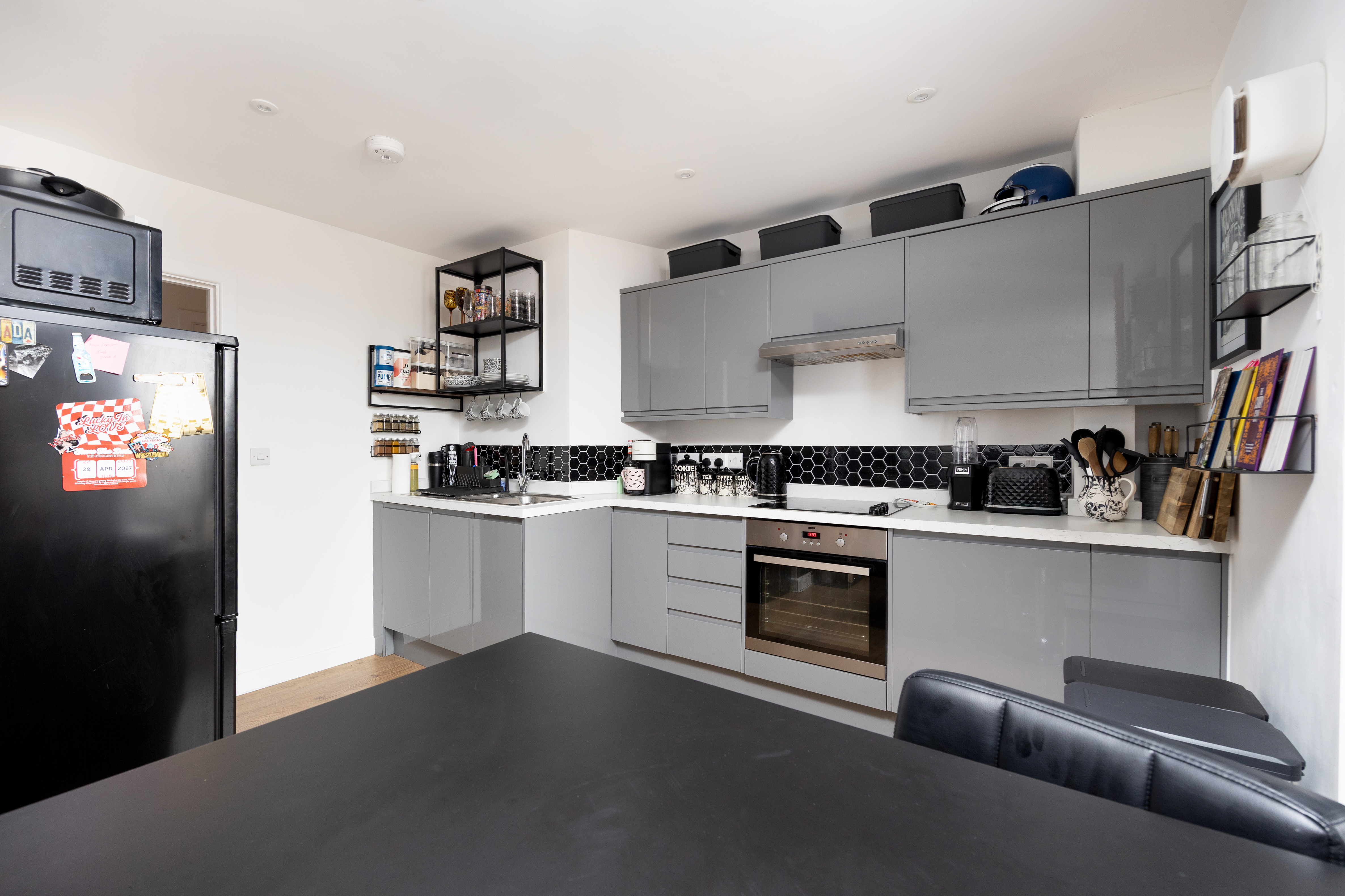 The modern kitchen is fitted with a stylish range of wall, base and drawer units with square‑edge work surfaces. A stainless steel oven, four‑ring hob and extractor are built in, alongside an integrated dishwasher and fridge. There is space for a freestanding fridge/freezer and a dining table, making this a sociable and practical space. A double glazed door opens directly onto the balcony, allowing natural light to fill the room.