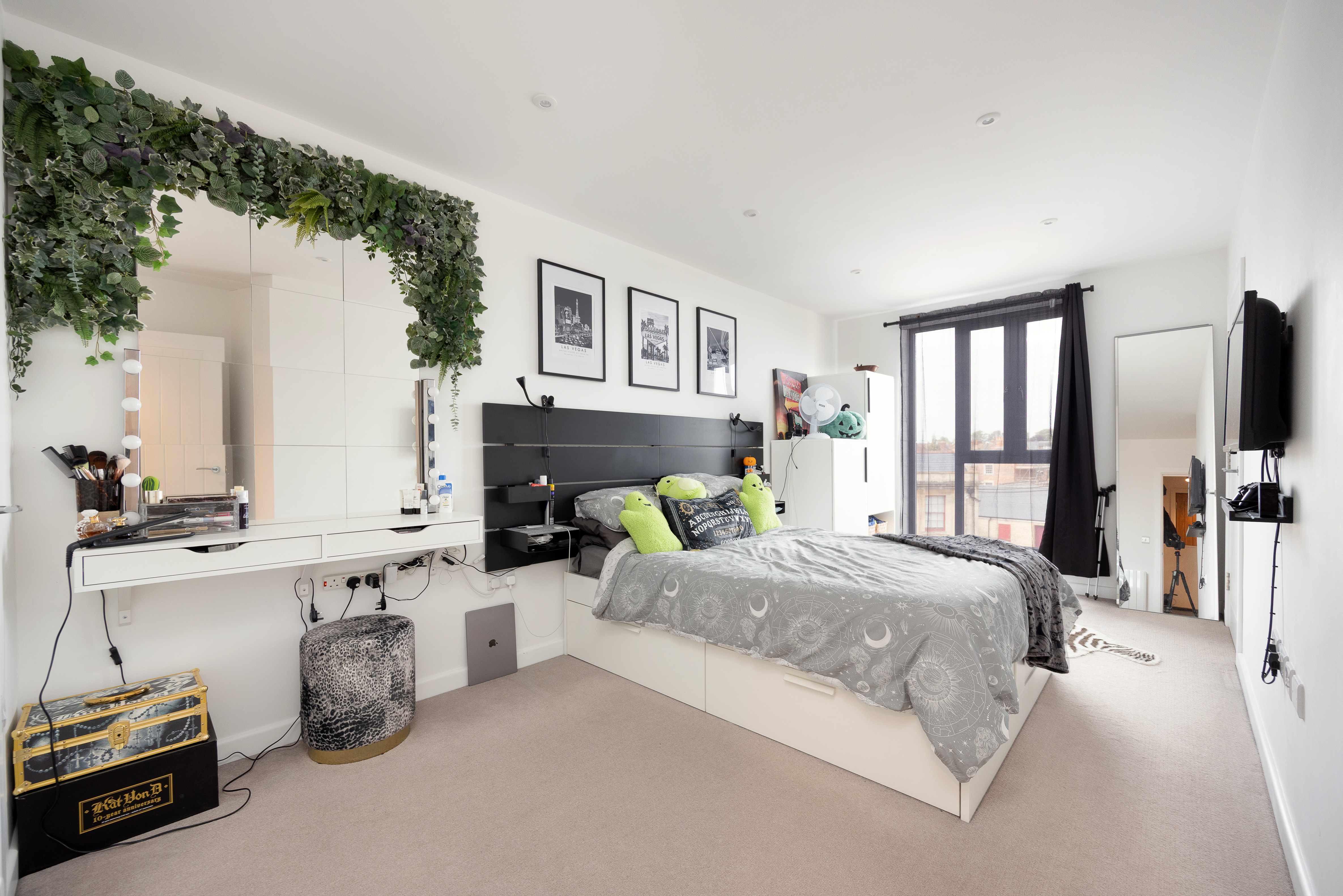 The main bedroom is an impressively sized double room with a rear‑facing double glazed window. It includes an electric heater, inset ceiling spotlights and a built‑in storage cupboard. The room also benefits from its own en‑suite shower room, offering privacy and convenience.