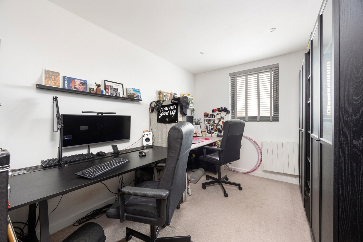 The second bedroom is a well‑proportioned room with a side‑facing double glazed window. It features an electric heater and inset ceiling spotlights, making it suitable as a guest room, home office or nursery.