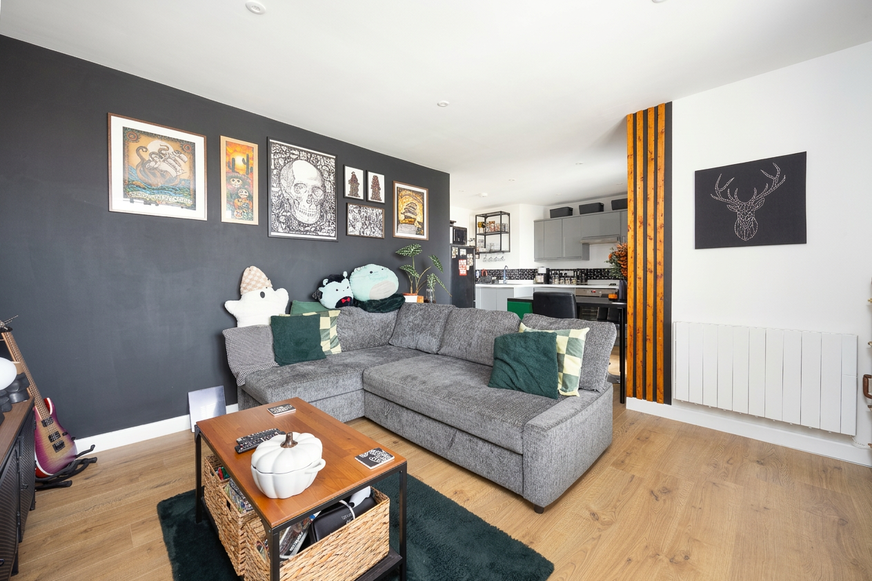Open plan to the kitchen, the living area offers a comfortable and versatile space for relaxing or entertaining. A large double glazed window overlooks the rear of the building, while wood‑effect flooring and inset spotlights create a contemporary feel. An electric heater and TV point complete the room.