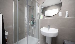 The en‑suite is fitted with a contemporary three‑piece suite comprising a corner shower with rainfall head and additional attachment, a wash basin and a WC with dual flush. Tiled surrounds and flooring give a clean, modern finish, complemented by a heated towel radiator, extractor fan, shaving point and inset spotlights.