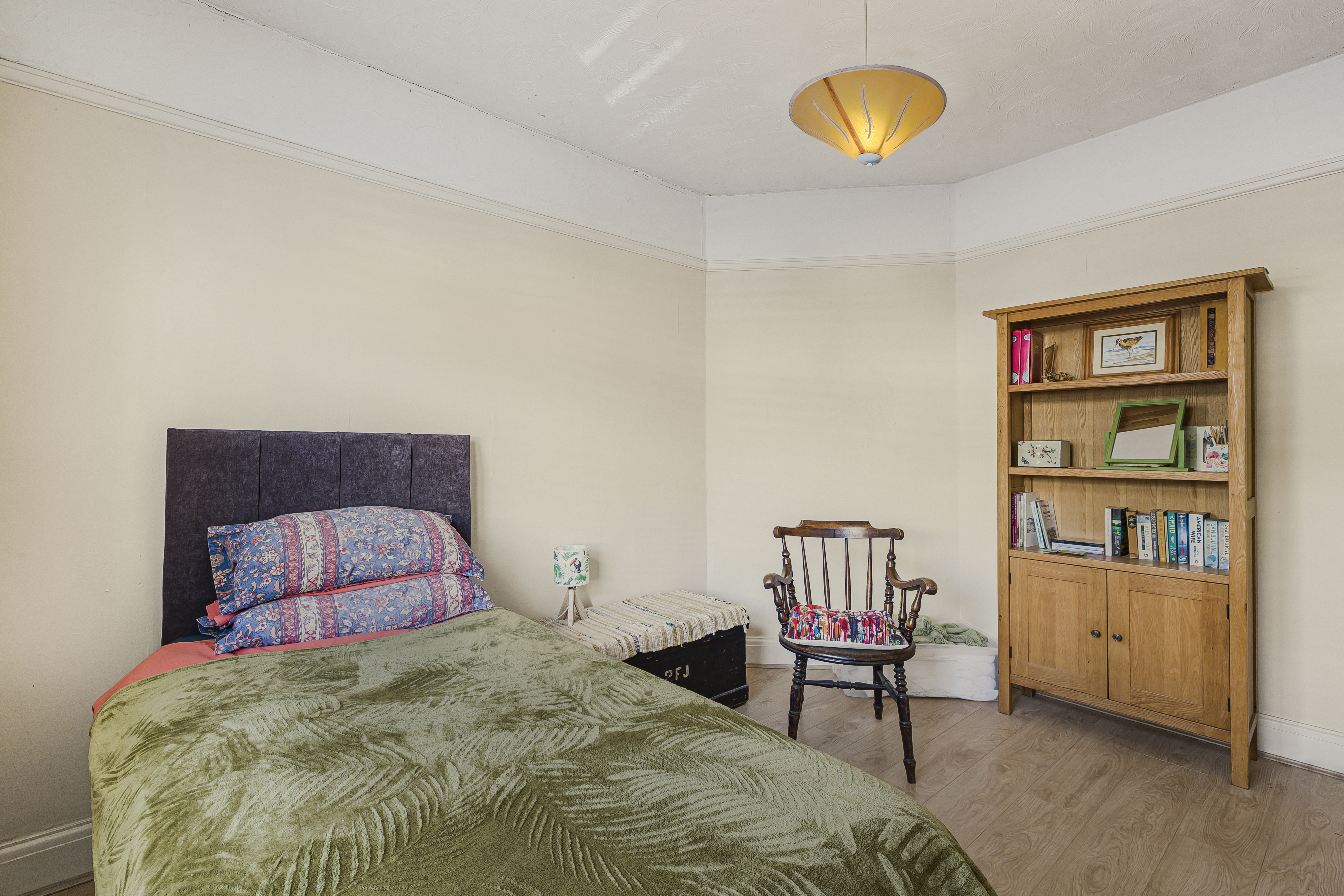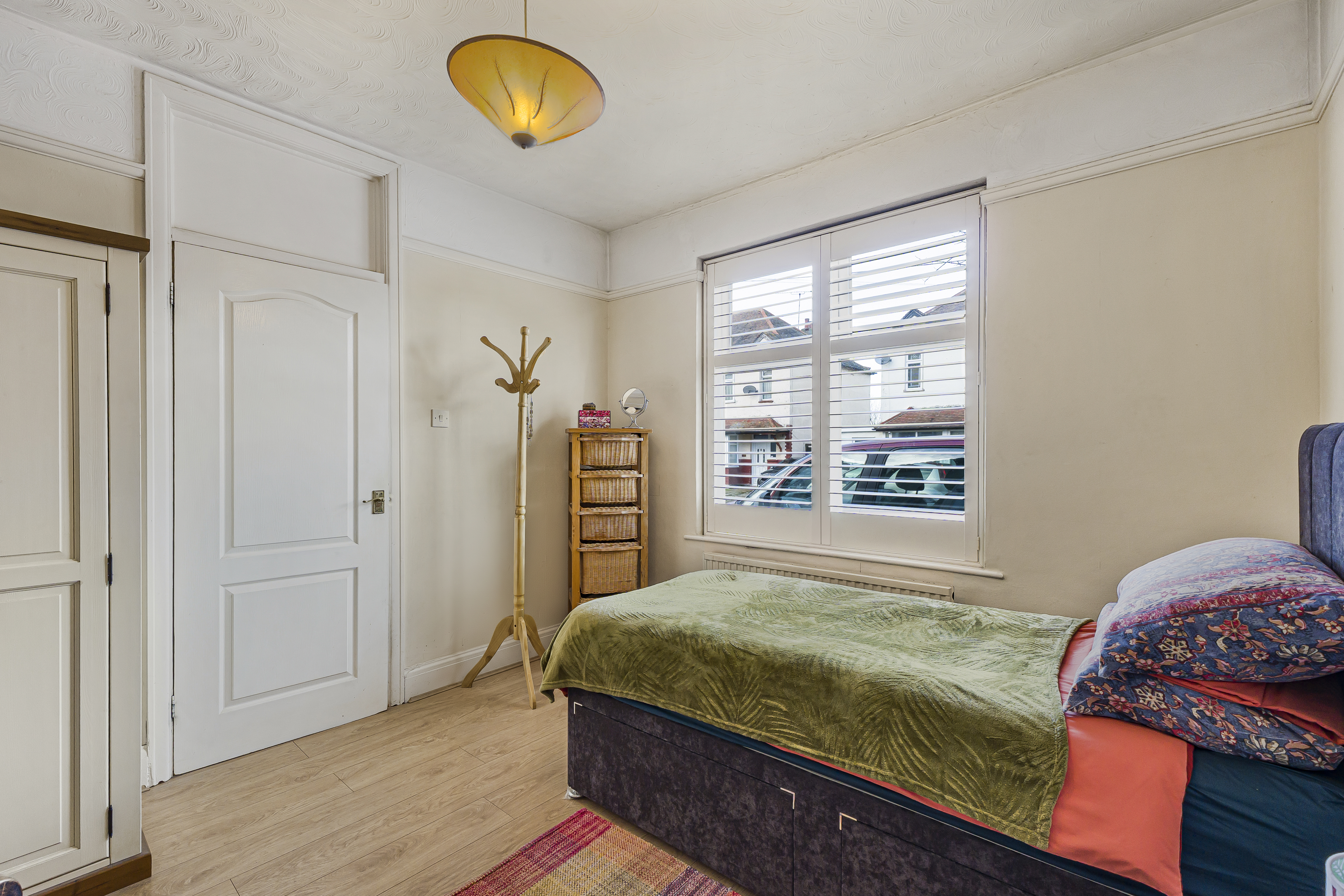 The property is approached via a useful porch which opens into a central entrance hall, providing access to the loft space – part boarded and complete with power and lighting – ideal for storage or future development. To the front of the bungalow are two well-proportioned double bedrooms, including an impressive bay-fronted principal bedroom with ample space for king-size furniture and stylish plantation shutters. The second bedroom is another excellent double, also fitted with plantation shutters, making both rooms bright yet private.