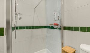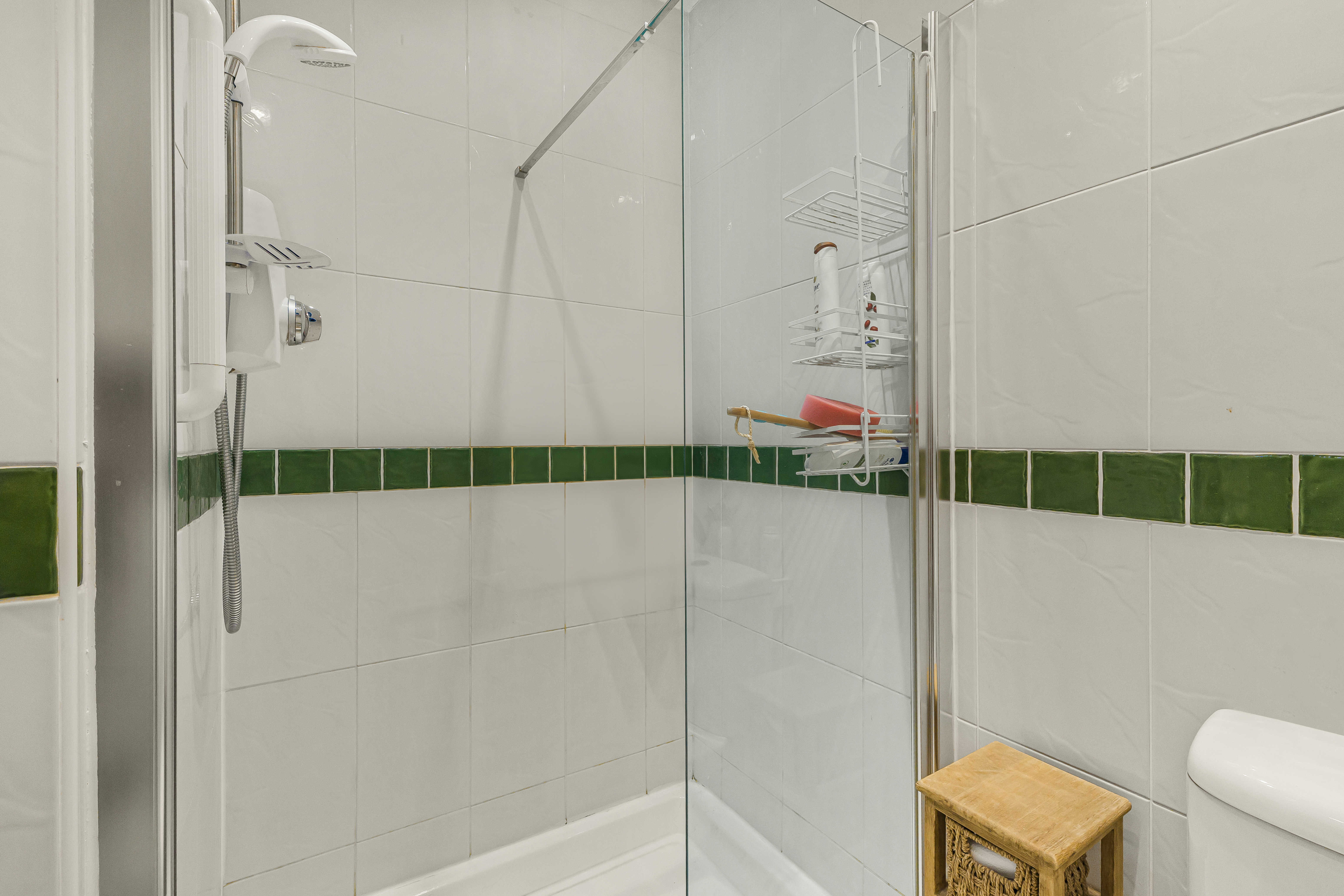 - Modern three-piece shower room with walk-in shower and excellent built-in storage