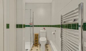 Also off the hallway is a modern three-piece shower room, featuring a large walk-in shower, built-in storage and a tall heated towel rail, creating a practical and well-finished space for everyday living.