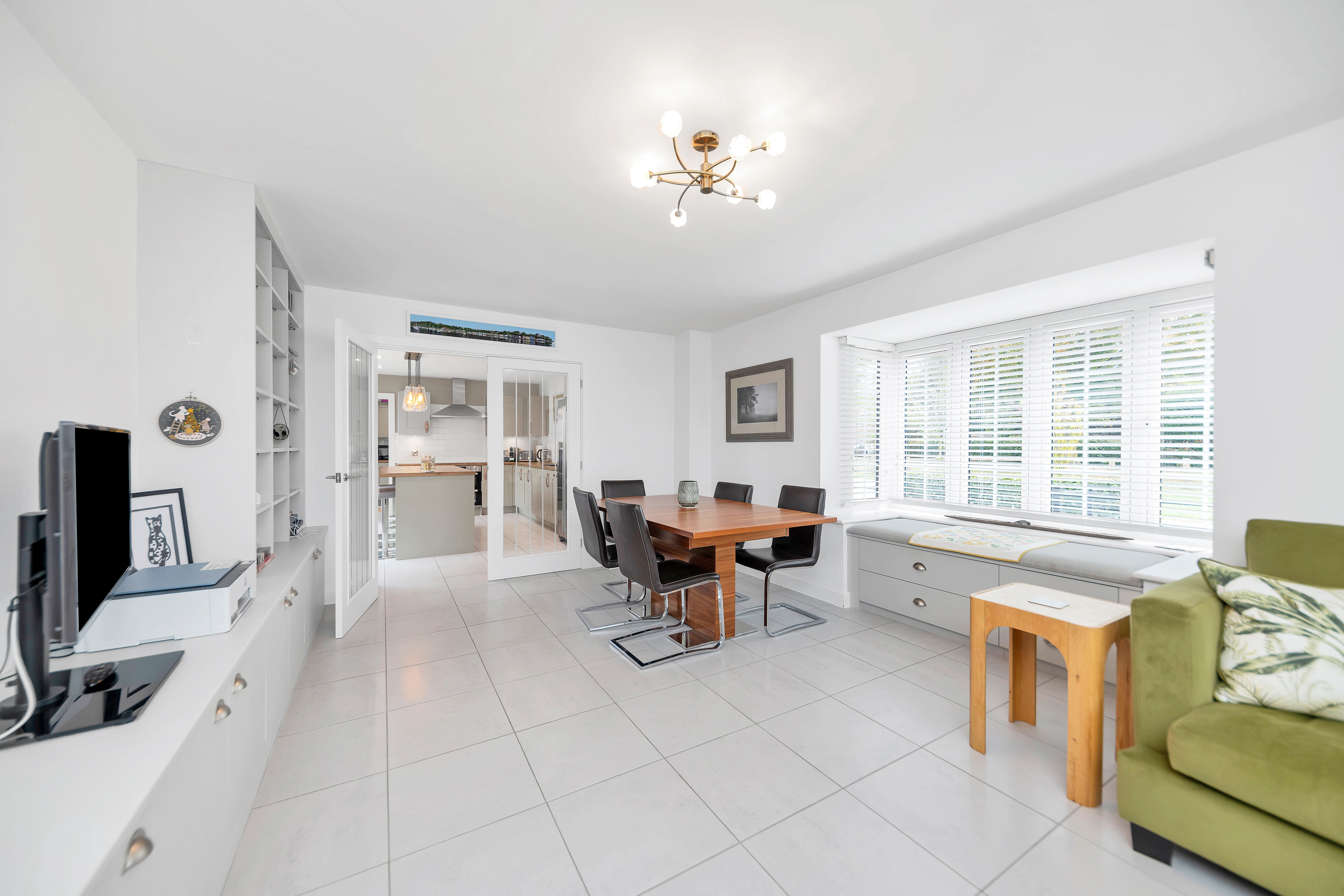 The lounge is a beautifully presented and comfortable space, enjoying a window to a front aspect, double French doors to the rear, a fireplace with a wood-burning stove, plush carpets, pendant lighting and ample room for a variety of lounge and storage furniture. The dining room offers further versatile reception space, with beautiful windows to a dual aspect, tiled flooring, pendant lighting and room for a large dining setting and further seating.