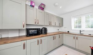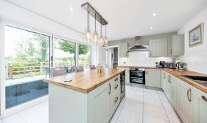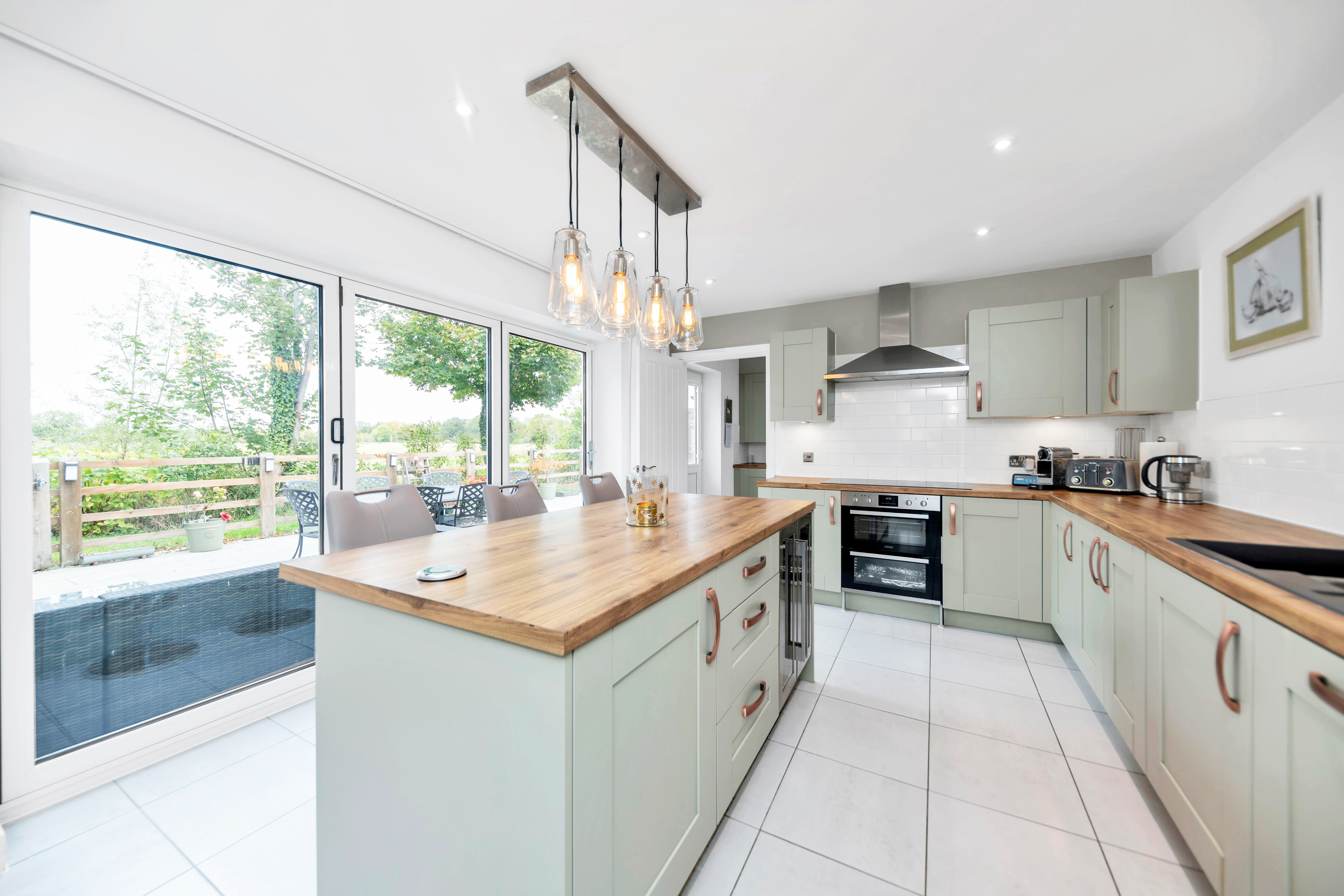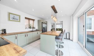 The kitchen/breakfast room is wonderfully spacious, enjoying windows and bi-fold doors which lead out into the garden, making it a fantastic entertaining space. There is a range of modern base and wall units, a large island/breakfast bar, wood worktops, an extractor, tiled flooring and splashbacks, inset, pendant and under-cabinet lighting, an integrated oven, hob and wine cooler, and space for other small kitchen appliances. The utility room enjoys matching units, further storage, access to the garden, and space for large laundry appliances.