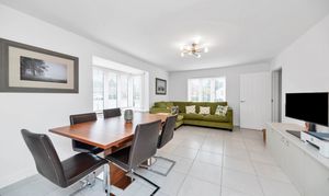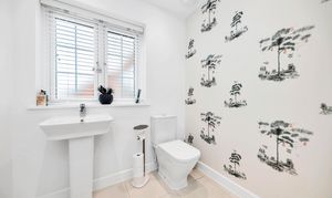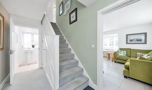 This spacious property offers excellent kerb appeal, with an attractive frontage of exposed brick and cream render, a covered porchway, borders of shrubs and hedgerows, and gated side access to the rear garden. Upon stepping inside, the entrance hallway is bright, wide and welcoming, benefiting from carpets, pendant lighting, room for furniture, stairs to the first floor, and doors through to the downstairs living space, including a cloakroom WC.