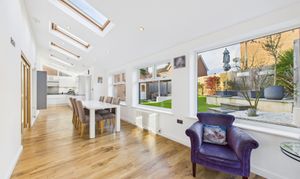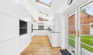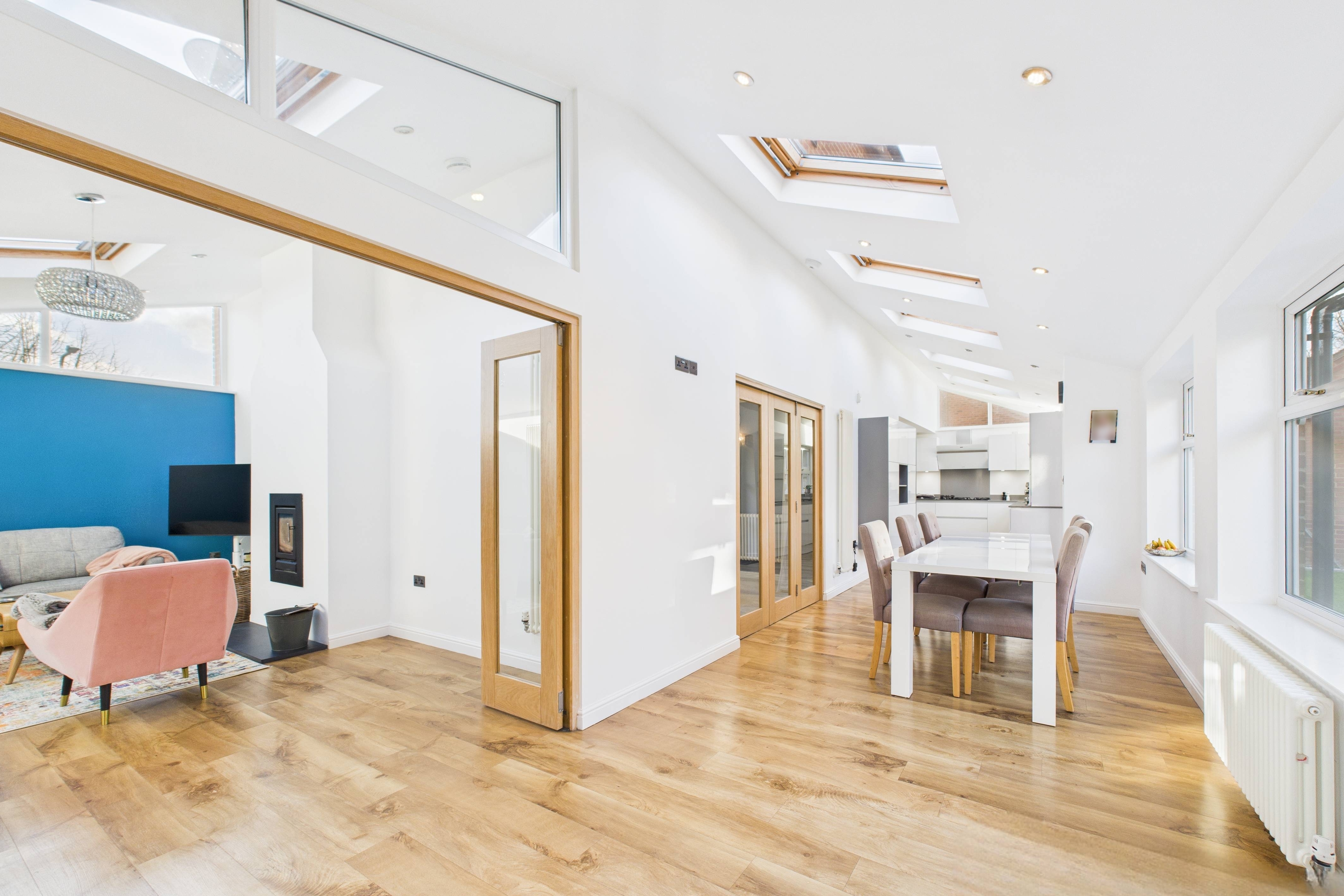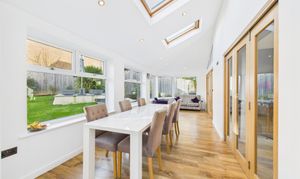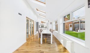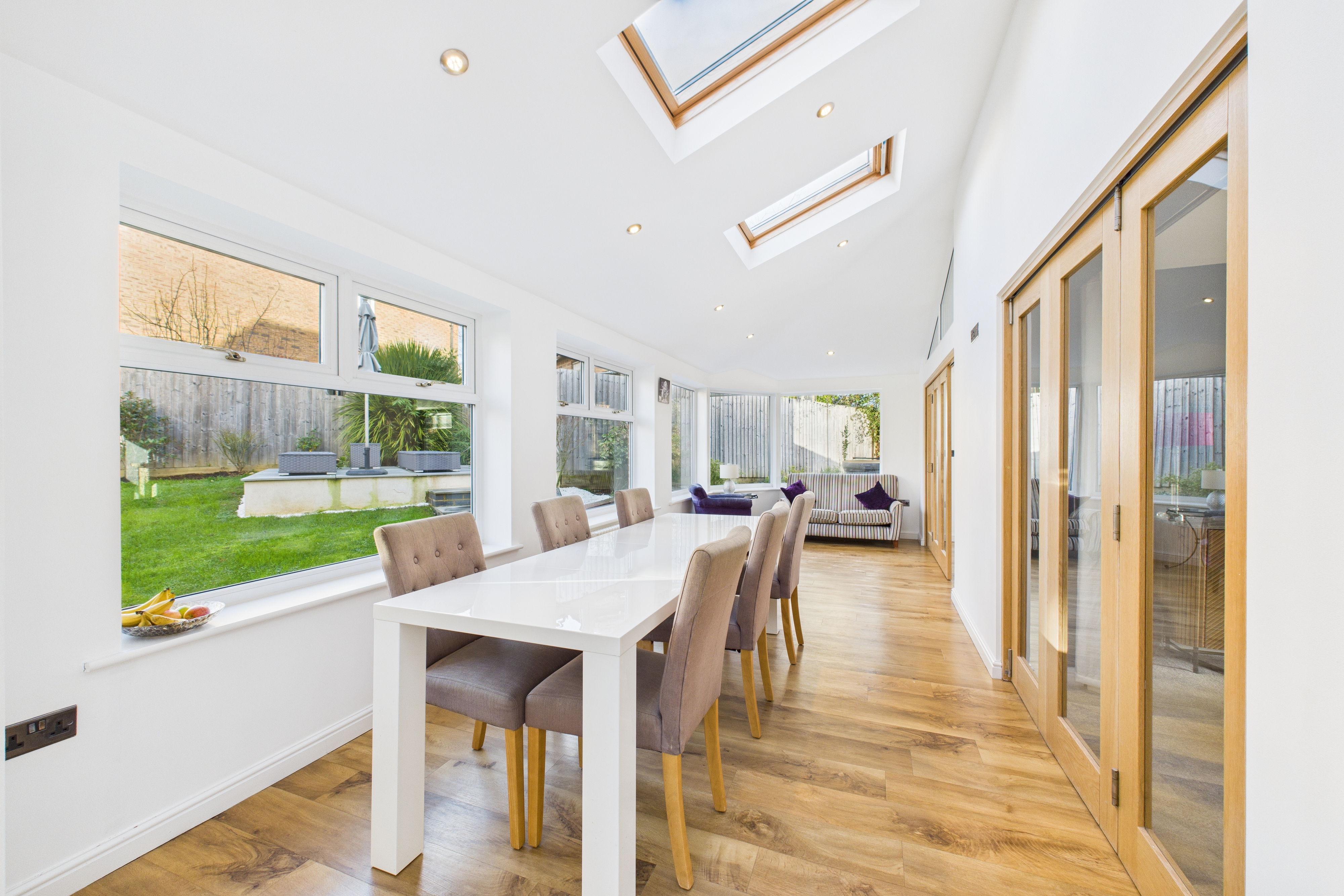 At the heart of the home sits the remarkable open-plan kitchen diner, a standout space designed for modern family life. The sleek white kitchen boasts excellent built-in storage, wall and base units, integrated appliances including a double raised oven, a contemporary extractor with splashback and French doors leading to the private rear garden. Flooded with natural light from windows, skylights and glazed doors, the dining area is the perfect setting for relaxed everyday meals or entertaining guests.