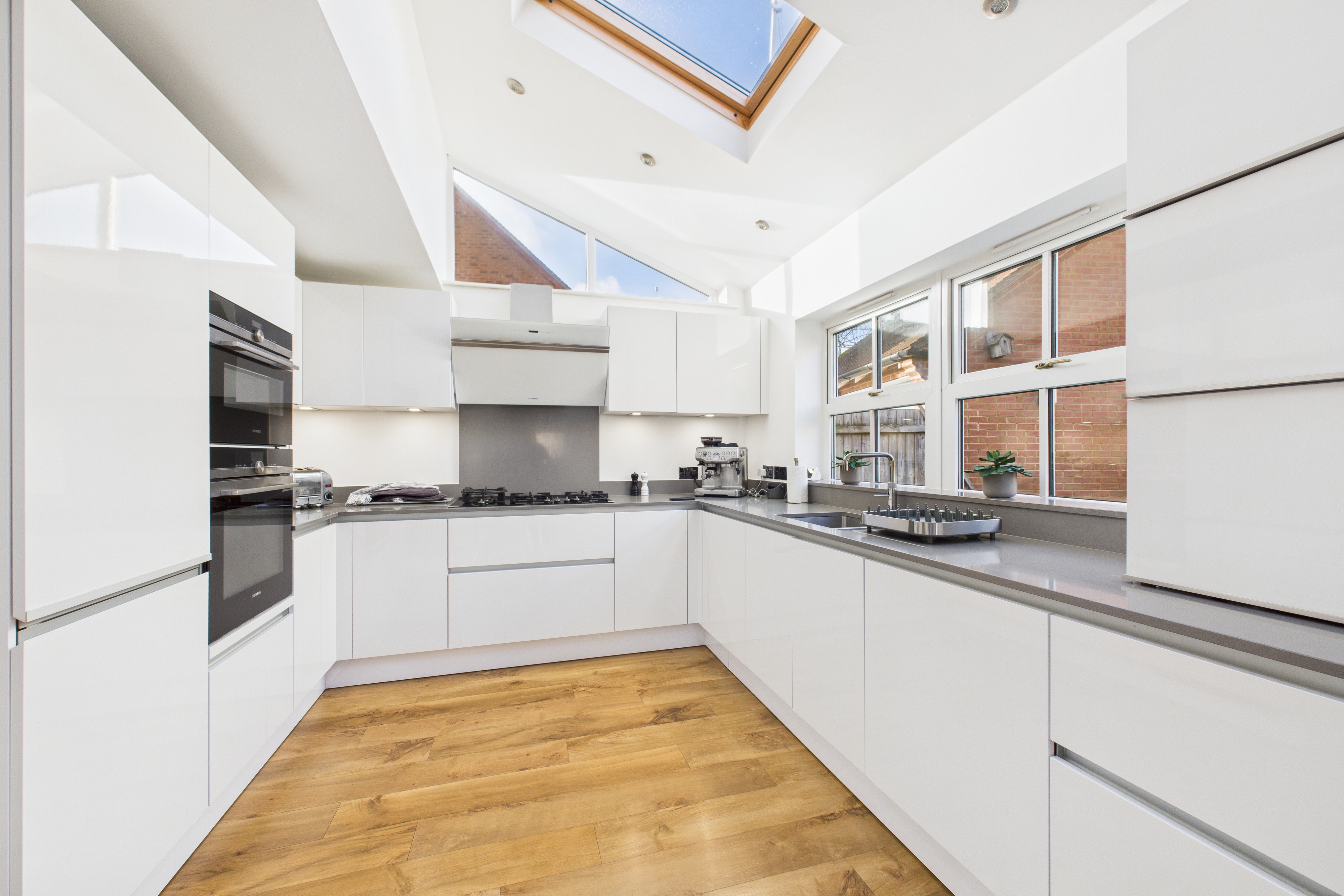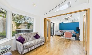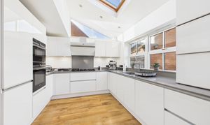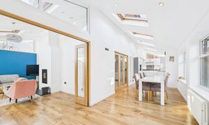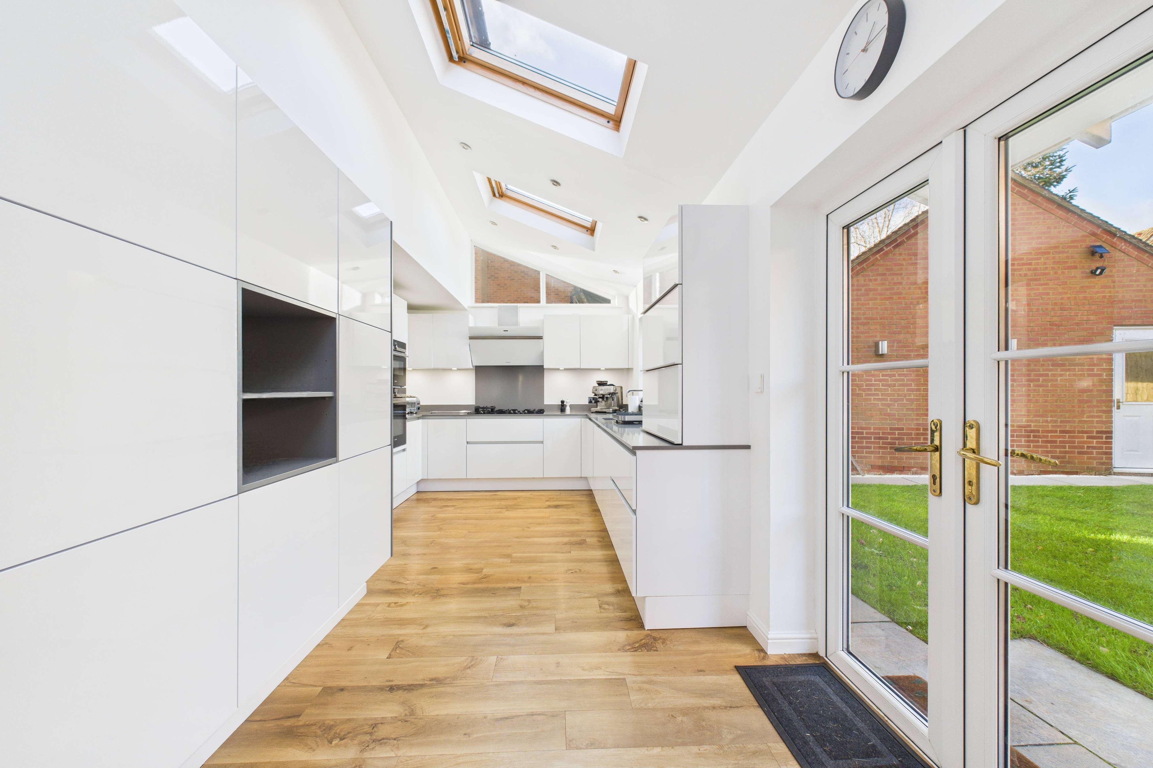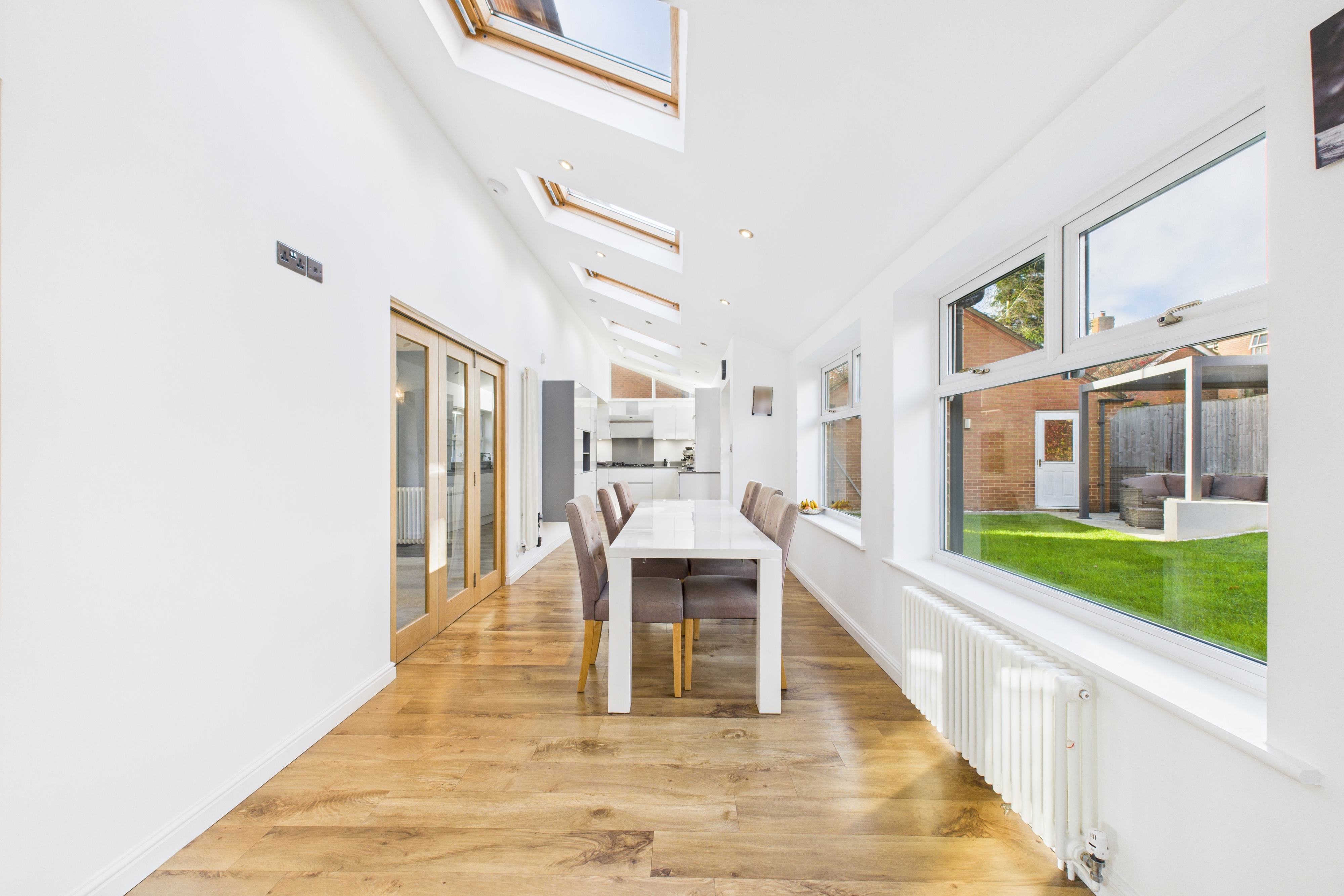 At the heart of the home sits the remarkable open-plan kitchen diner, a standout space designed for modern family life. The sleek white kitchen boasts excellent built-in storage, wall and base units, integrated appliances including a double raised oven, a contemporary extractor with splashback and French doors leading to the private rear garden. Flooded with natural light from windows, skylights and glazed doors, the dining area is the perfect setting for relaxed everyday meals or entertaining guests.