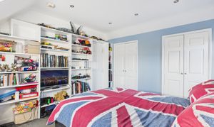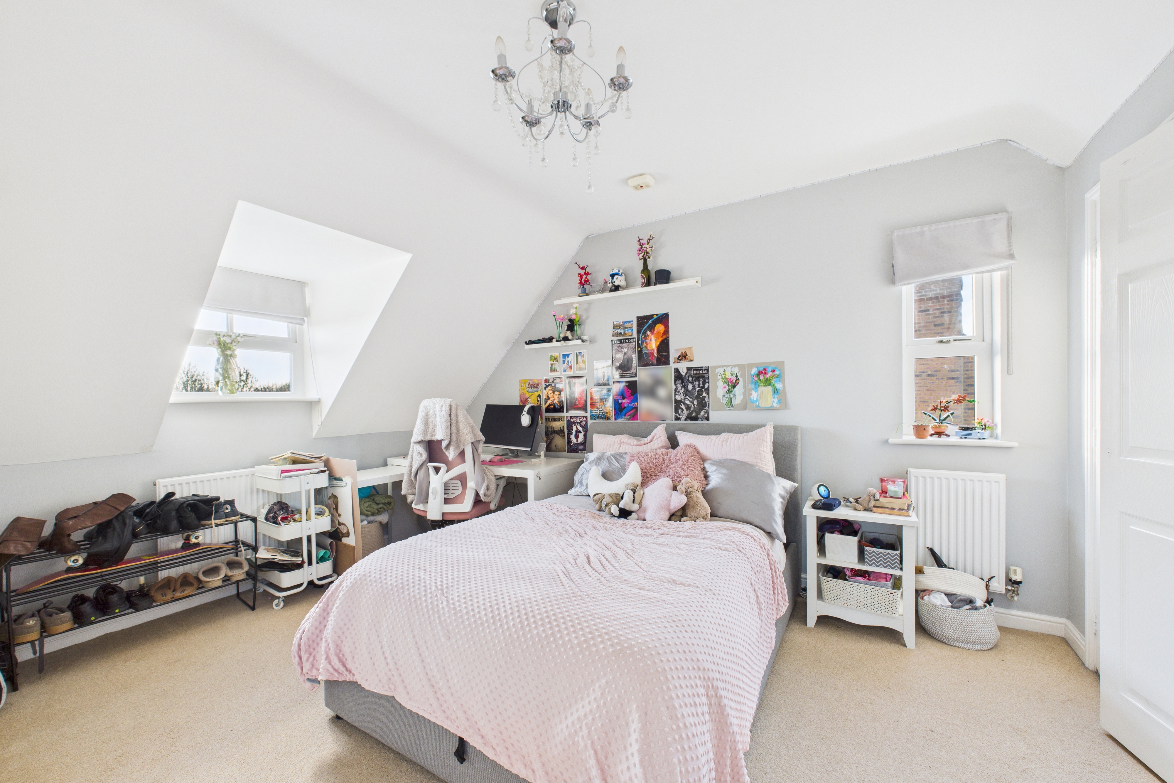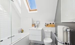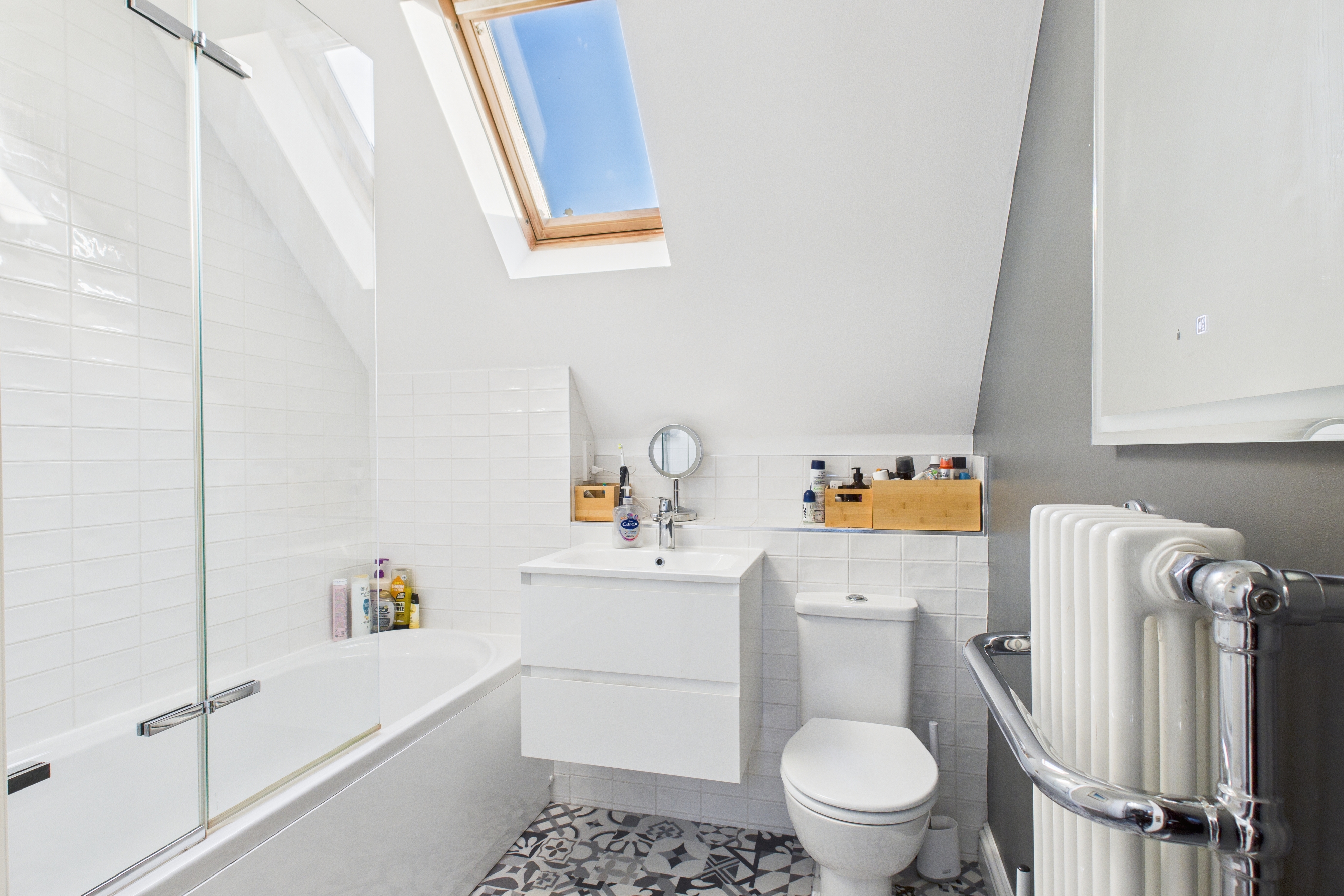 The second floor features two further double bedrooms, both with built-in wardrobes and skylights that fill the rooms with natural light. A contemporary family bathroom serves this level.