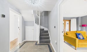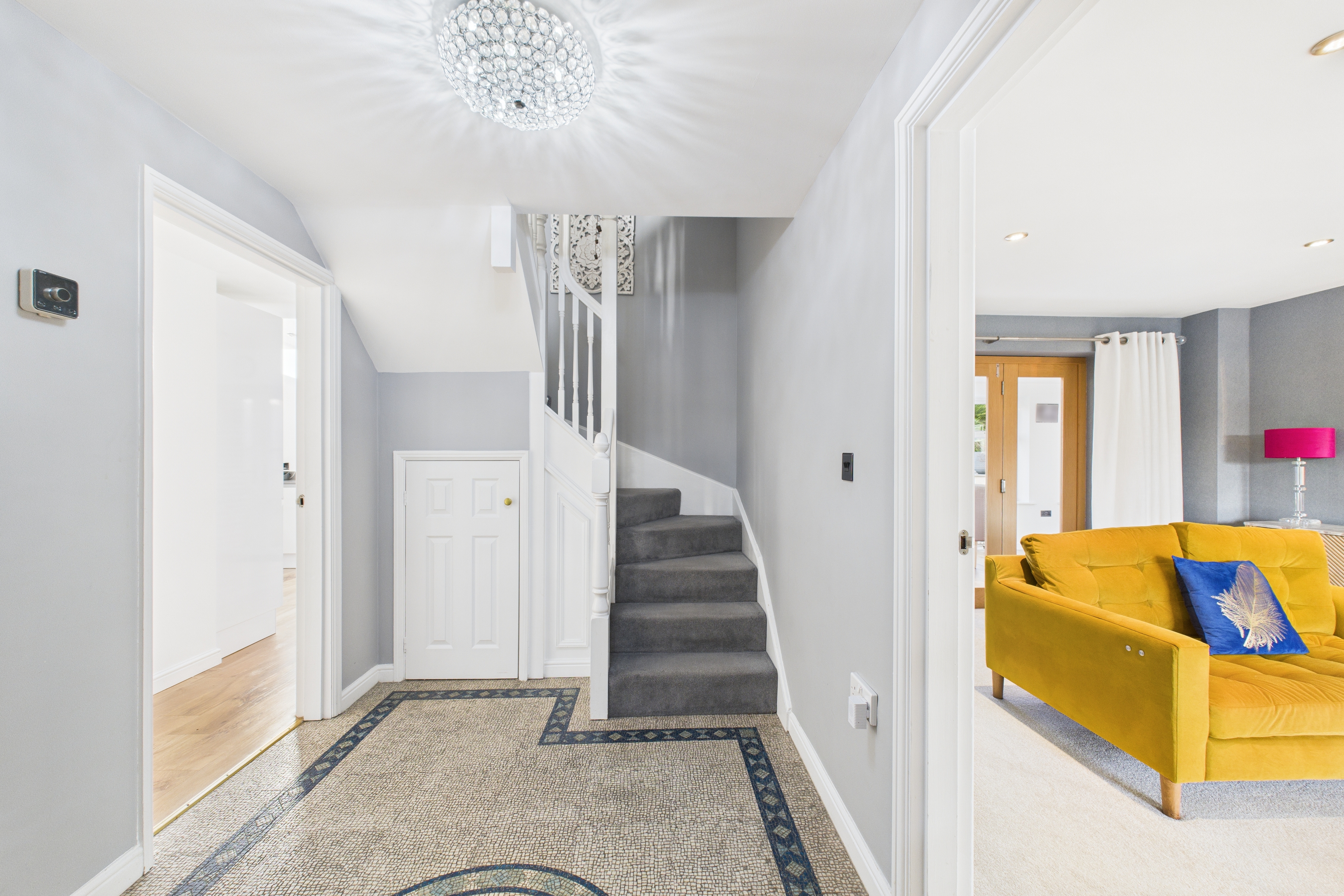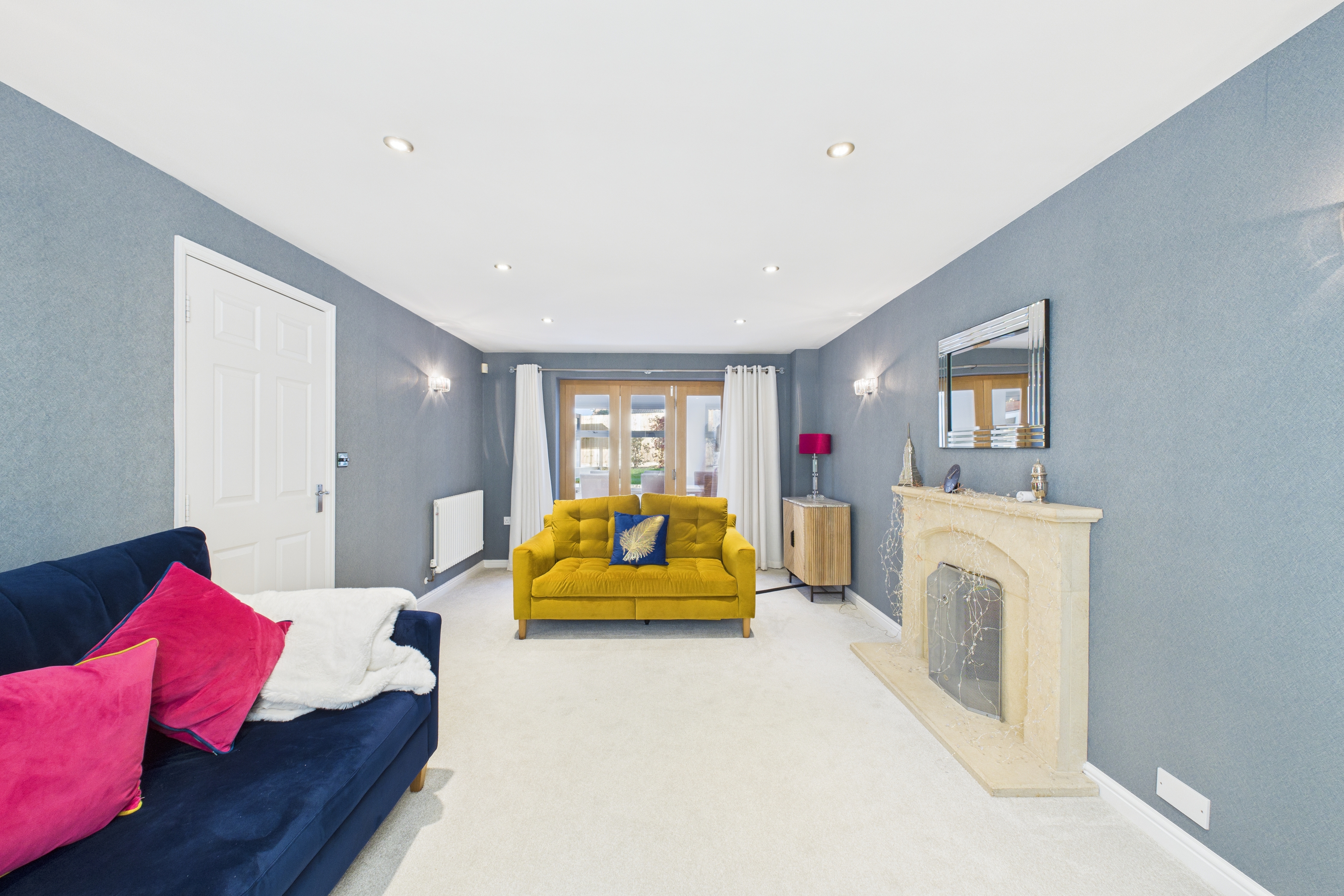 Stepping inside, a welcoming entrance hall sets the tone for the quality and elegance found throughout this superb home. The large main living room offers a sophisticated yet cosy atmosphere, complete with a central fireplace, modern spotlights, generous space for furnishings and stylish bi-folding doors connecting effortlessly to the dining area.
