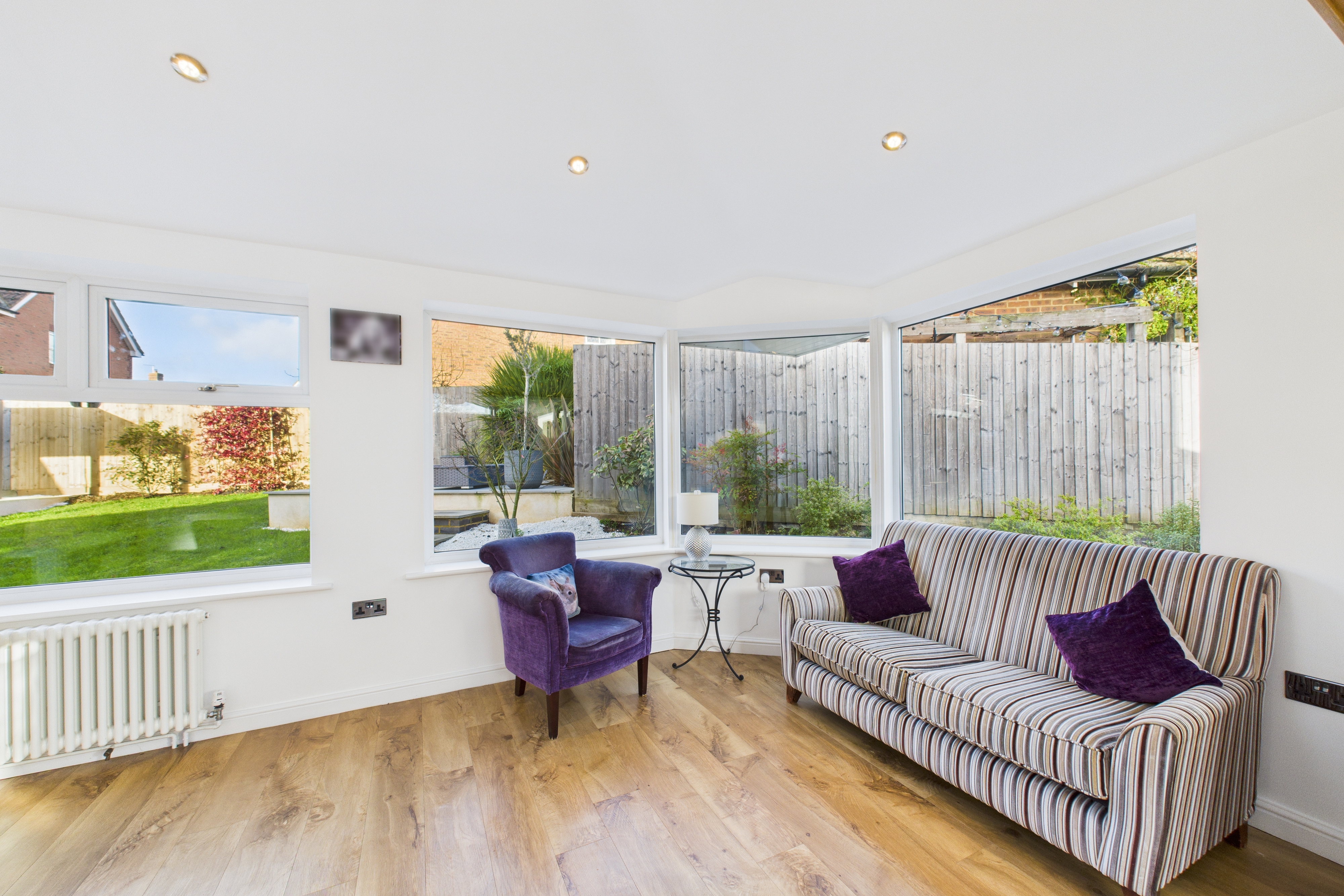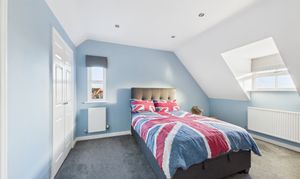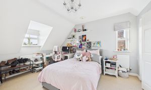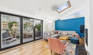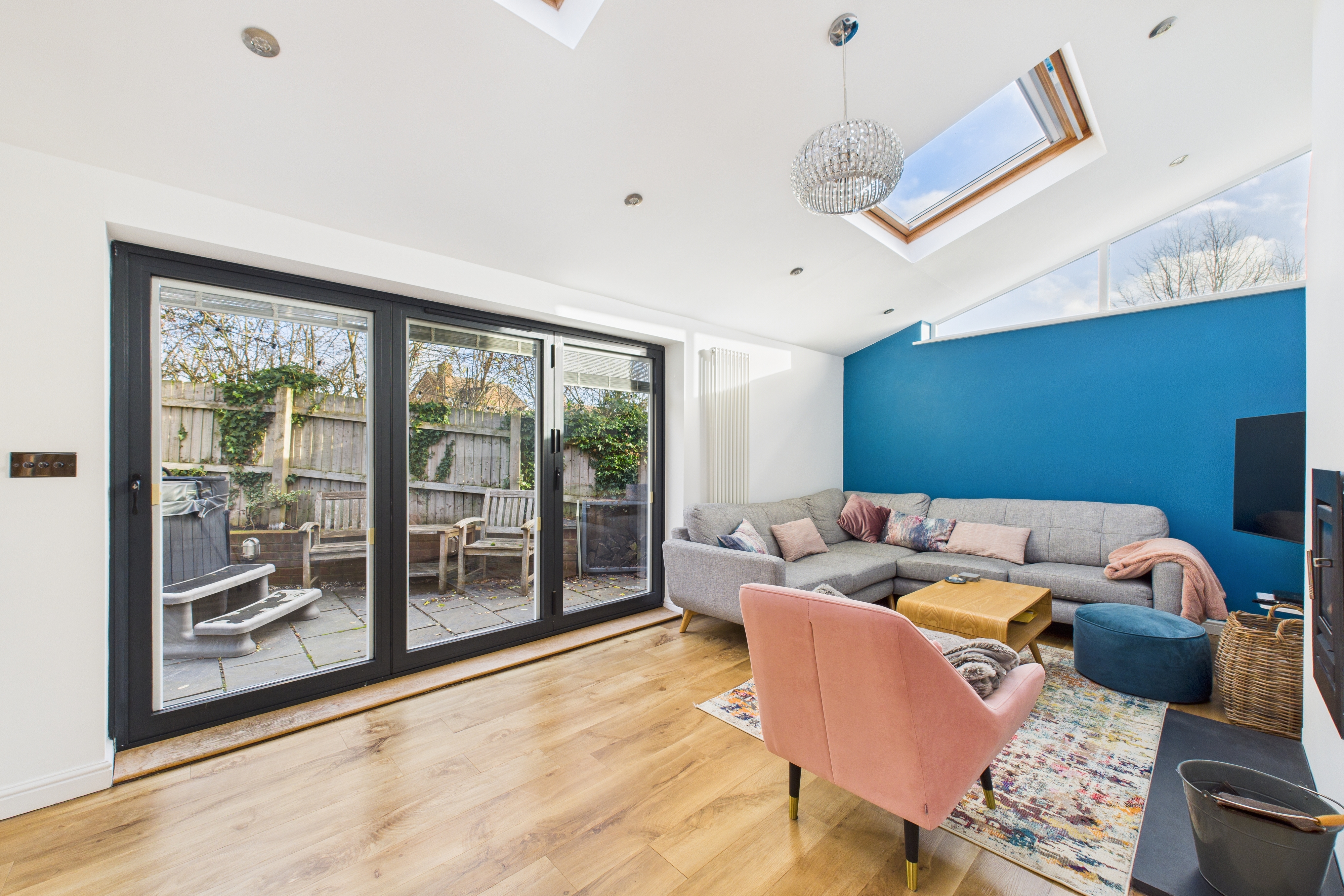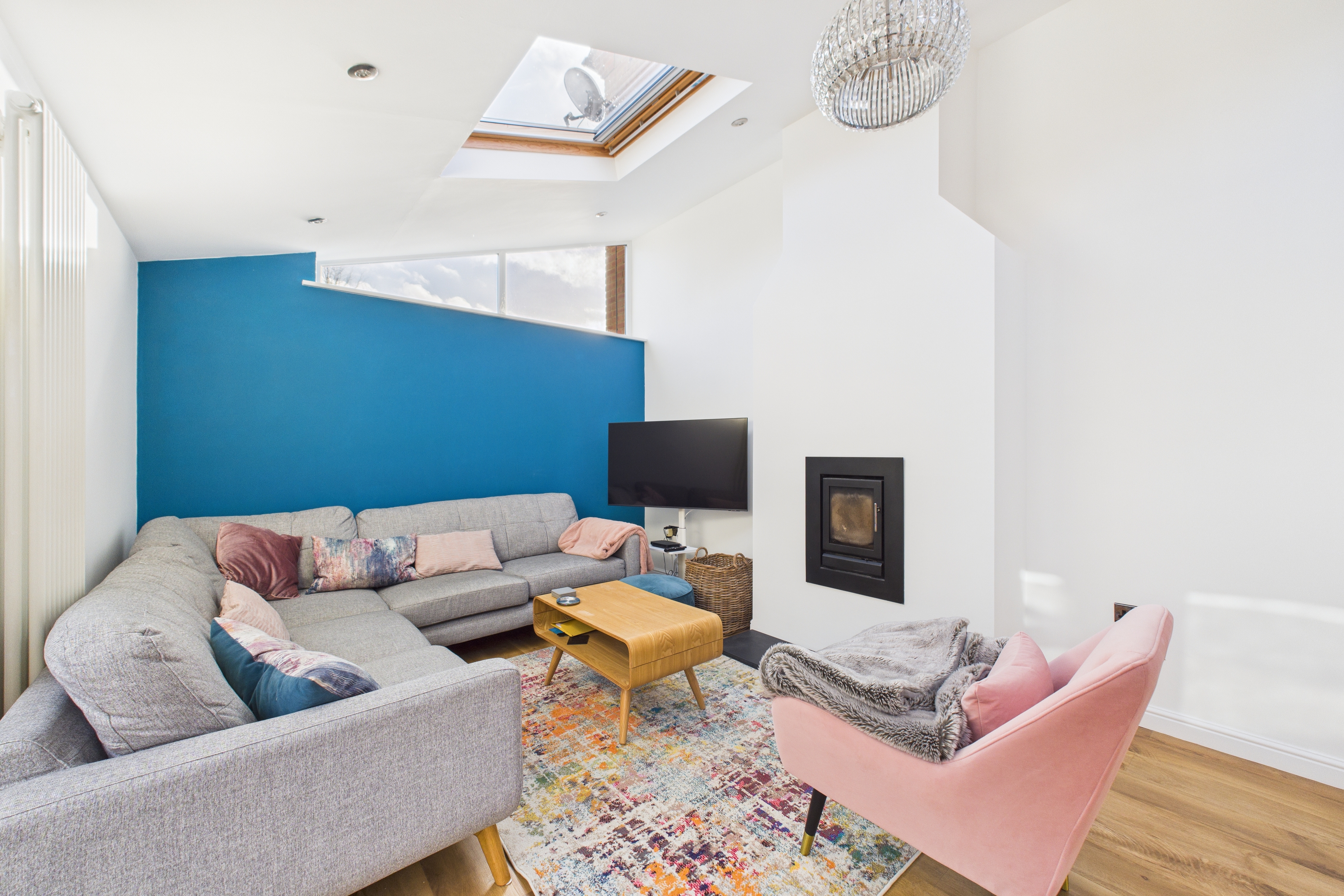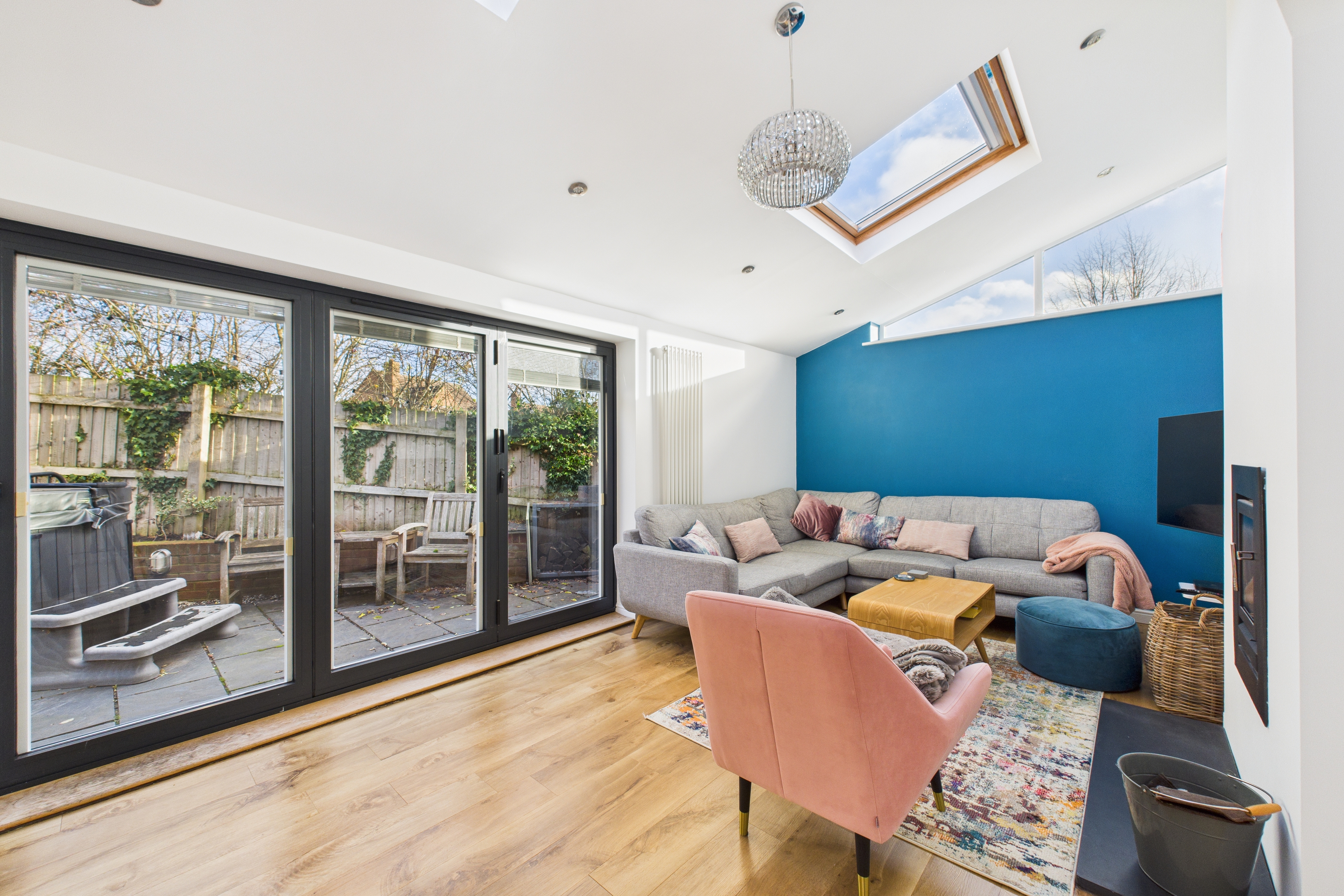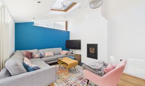 Divided from the dining space by modern internal bi-folding doors, the second lounge or reception room provides a comfortable and stylish retreat. With its integrated log burner, skylights, spotlights and bi-folding doors to the garden, this space is both inviting and functional, ideal for family living.