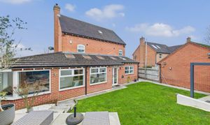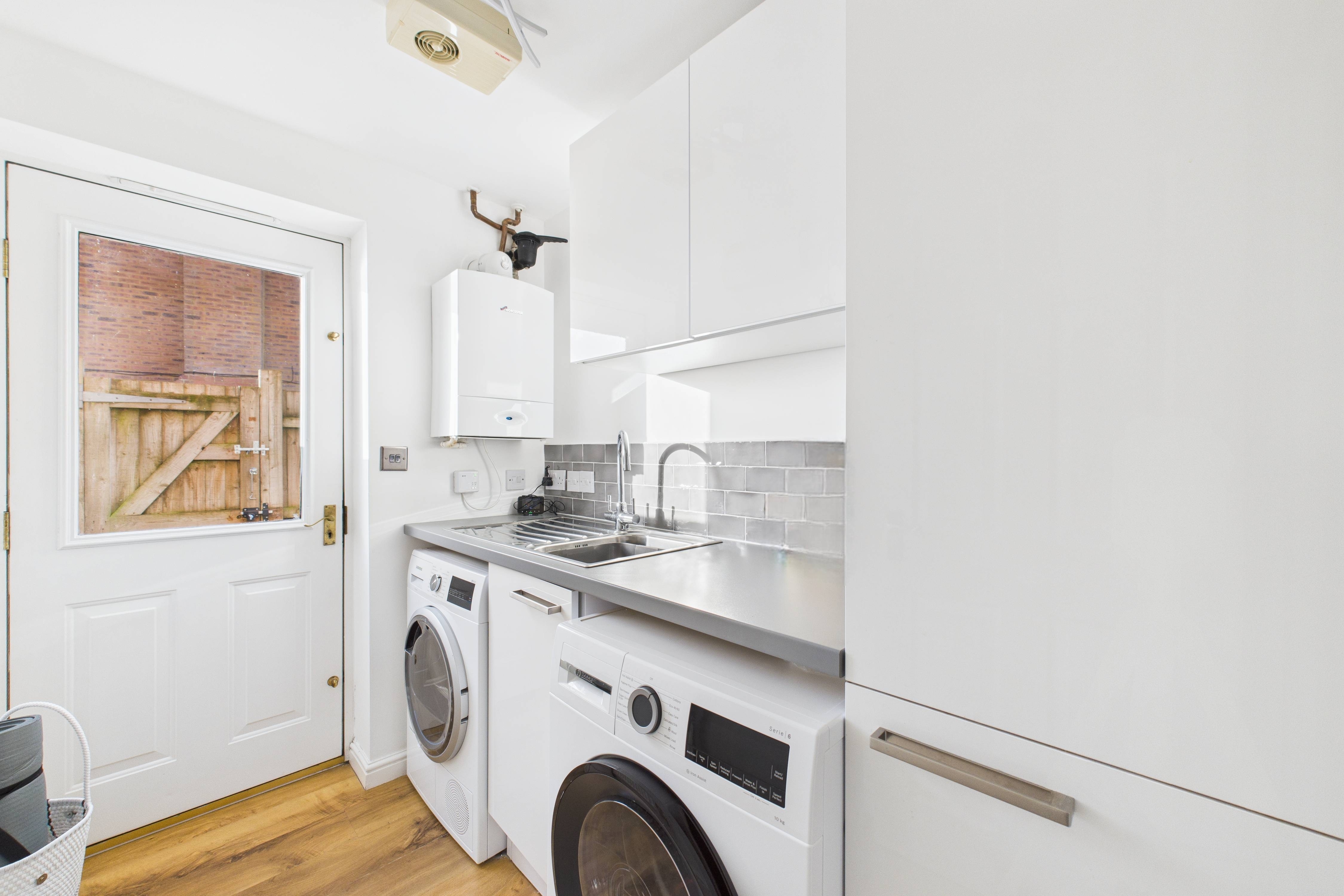 A separate utility room adds further practicality with additional storage, space for appliances, a second sink, tiled splashbacks and garden access.