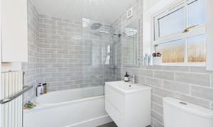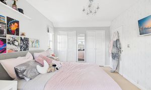 The first floor hosts three well-appointed bedrooms. Two are generous doubles, each with built-in wardrobes and sleek en-suite bathrooms. The third is a versatile single bedroom, ideal as a nursery or a second study.