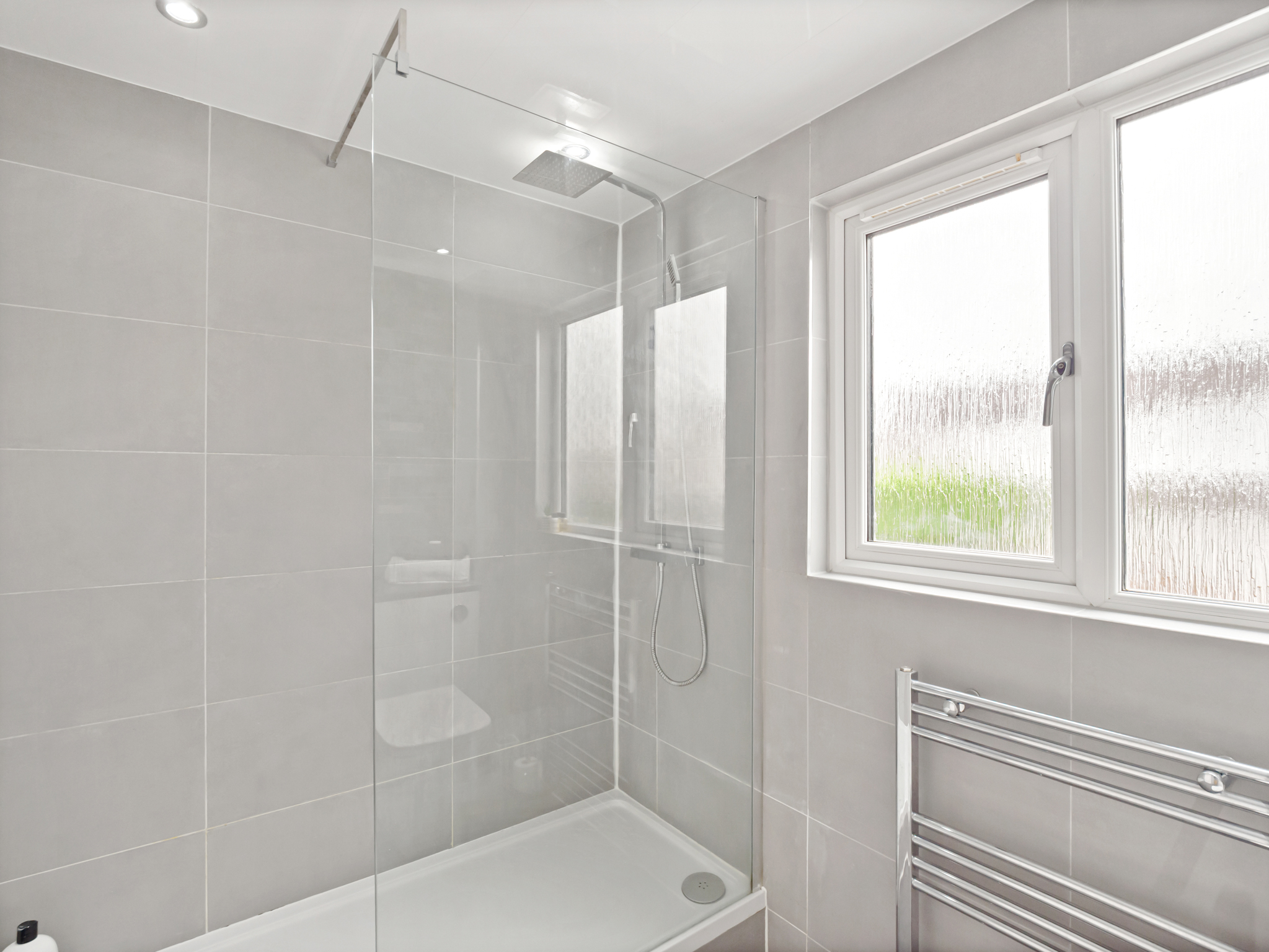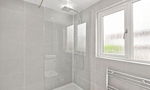 A freshly renovated bathroom featuring a walk-in shower and a smart mirror, offering a sleek and modern finish. The room is fully tiled throughout with contemporary fittings, creating a clean and stylish look. A window overlooking the rear of the property with a privacy panel ensures natural light while maintaining discretion, making this a bright and functional space.